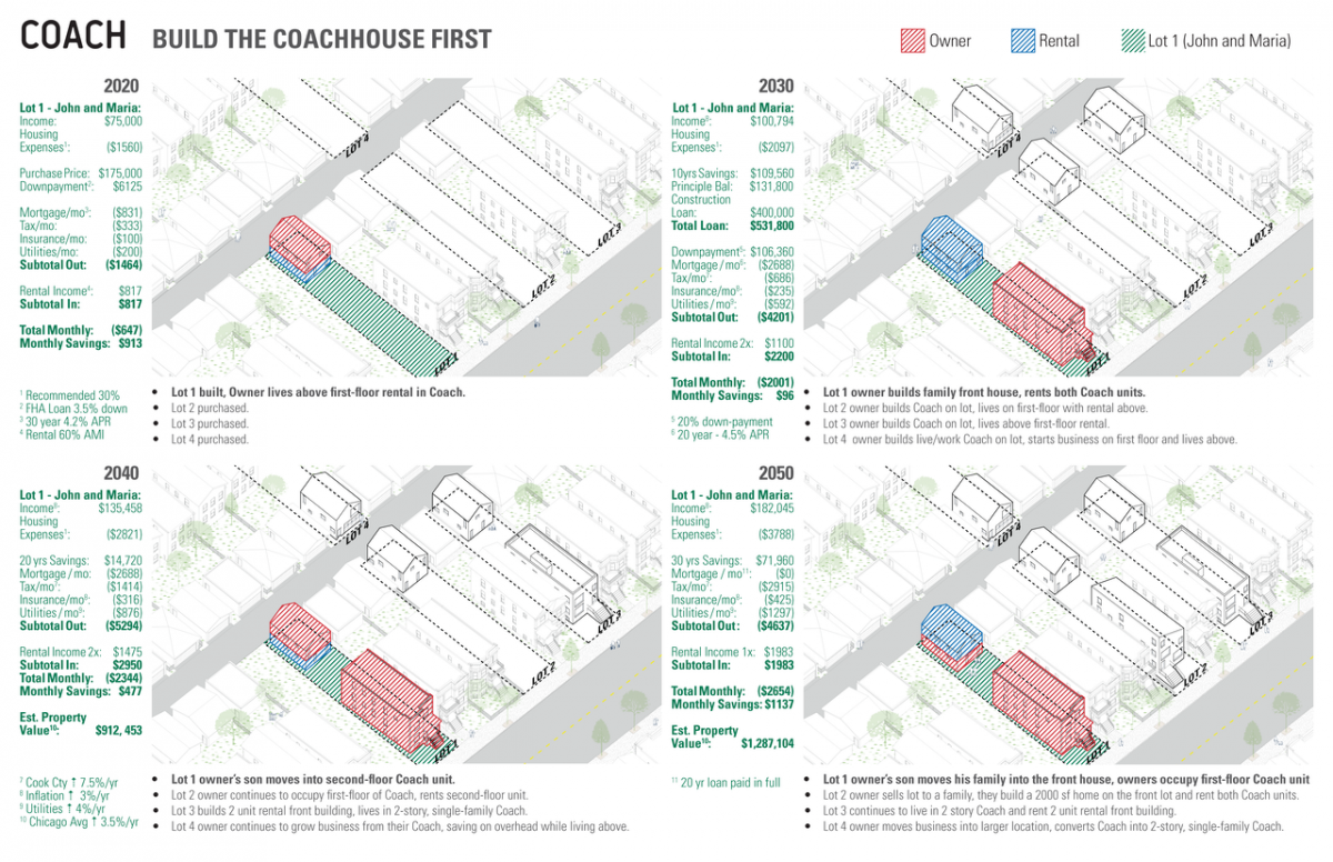To fully explore the wide scope of possibilities of Coach, imagine Bronzeville residents John, a graphic designer, and his new wife Maria, an elementary school teacher. Both are only a few years into their careers and are still saddled with student loan debt. Growing tired of increasing apartment rent, they are interested in becoming homeowners but are struggling to find something that they can afford in the neighborhood. This is where Coach comes in. John and Maria decide to buy an empty lot and build a coach house first using apprenticed construction labor — the $175,000 investment requires a downpayment of $6,125.