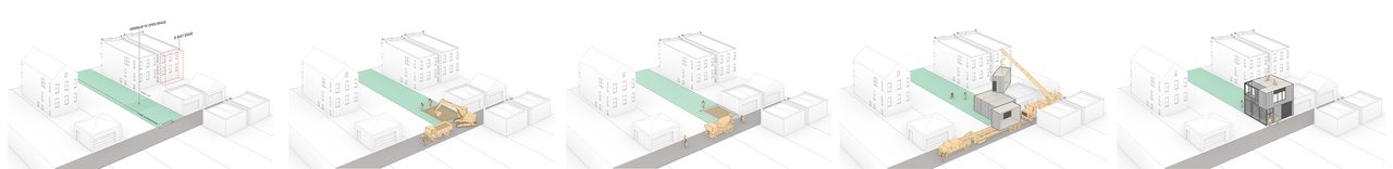 We’ve built upon the historical configuration of ADUs to create “Coach,” a modern day implementation plan. Coach is a powerful tool to increase wealth for homeowners. The basic premise is this: Coach will provide low-cost starter homes that allow a homeowner to build equity, generate income on site, and age in place. Coach proposes a phased investment in a typical Chicago lot where the coach house gets built first. Under current zoning this is not possible; the primary building on a site must be built first. The Coach proposal aims to reduce the initial cost of the home to be affordable ($175,000). This will be achieved by two factors: a small building footprint which reduces the amount of material, systems, and labor required, and the use of apprenticed construction labor. The average footprint of a Coach house is just over 525 square feet, with a total area of 1,050 square feet across two floors. Offering construction training will not only lower the labor cost through potential DIY savings, it also creates opportunities for local residents to learn skills and fill these good-paying jobs while addressing the shortage of skilled labor in the construction industry. This low initial investment allows new homeowners to own a piece of property they gradually expand to include rental units for supplemental income.