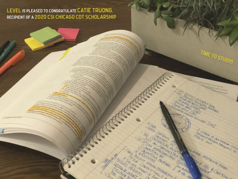 Congrats to Level’s very own Catie Truong for receiving a 2020 CSI Chicago CDT Scholarship! Catie was chosen from a pool of applicants to be supported by CSI to study to be certified in Construction Document Technology (CDT). The scholarship includes reimbursement for the exam expense, study guides, a 12-night exam study class, and CSI membership for one year. The knowledge gained through this process will benefit all of Level’s projects. Way to go, Catie! And thank you CSI (Construction Specification Institute)!
