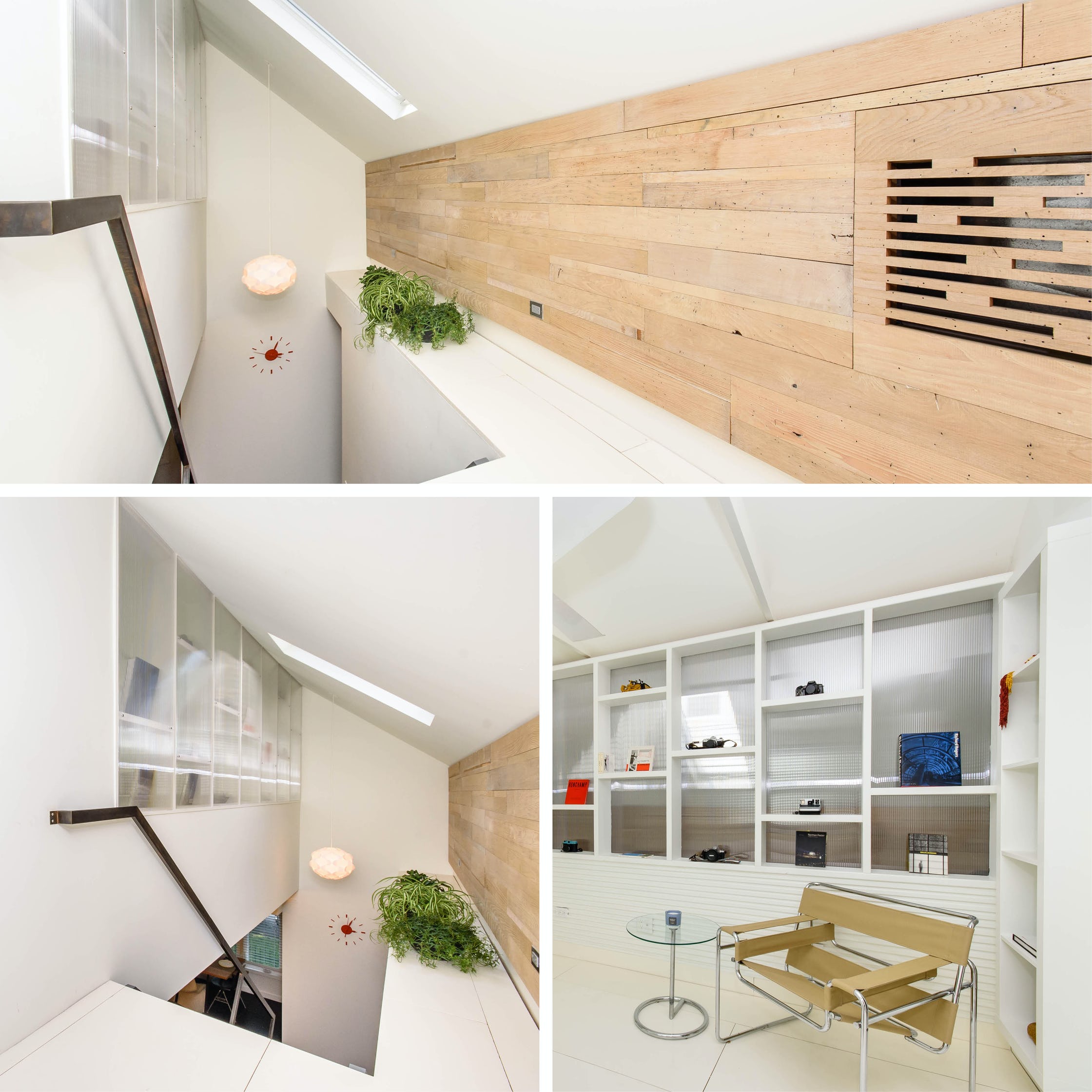 I had originally conceived this as fully open from the guest room to the stair, but was quickly informed by my wife that some privacy might be appreciated by the guests. The wall is framed with conventional painted 2x8’s, and the 2x8’s on the stair side are clad with polycarbonate. The grooved wood below the shelving and the pickled wormy chestnut to the right of the stair were both salvaged from a mid-century modern rehab project in Wilmette. I worked as the designer and the carpenter on this project. - Greg