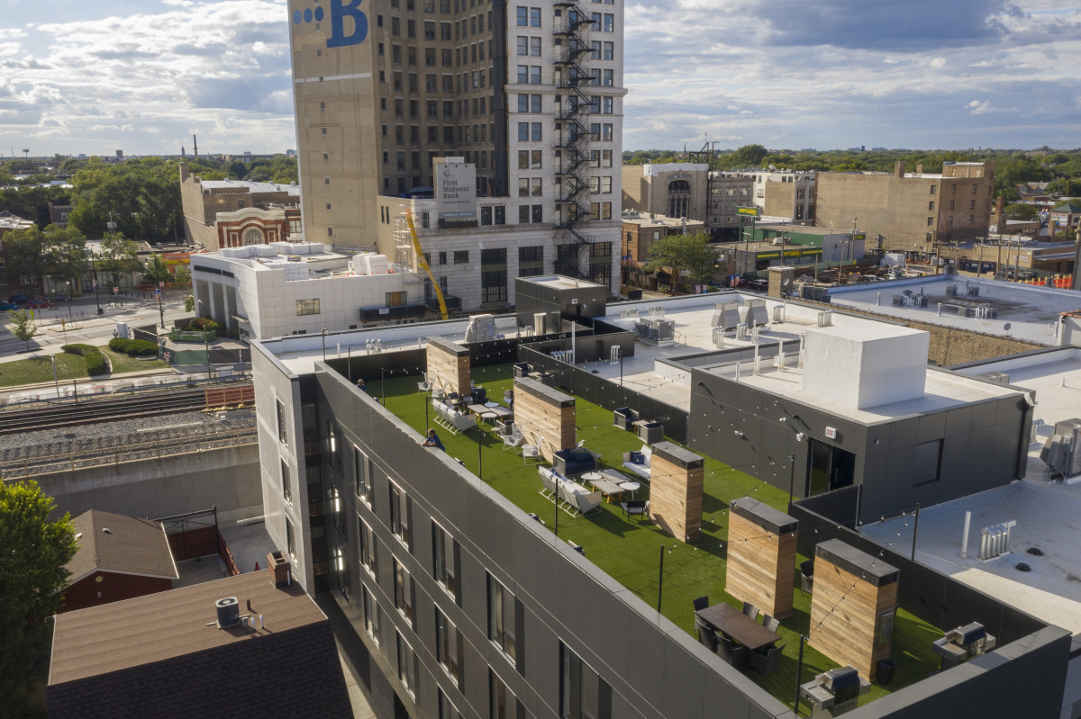 The roof amenity offers views to downtown Chicago and glimpses of Lake Michigan, as well as generous lounging and grilling areas for tenants.