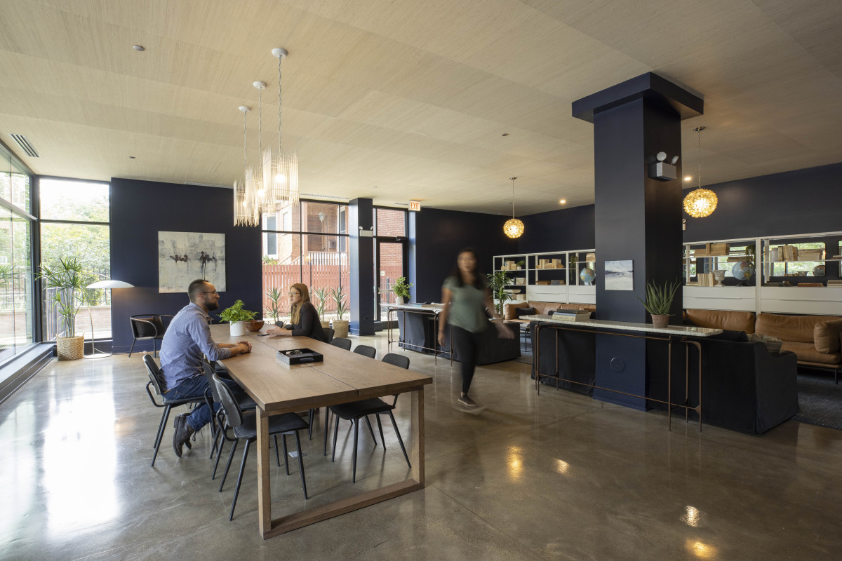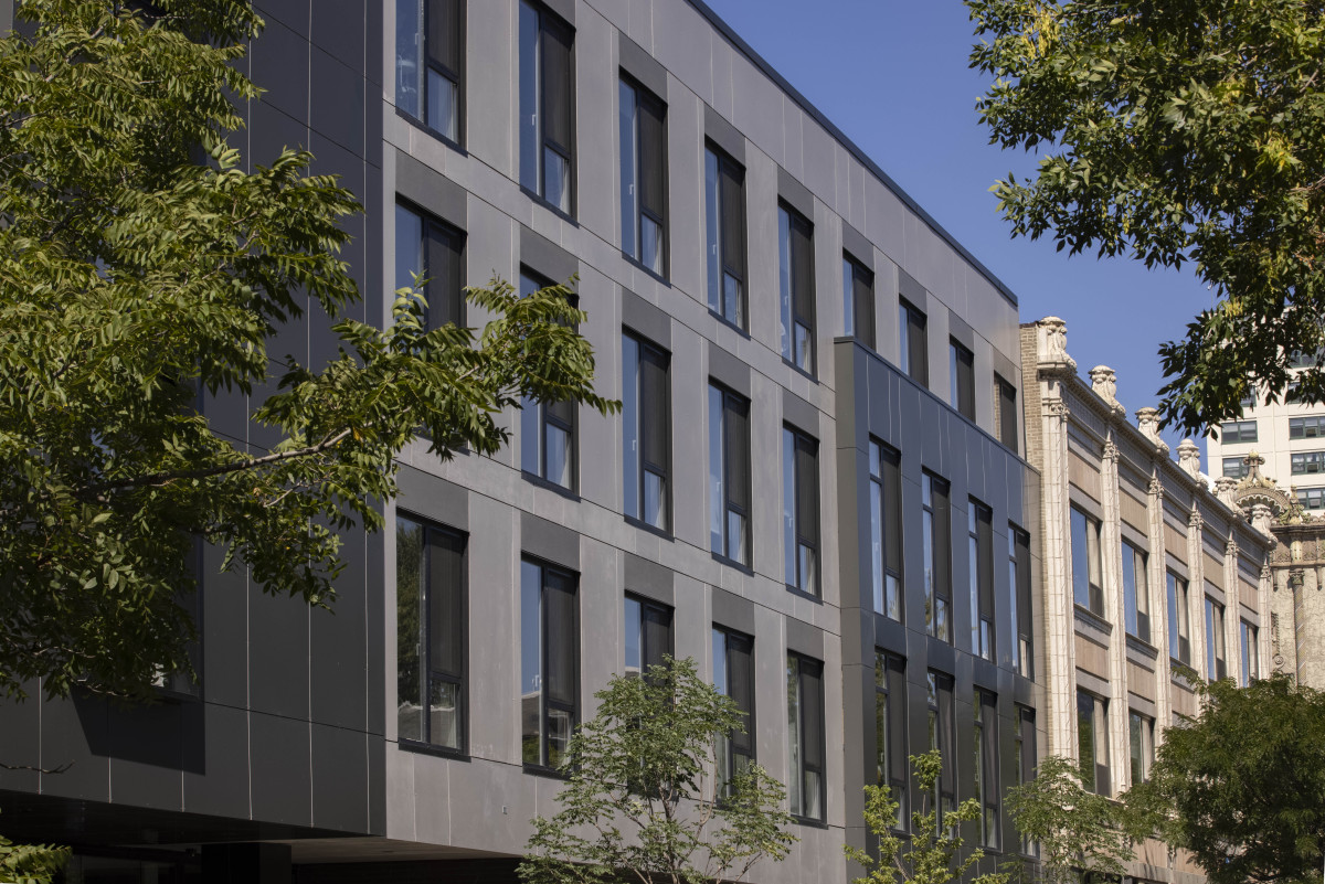 While not copying the terra cotta-clad adjacent neighboring mixed-use building, a deliberate attempt to continue the rhythm and scale of the window pattern establishes continuity of the street wall on Winthrop Avenue.