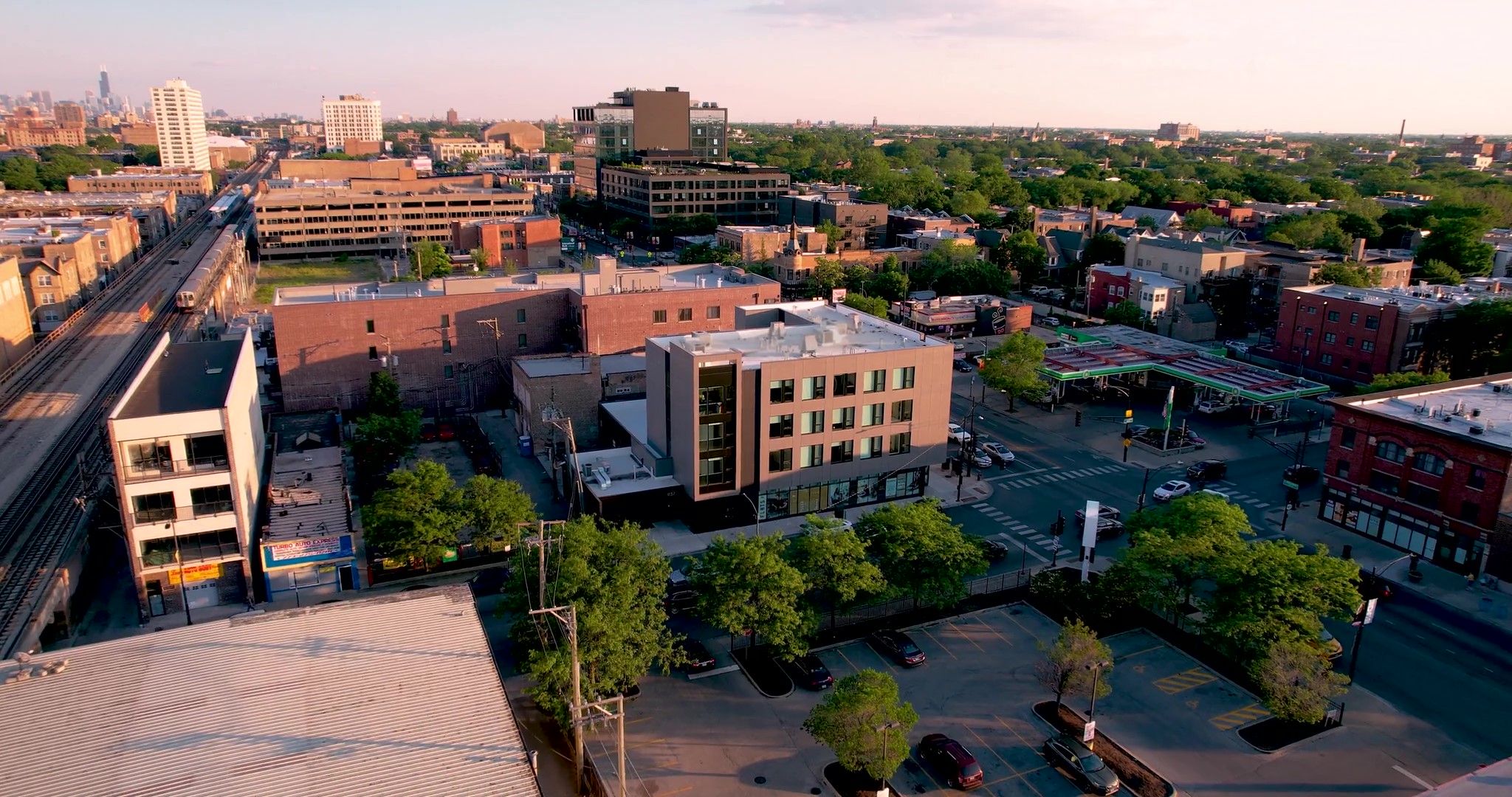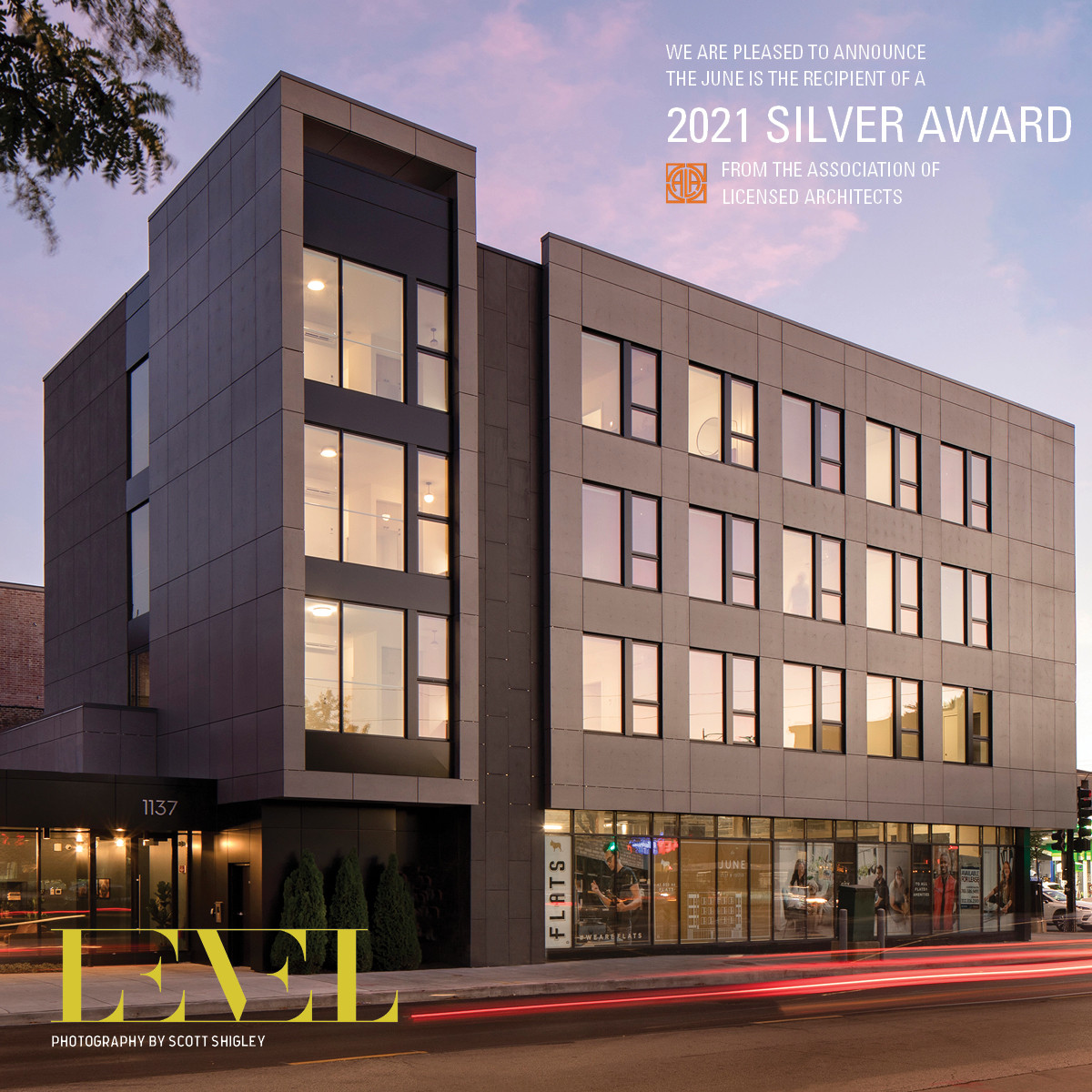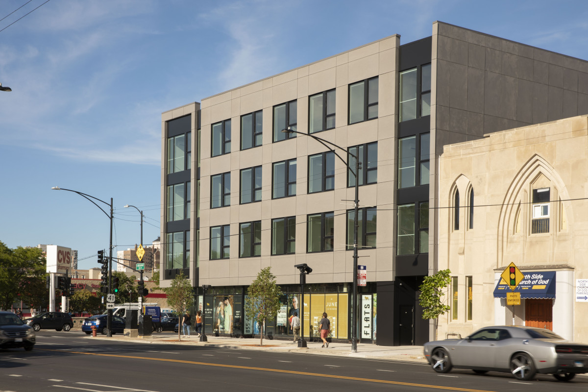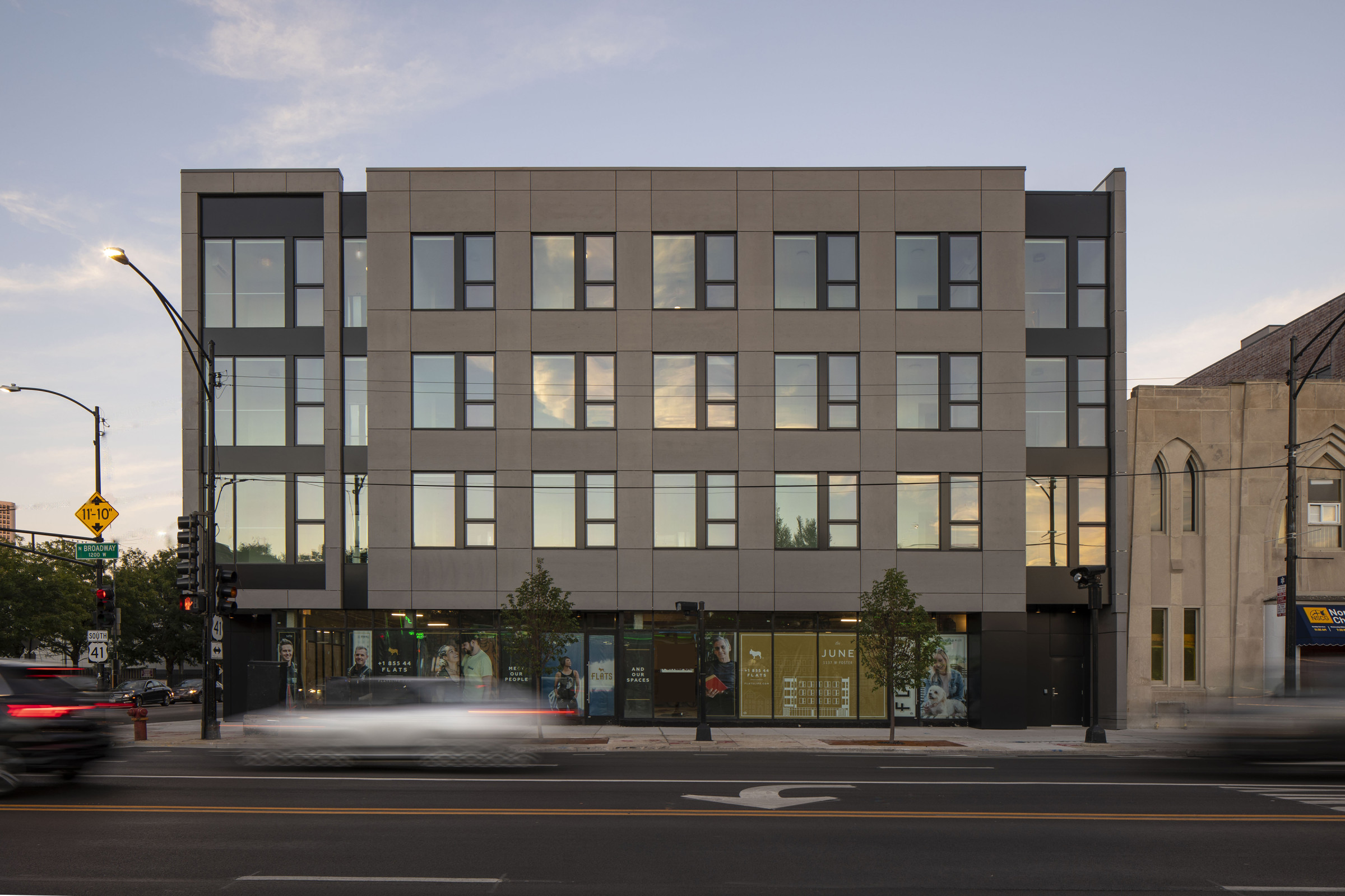 The June is a mixed-use development, located in Chicago’s Uptown neighborhood on the bustling corner of Foster and Broadway. The lower level offers commercial rental spaces, while the upper floors contain residential units in studio and one-bedroom configurations. The building was a close collaboration with Flats, a development group known for its stylish, high-end residential apartments and attractive amenity packages.