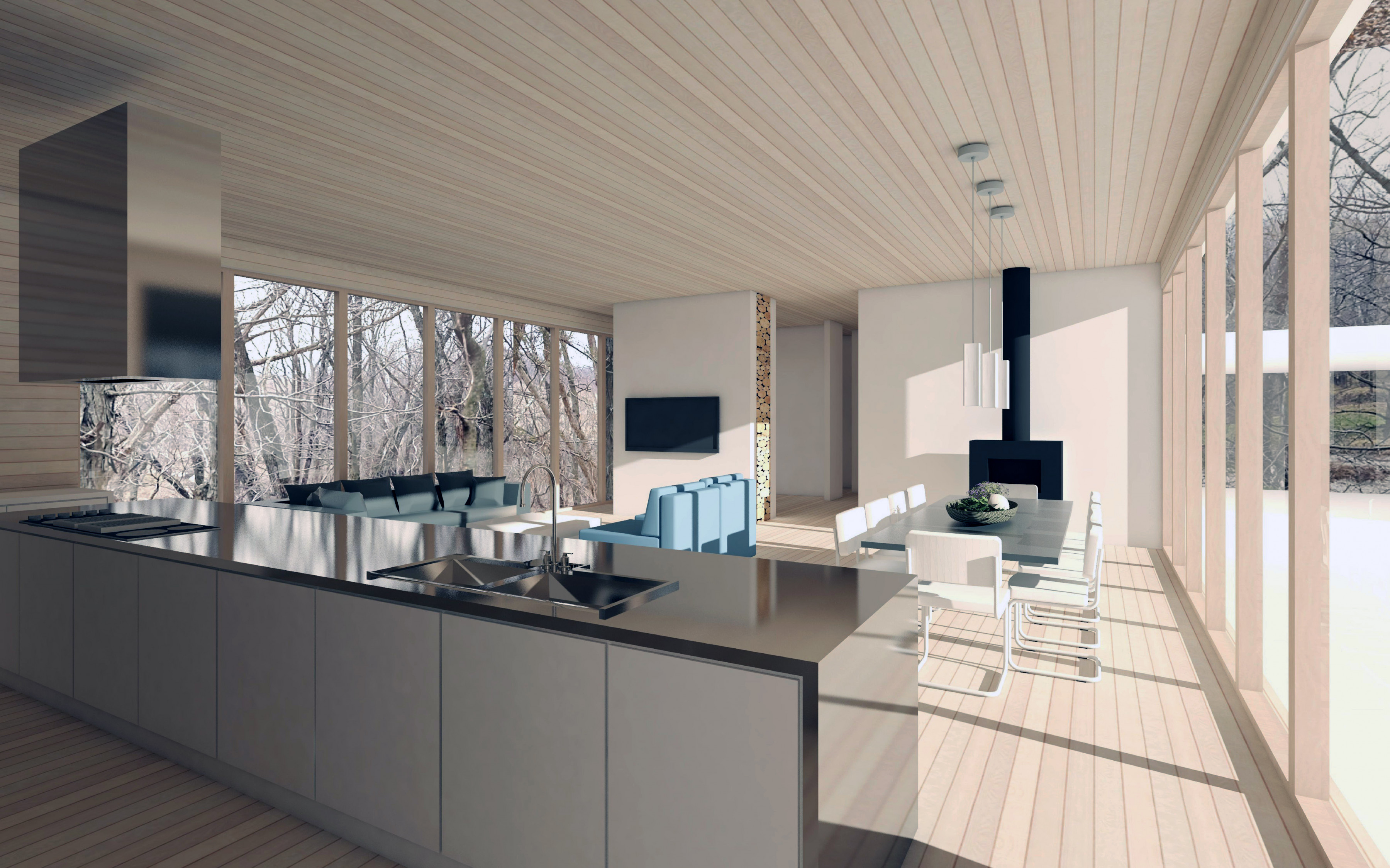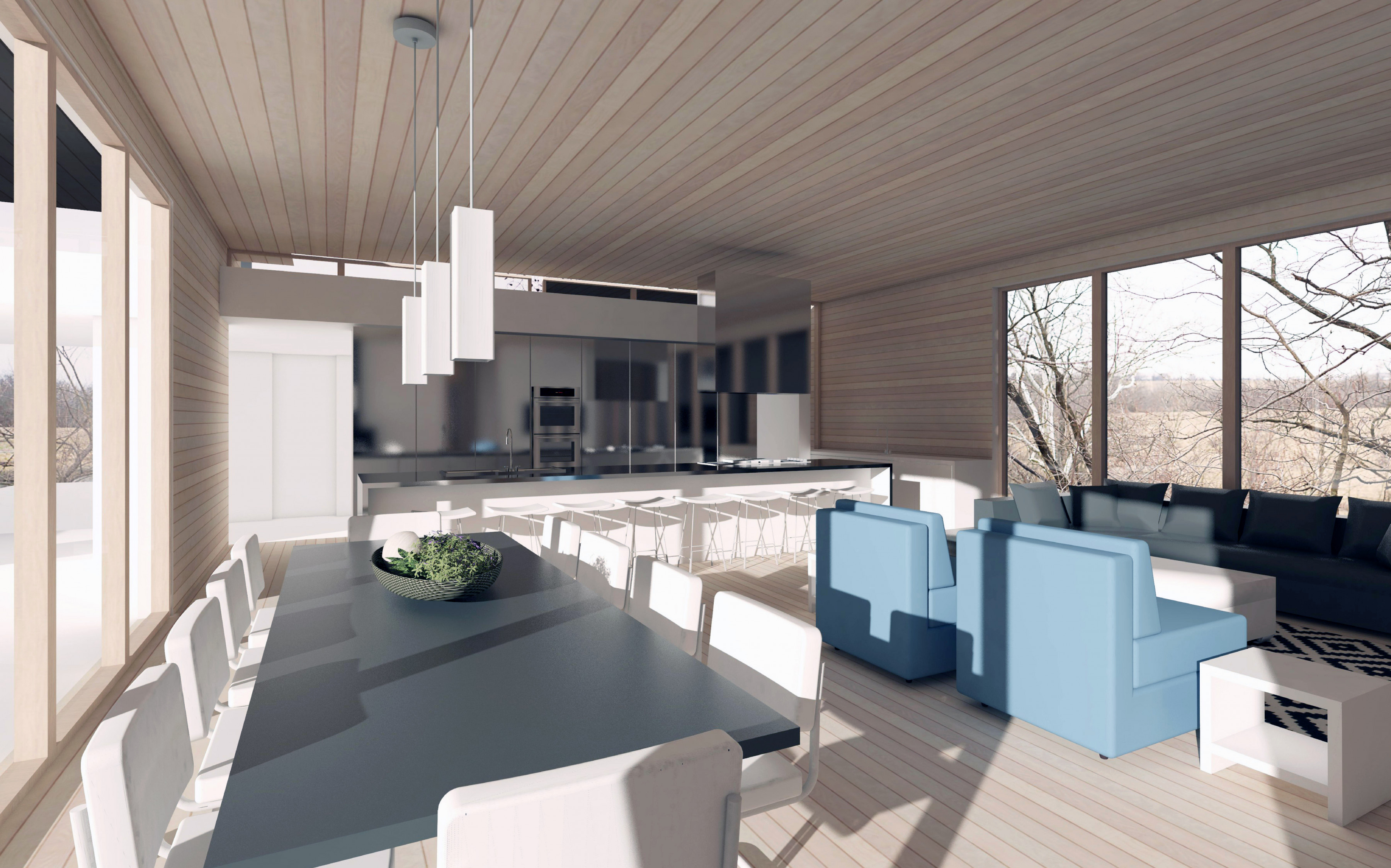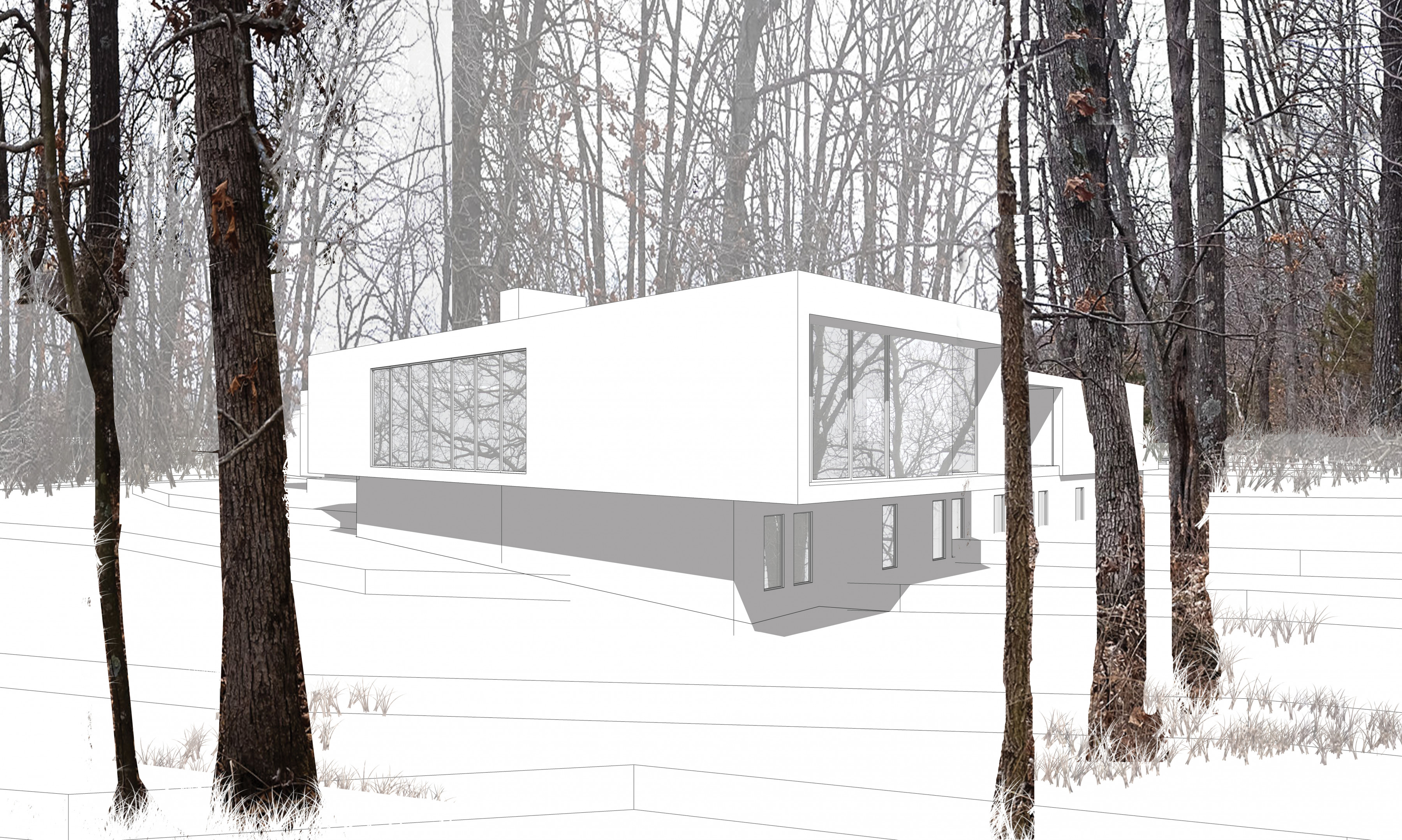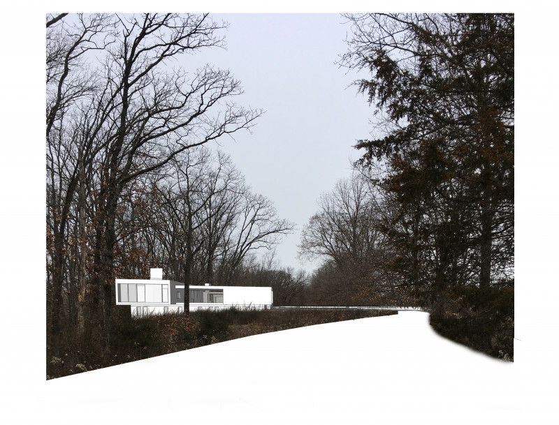 The design team carefully considered the approach to the house: a long, winding road leads past a small pond through a clearing of trees, where the house appears in profile in the distance.