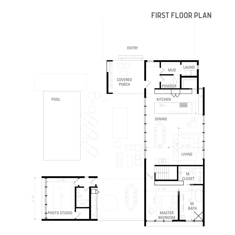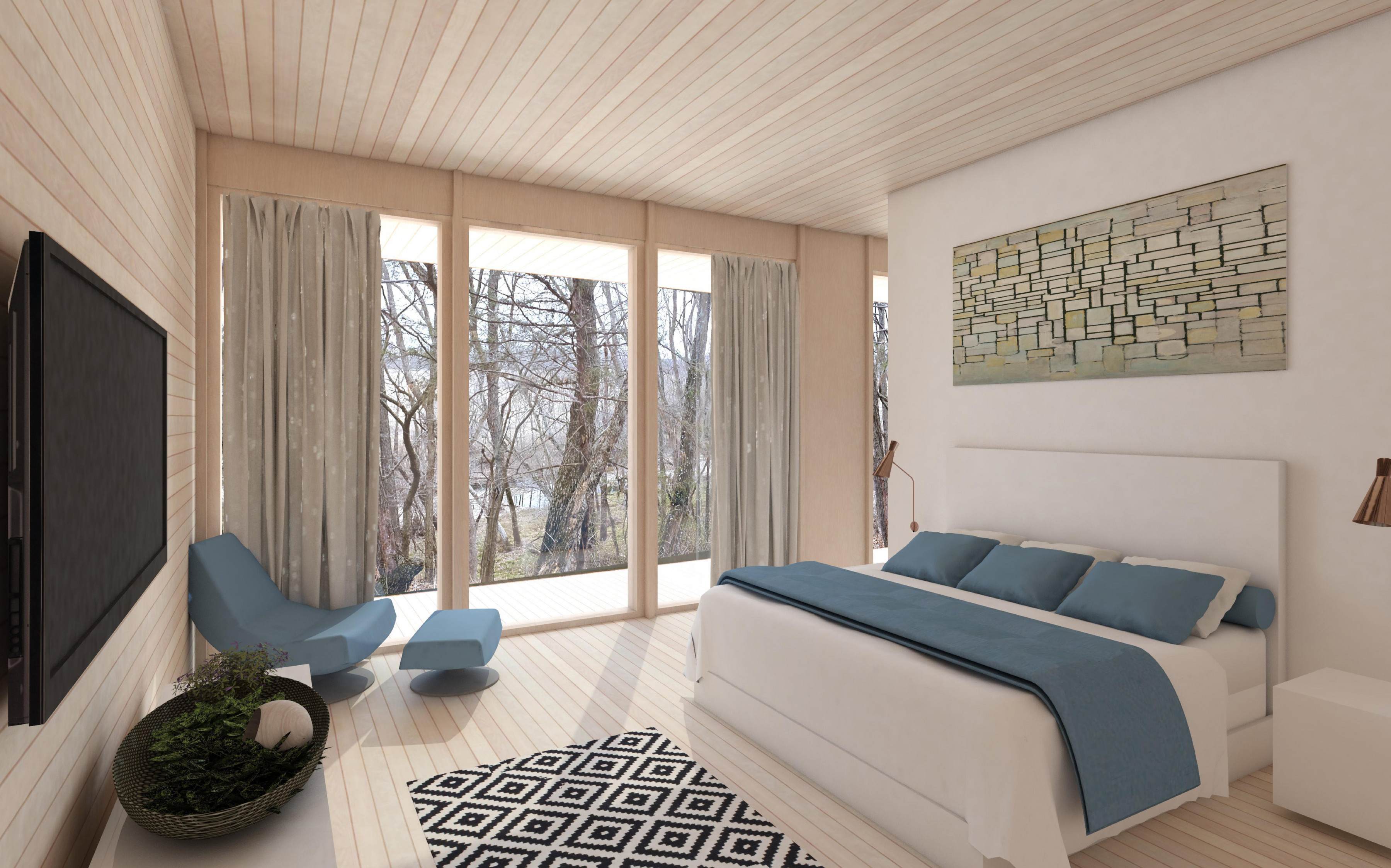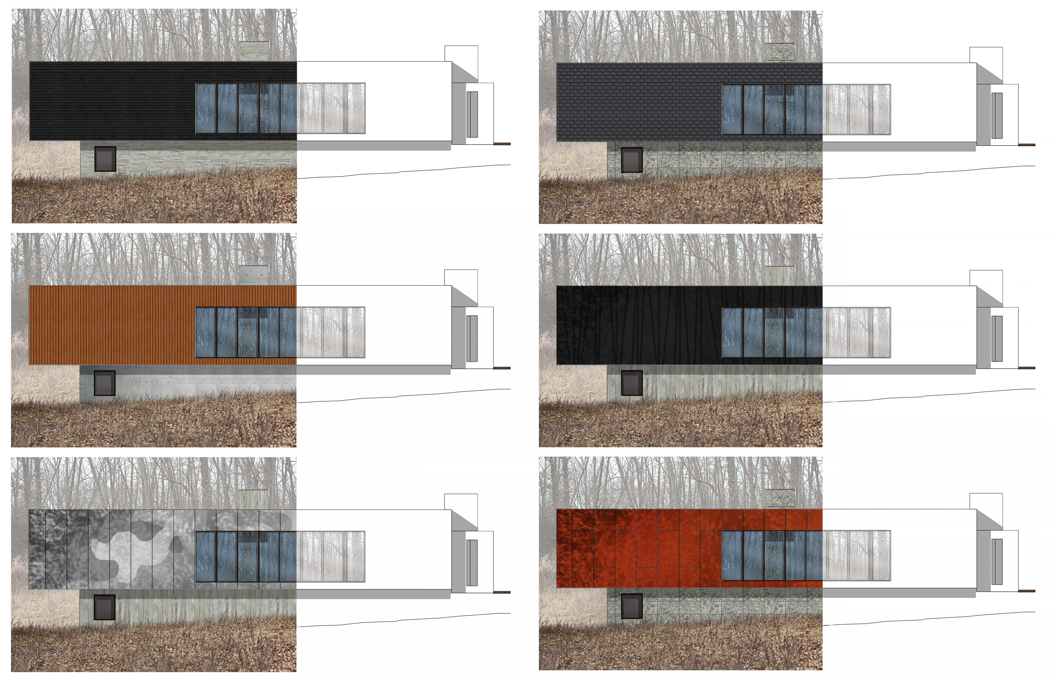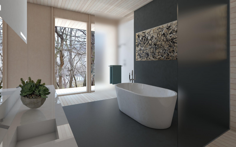 The design team carefully considered the approach to the house: a long, winding road leads past a small pond through a clearing of trees, where the house appears in profile in the distance.