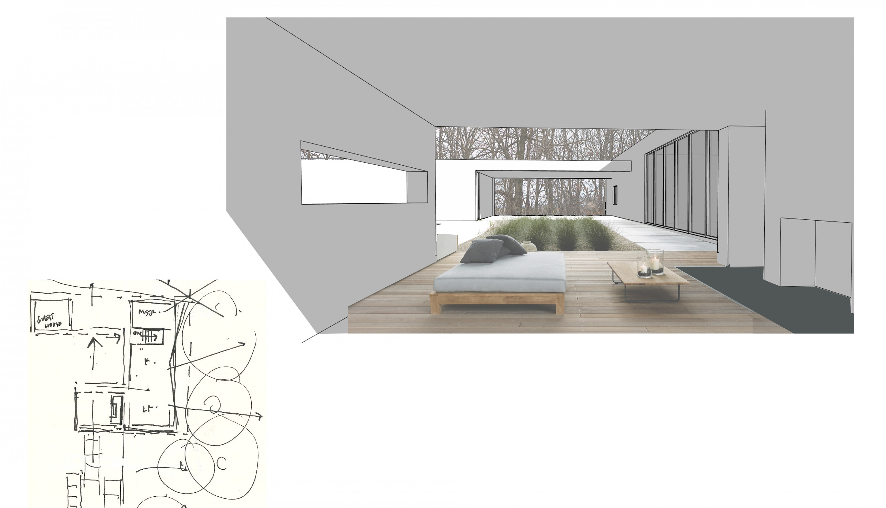 The front porch, while providing protection from sun and rain, is designed as a frame and is repeated at the opposite end of the courtyard, highlighting the view through the trees to the horizon beyond.