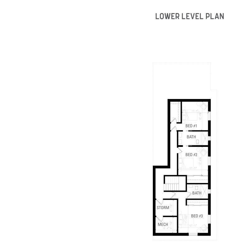 The house is situated on the top of a ravine, affording views to the river below. The main living floor hovers above the lower level, which contains most of the bedrooms.