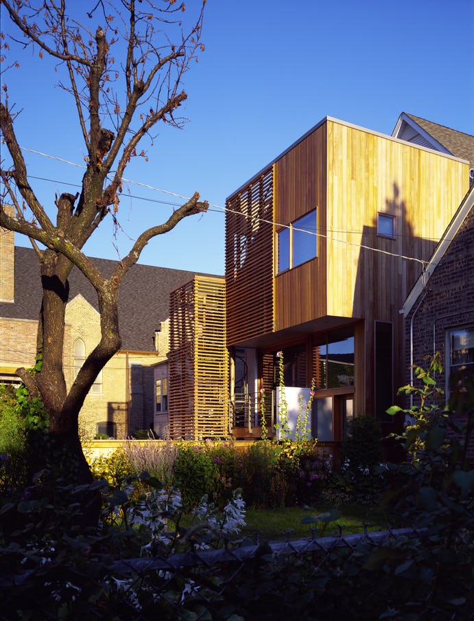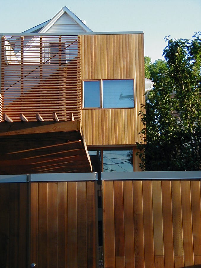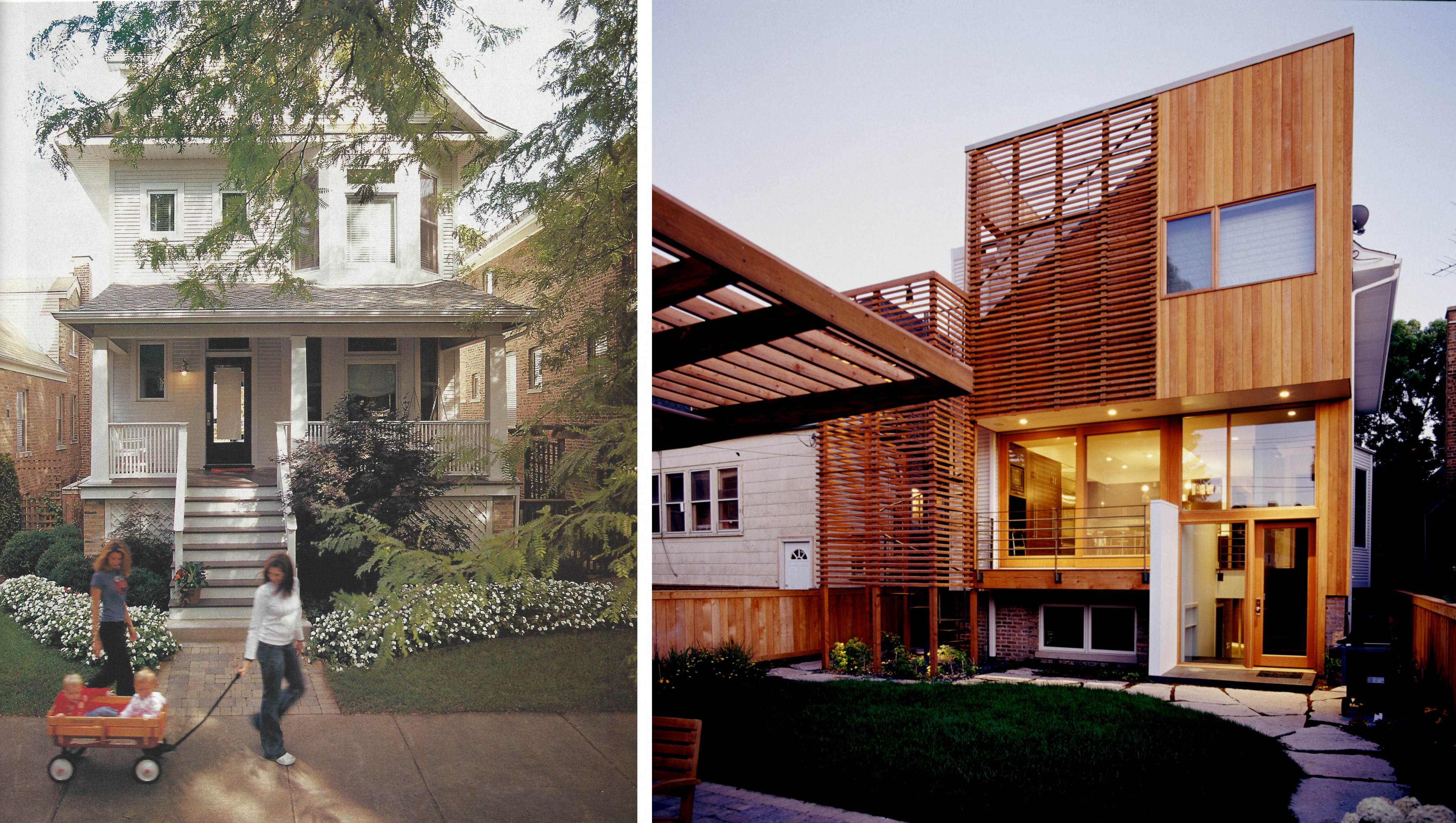 A complete renovation of a single-family home for a family with young children, this project was designed with two distinct façades for both the public street and the private rear yard. Cedar siding at the garage, fences, and the back half of the house tie the composition together materially.