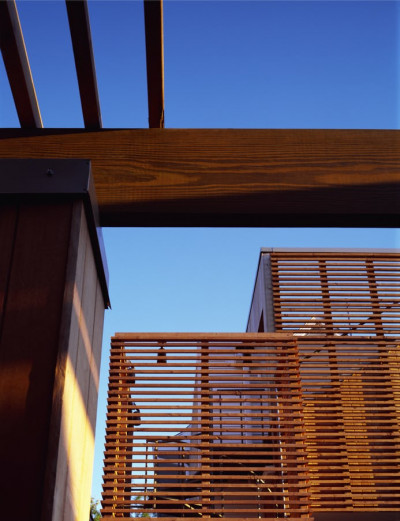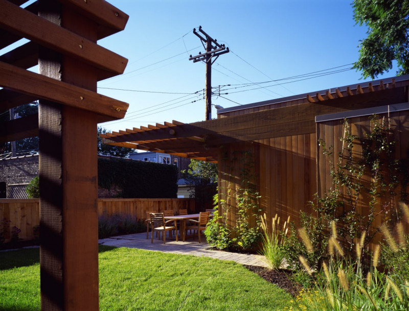 In lieu of a two-car garage that would occupy most of the back yard, the owners elected to build a single car garage, which is enclosed, and a covered carport. When the second parking space is not needed, or the car is parked on the street, the open space can be used for play, outdoor dining, and entertaining.