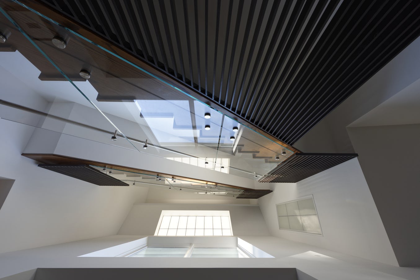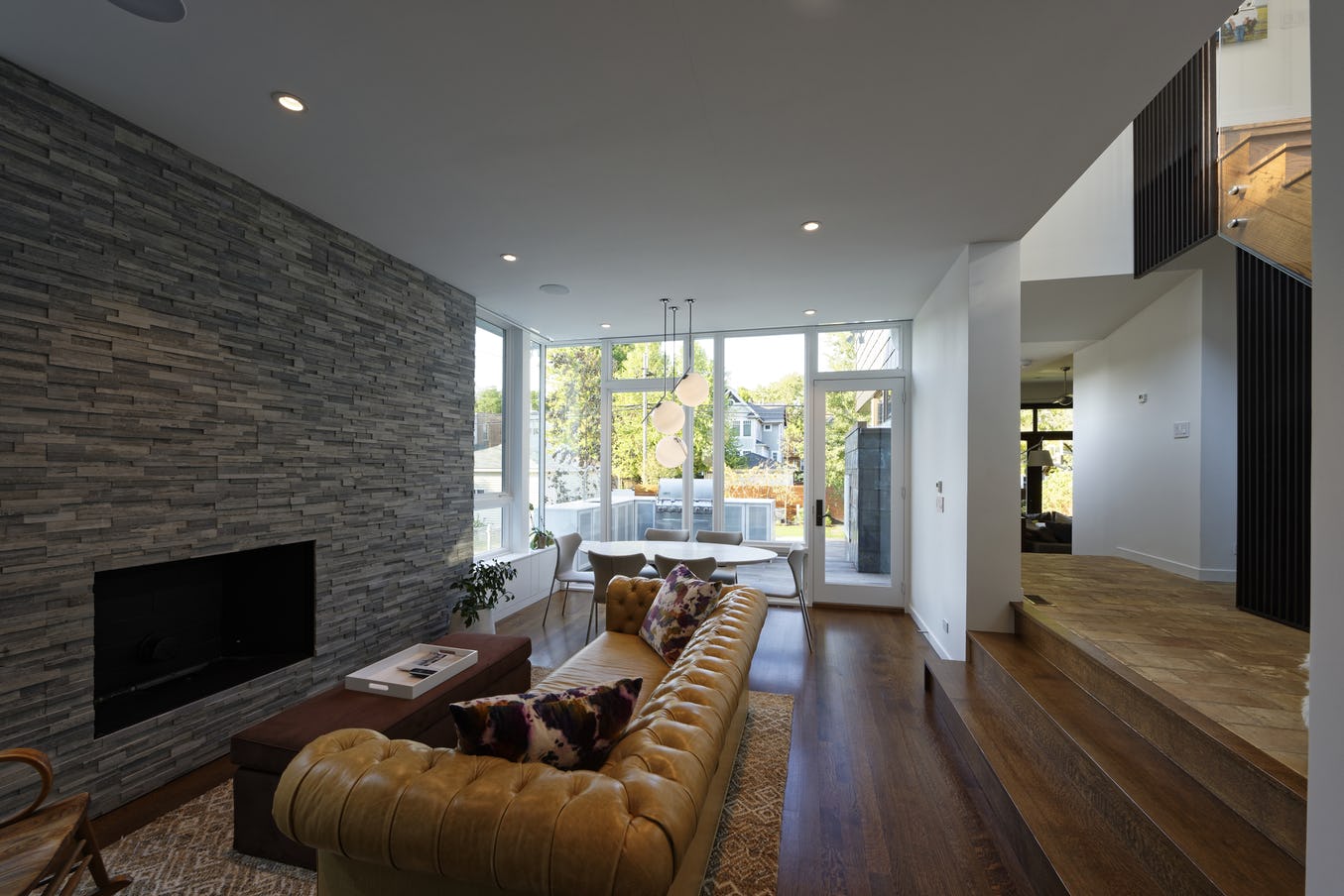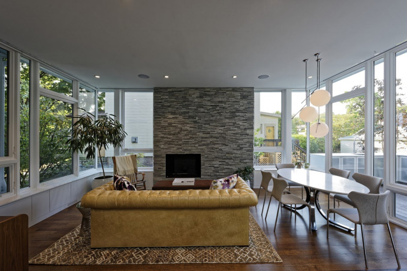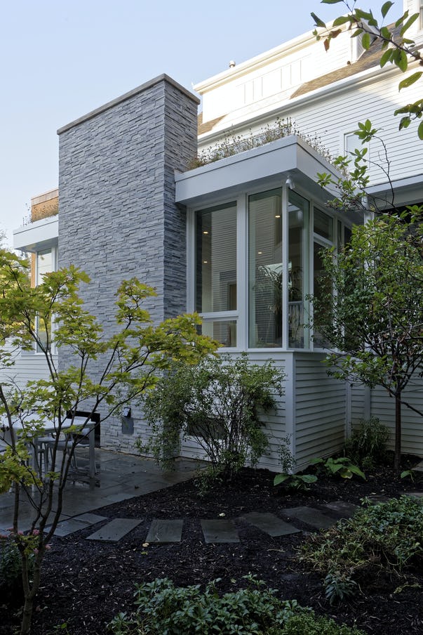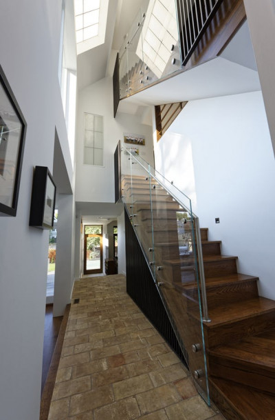 Inside the original house, an existing stair was renovated with glass and steel railings. The two-story open stair looks out onto the planted sunroom roof.