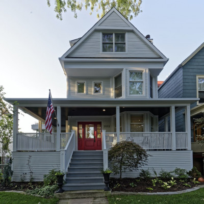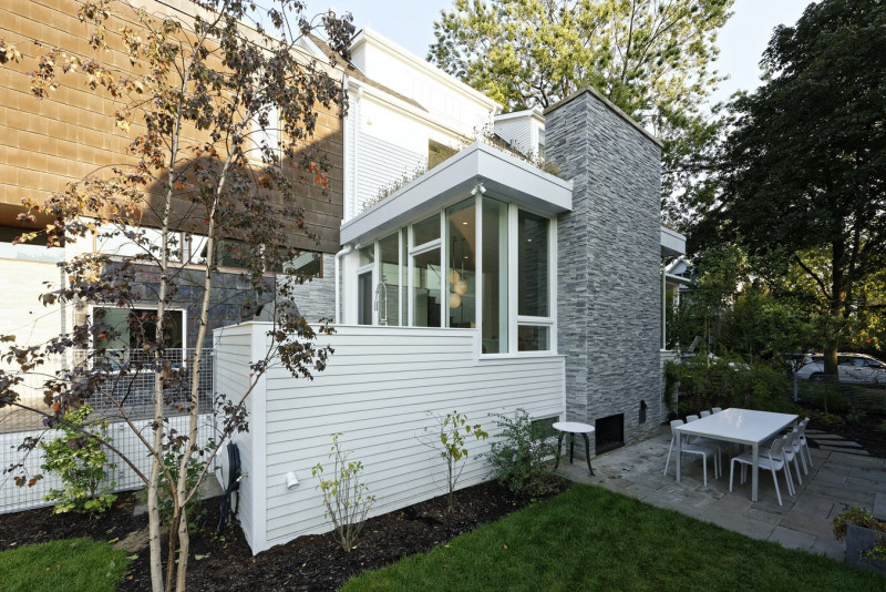 This project takes advantage of a site with a feature very unique to Chicago: width. An extra-wide lot allows for this modern sunroom addition to be naturally lit from three sides. The addition was designed with a modest footprint in order to maintain a large exterior space used for a garden, play area, and outdoor dining.