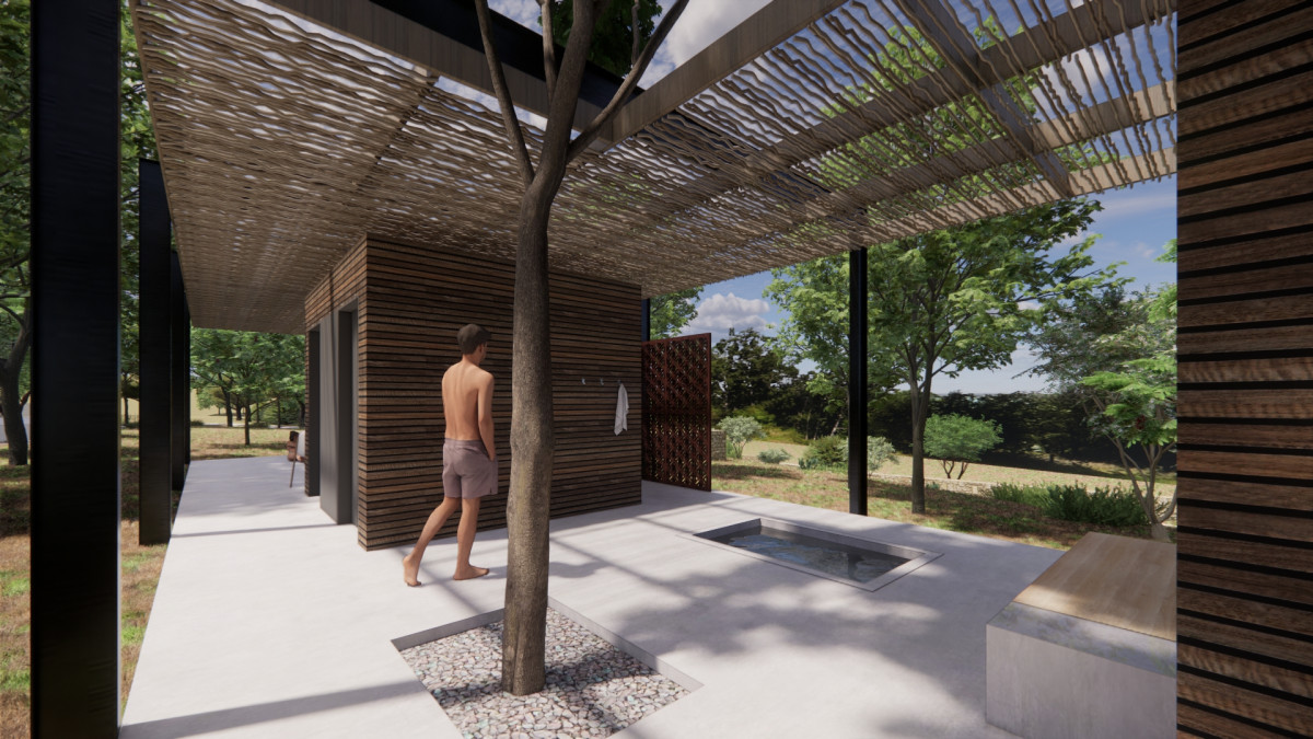 Noria (historically, a hydro-powered waterwheel), is the name of this third building in the Gather portion of the program. It acts as an indoor/outdoor spa and wellness space that looks to create a strong dialogue between nature and building.