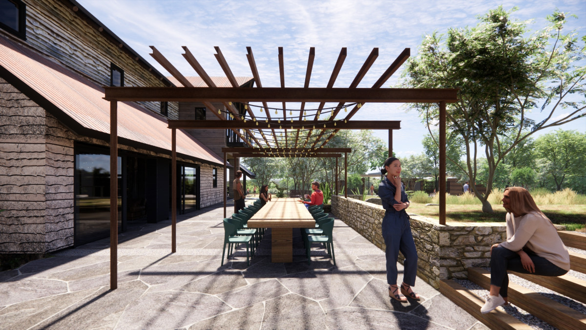 1. Gather: A hub to congregate, dine, and unwind. This is the area around an existing Pole Barn, which will be repurposed as the entry welcoming house. The entry to the Pole Barn is supported by Jac, a service building, and Noria, a wellness/spa pavilion.