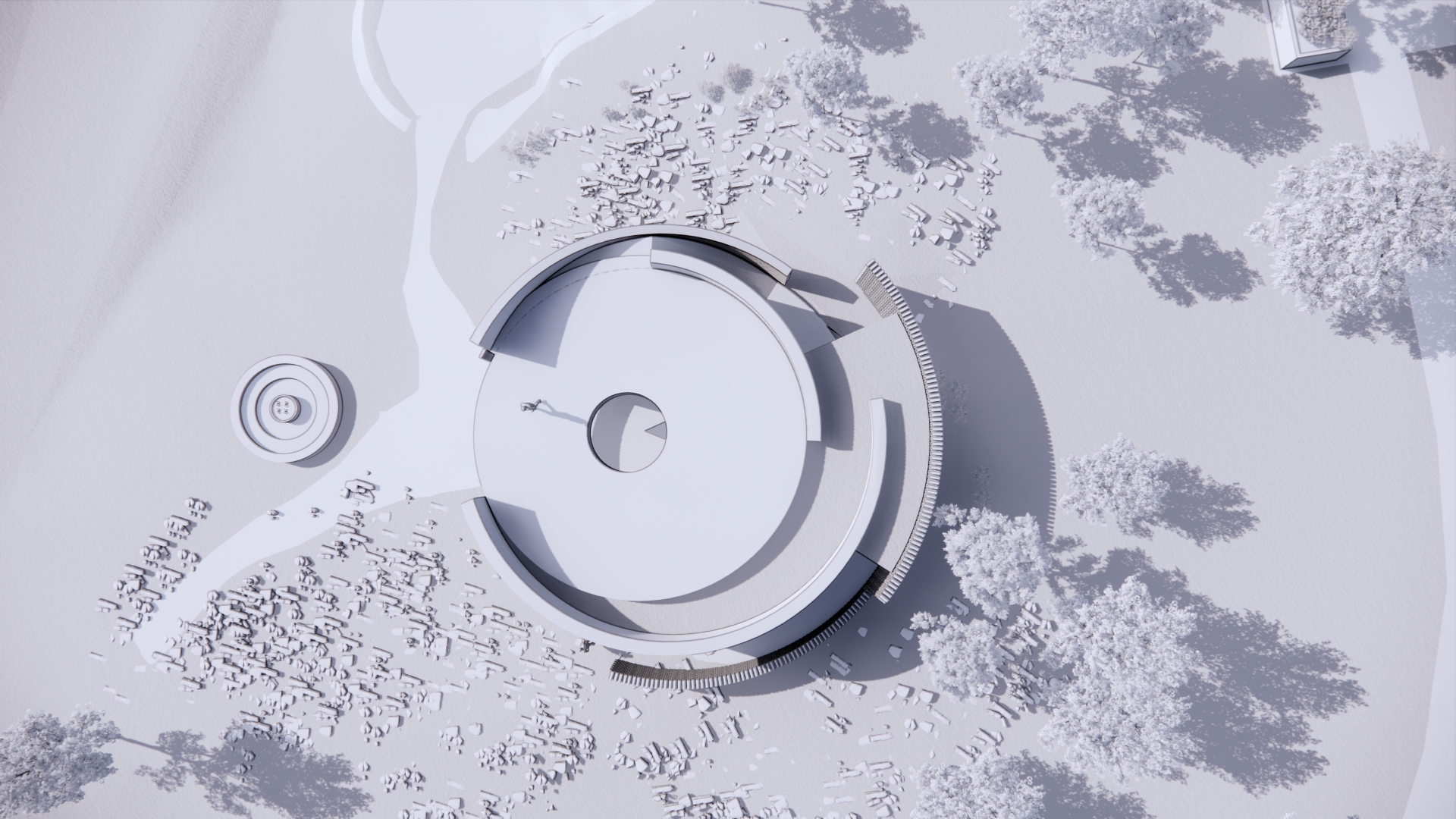 A bird's eye view of the masterplan. The buildings are situated to keep site features intact and nestle into wooded areas. The barn is the hub of activity, surrounded by terraces, Jac, a grilling station, and a multi-functional lawn. Noria and the Ritual building are not far from this central hub. The Stables, which provide visitors' quarters, are set to the north in a clearing, distant enough to provide some privacy and separation.