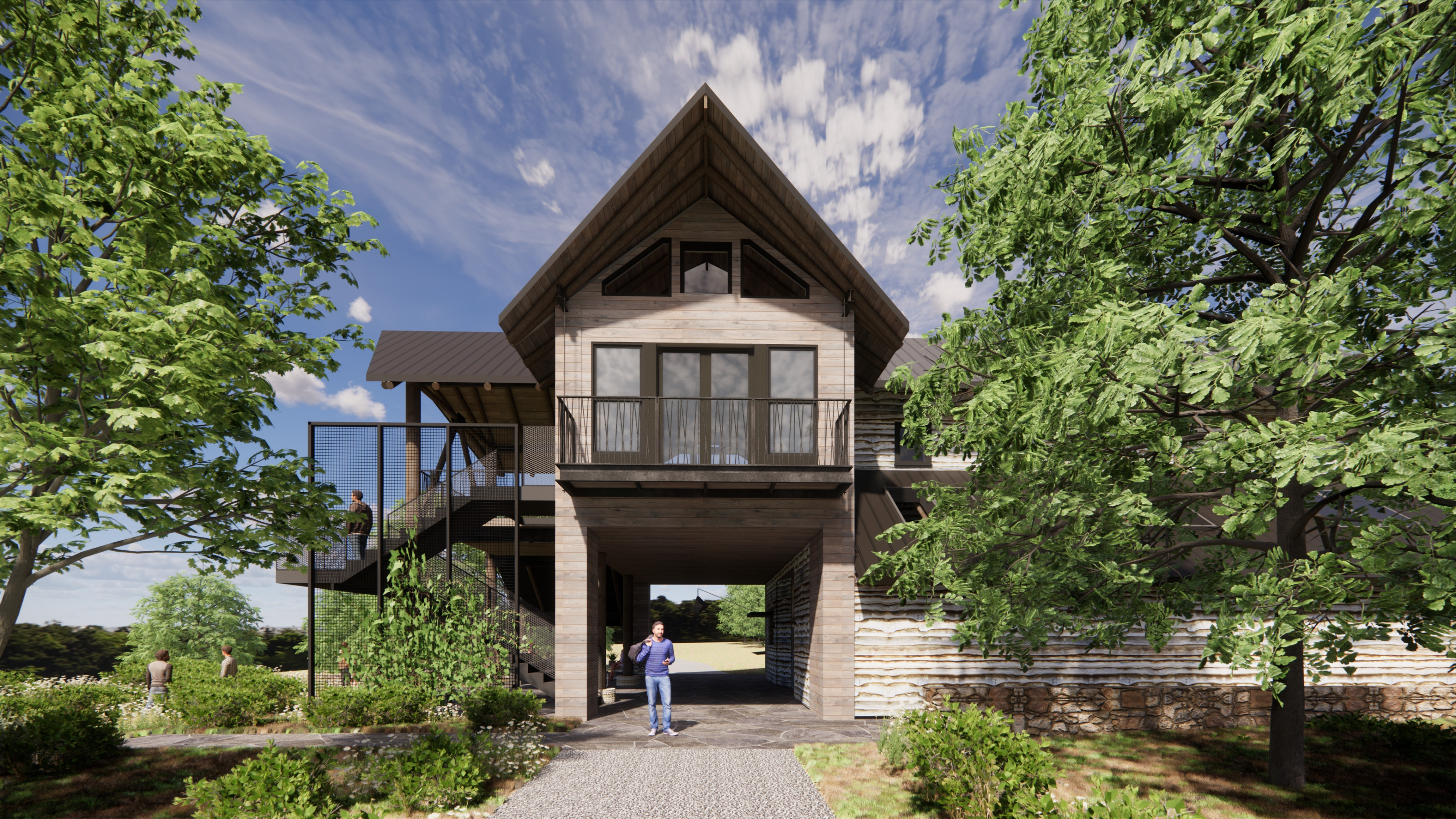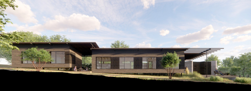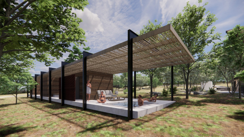 2. Rest: Consists of private resting bunkhouses for guests. Called The Stables, these bunkhouses nest along the edge of a tree line overlooking a natural prairie on the site. This area is intended to provide an intimate level of privacy yet feel totally connected to the rest of the site and nature.