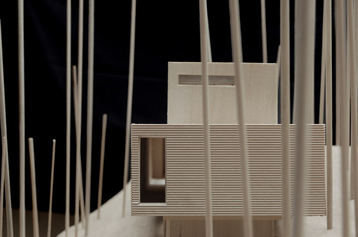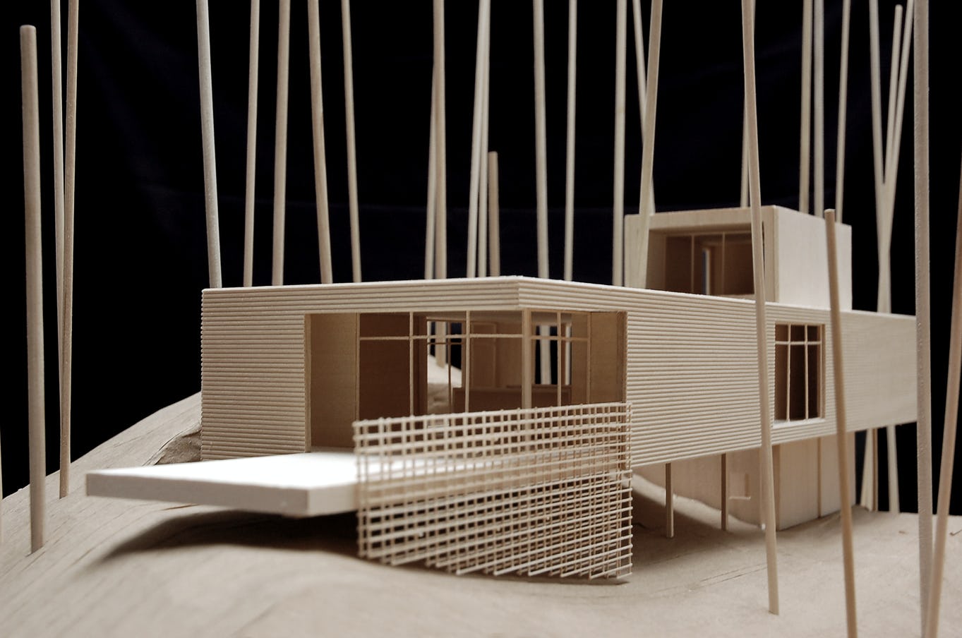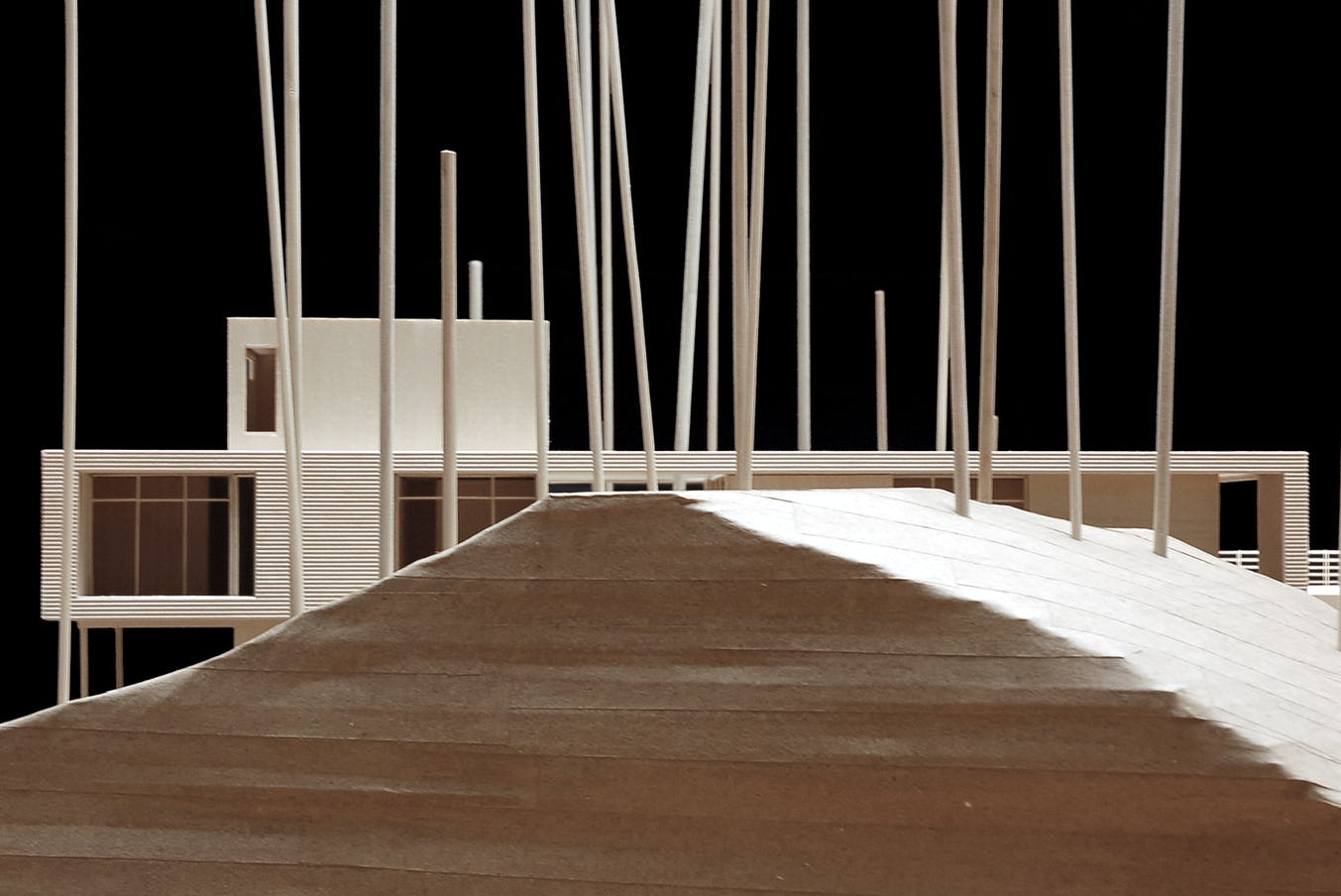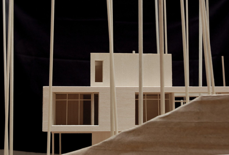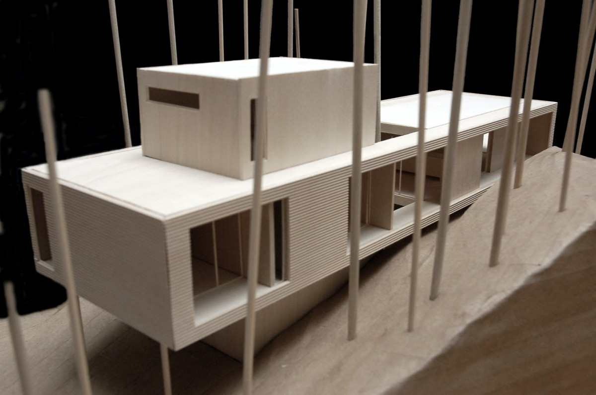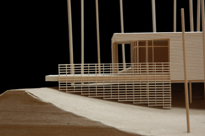 This vacation home was to have been located in Michigan City, Indiana at the peak of a large wooded sand dune. The living floor hovers above the street entrance and slices through the top of the dune to reveal panoramic views of Lake Michigan. In an effort to disrupt the natural site as little as possible, the entire house rests on a series of structural piles which would be driven into the sand, like a pier.
