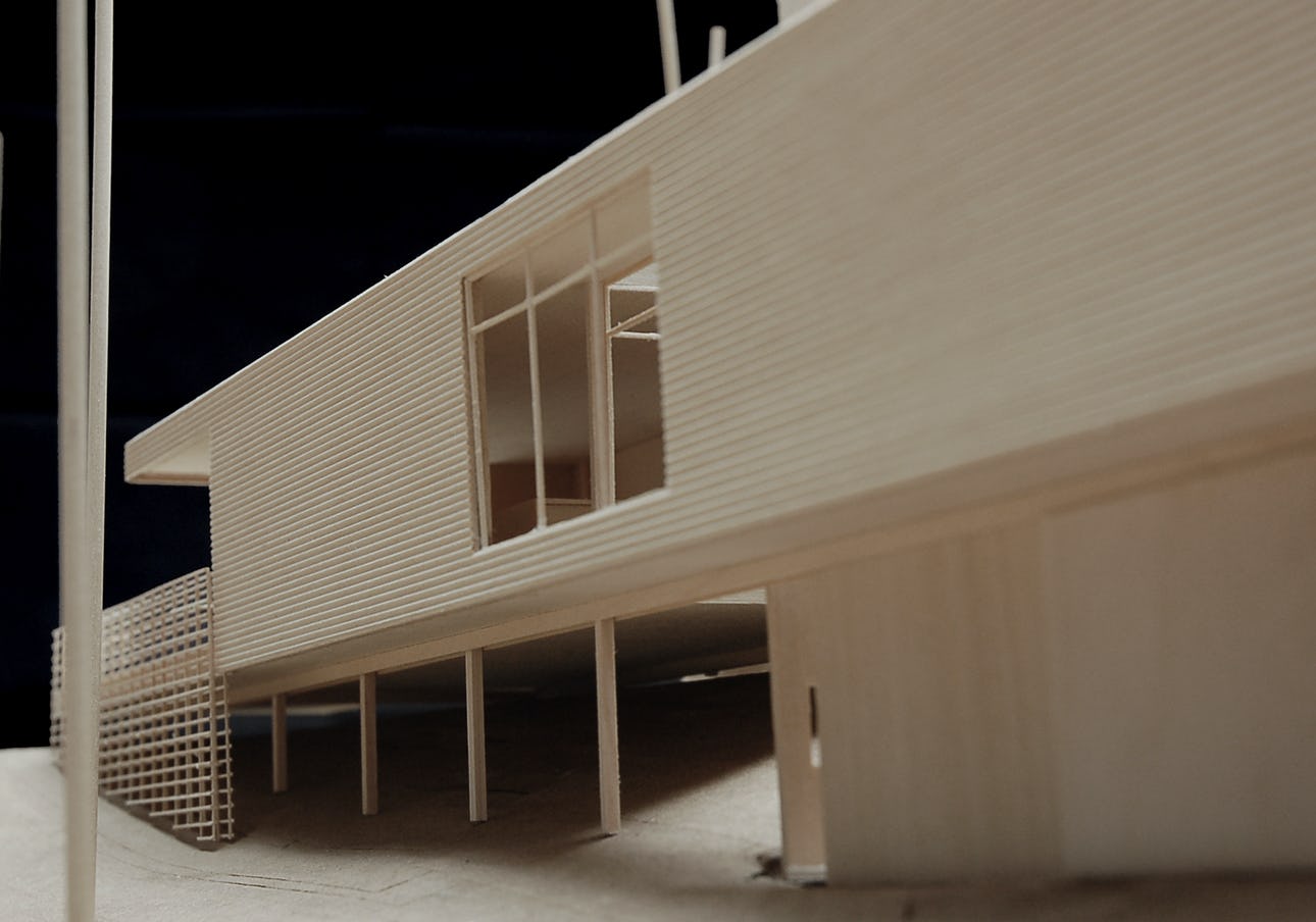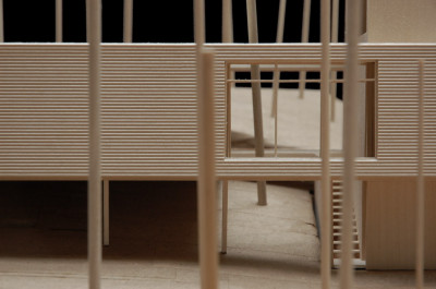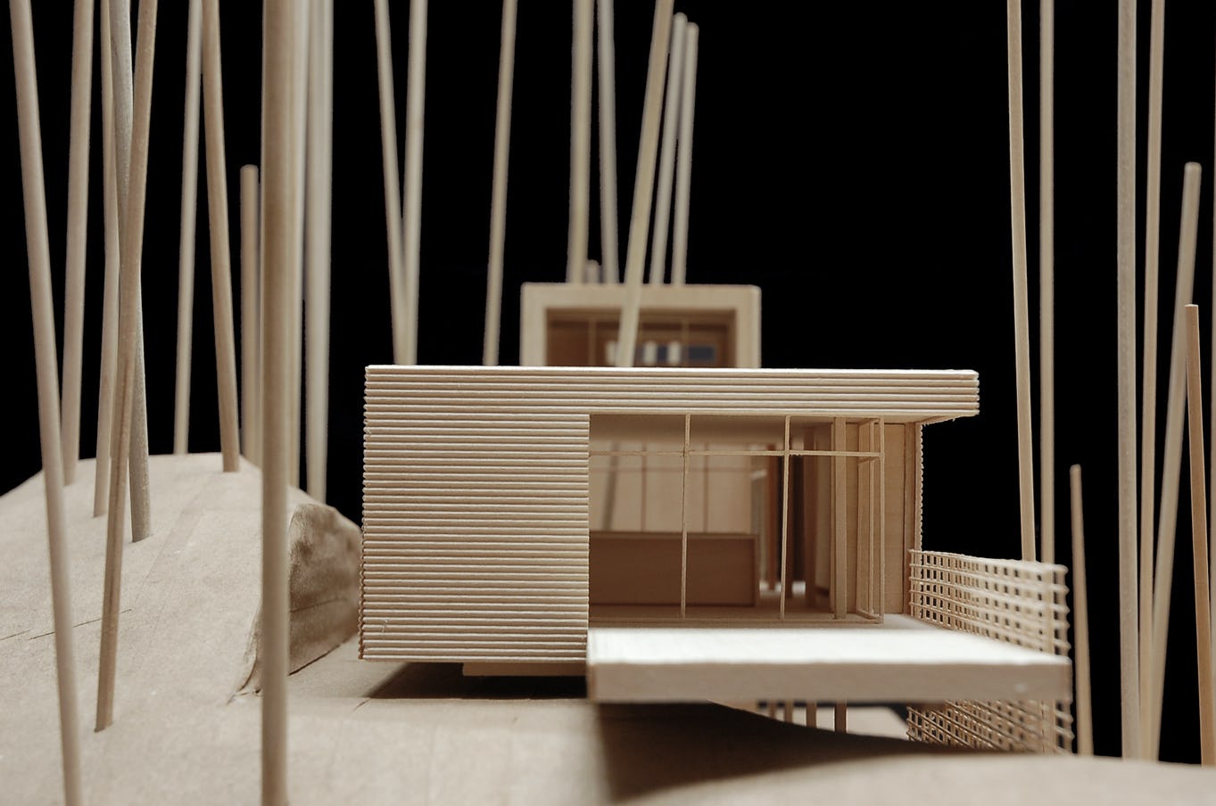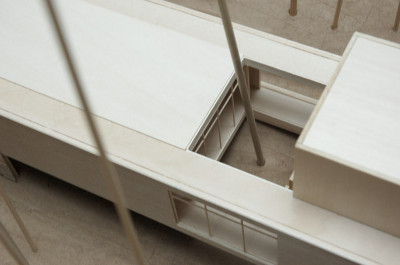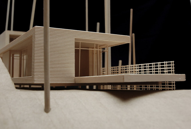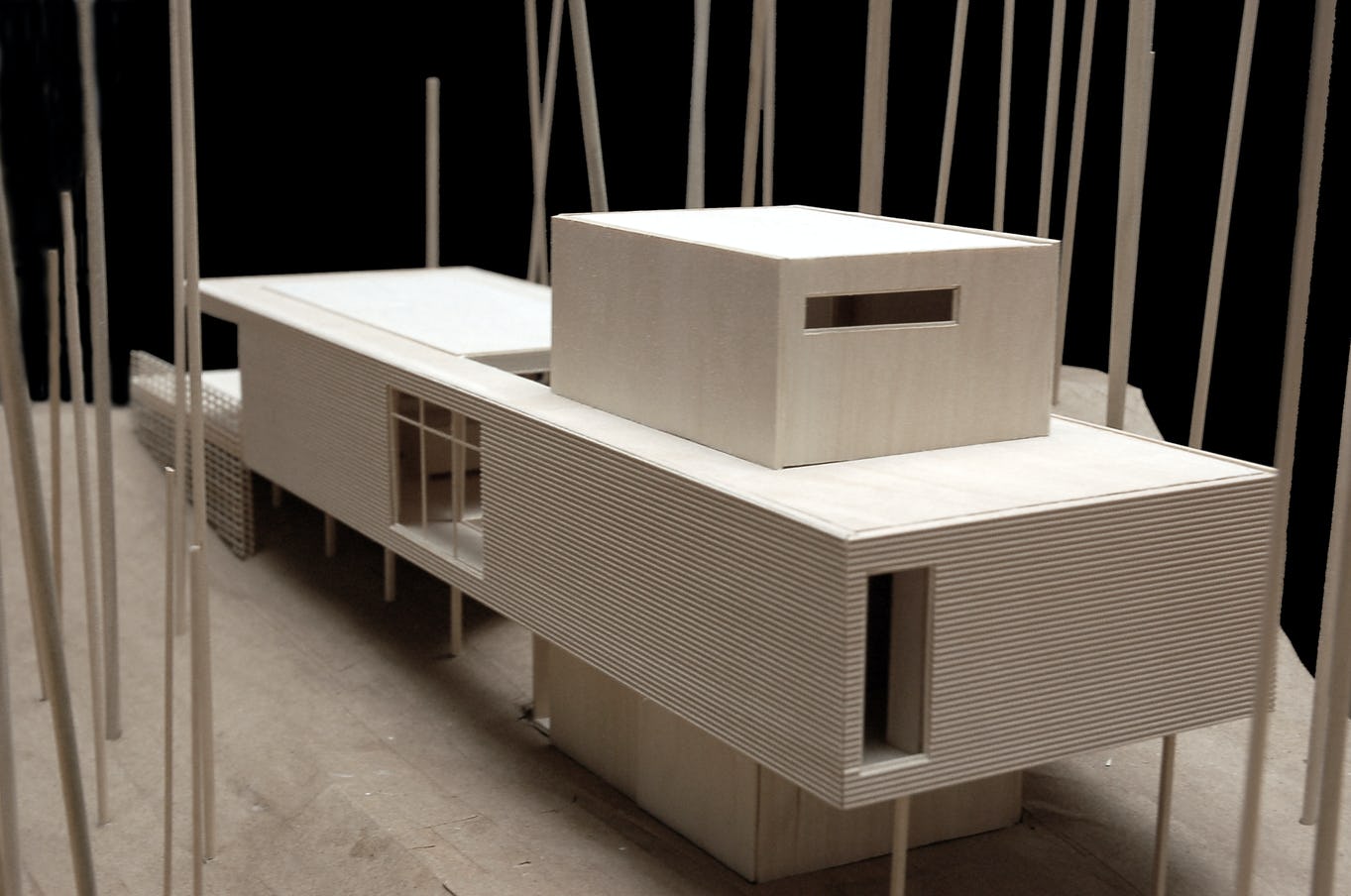 This vacation home was to have been located in Michigan City, Indiana at the peak of a large wooded sand dune. The living floor hovers above the street entrance and slices through the top of the dune to reveal panoramic views of Lake Michigan. In an effort to disrupt the natural site as little as possible, the entire house rests on a series of structural piles which would be driven into the sand, like a pier.
