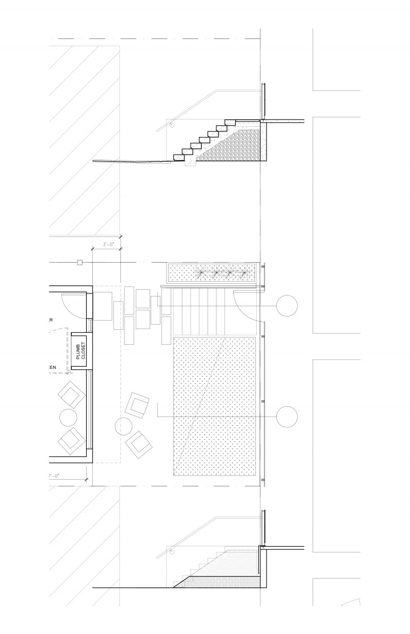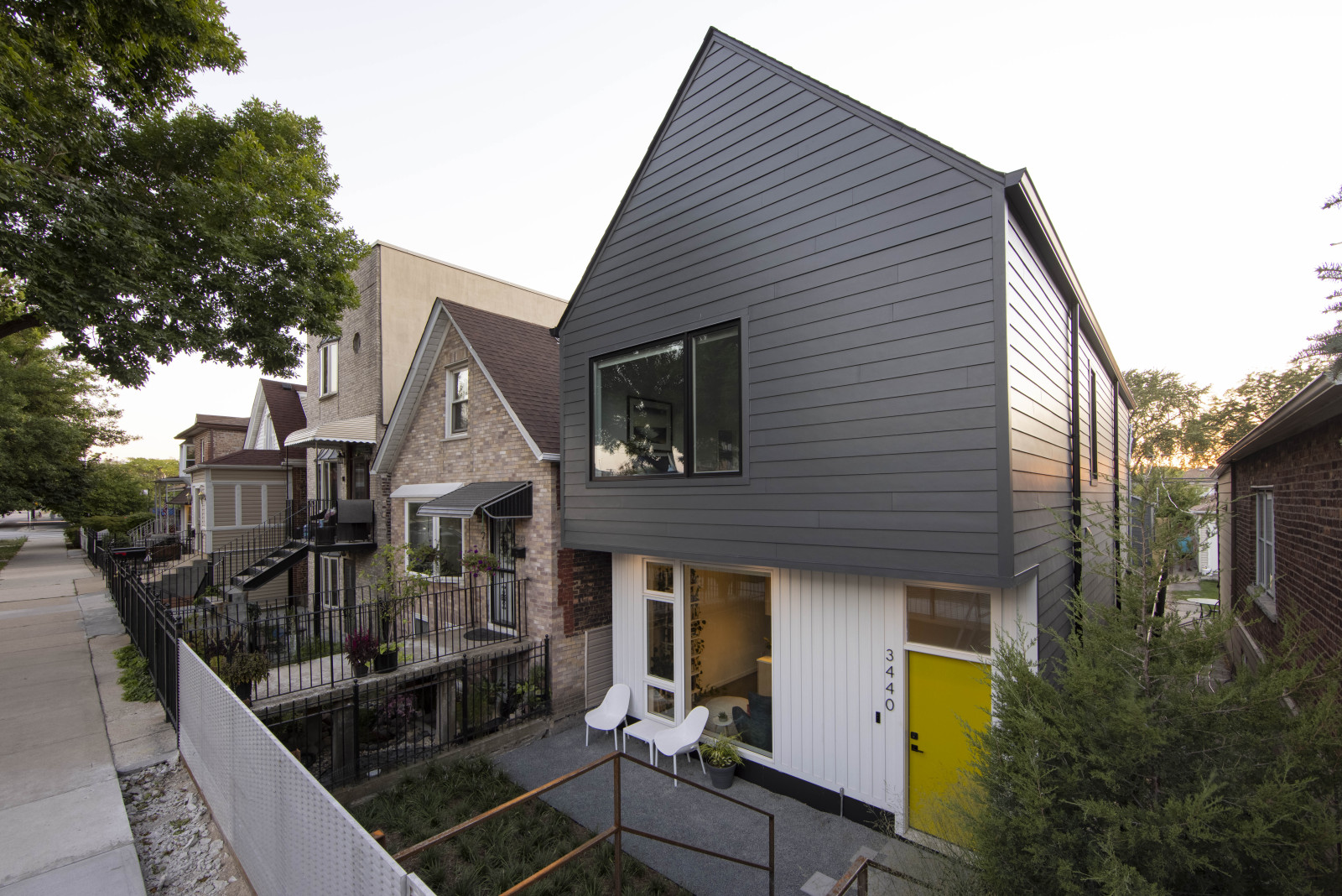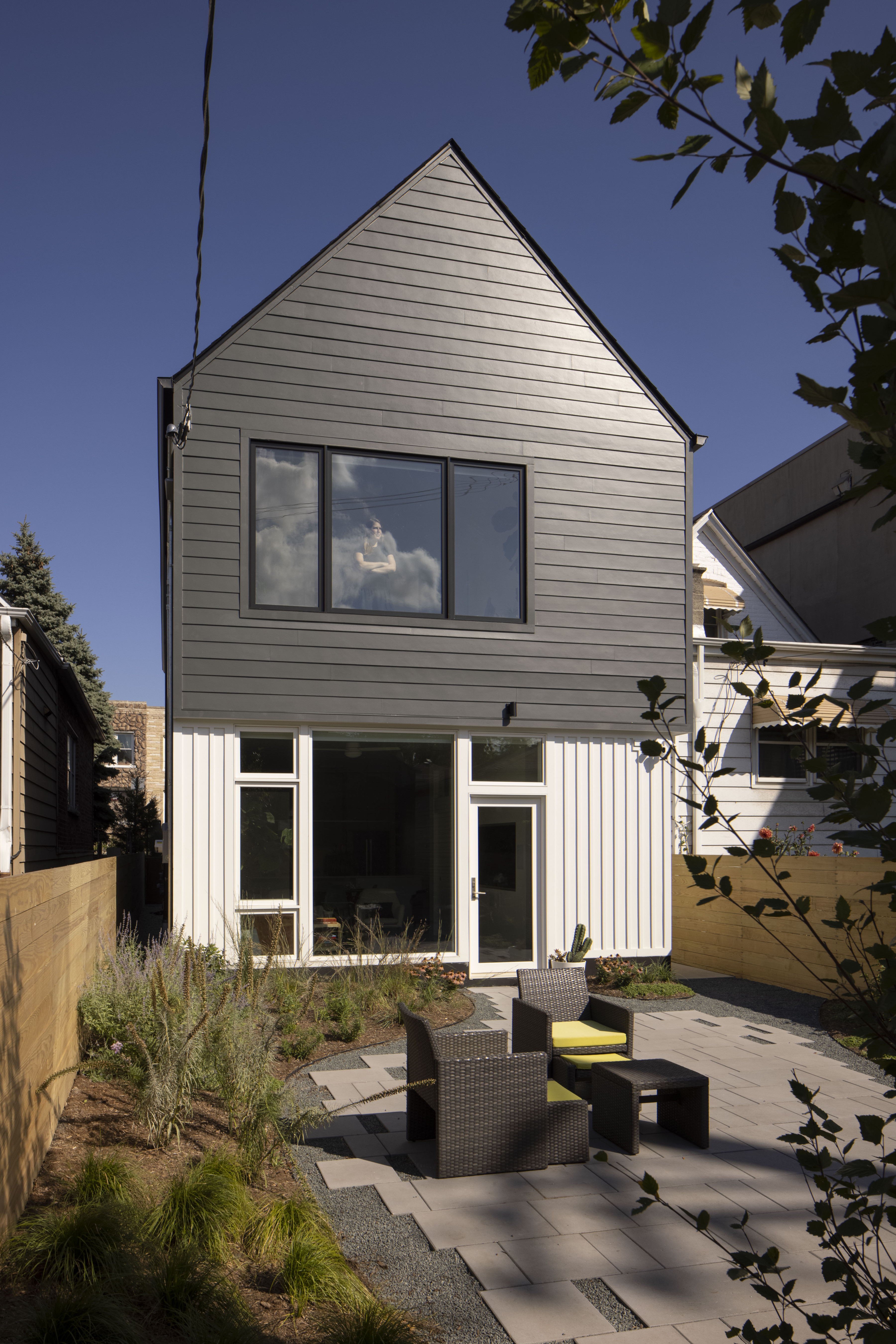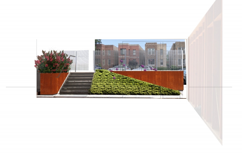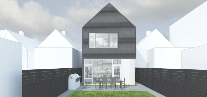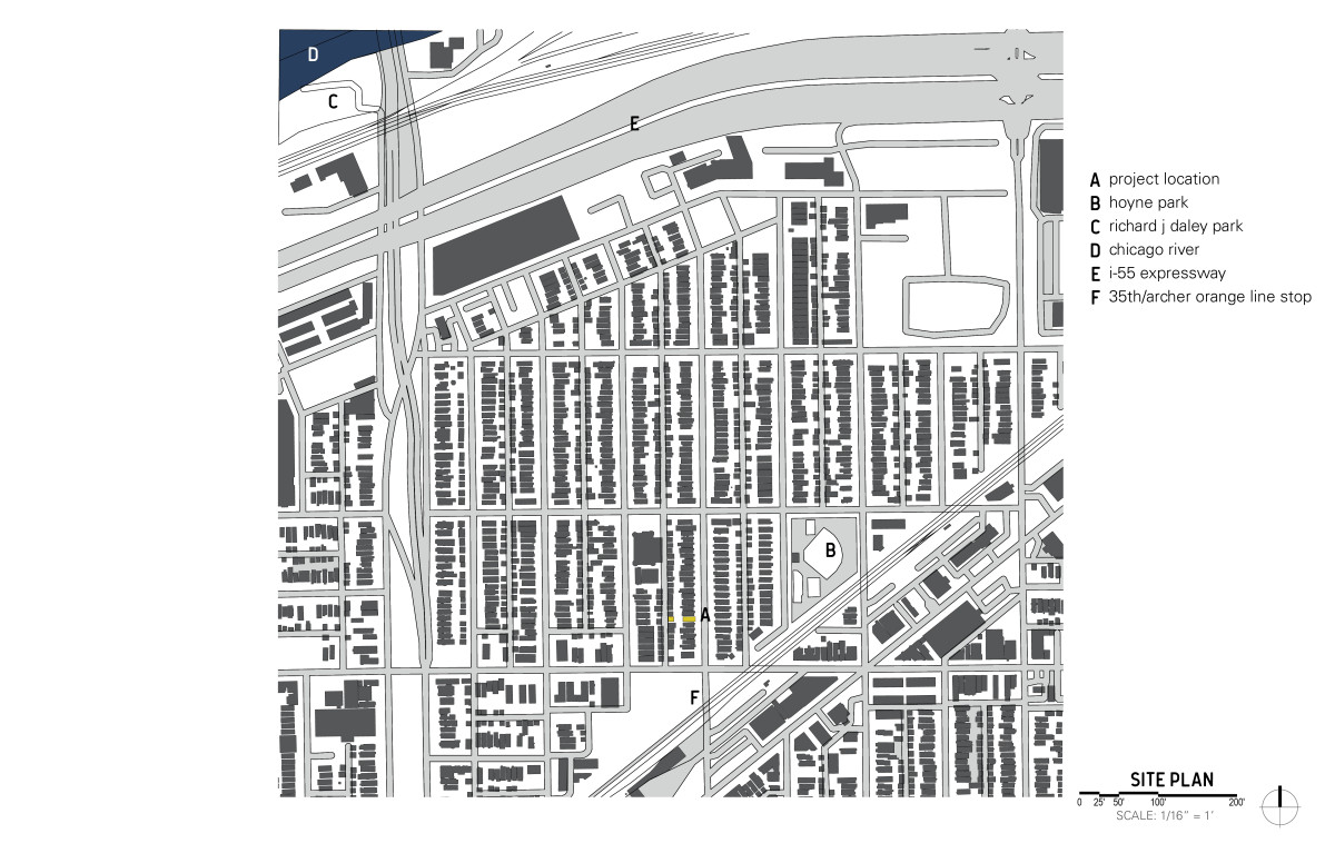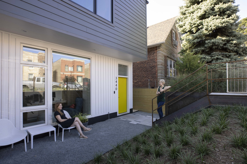 Level was asked by a young couple to design a new house in McKinley Park, an up-and-coming neighborhood on Chicago's southwest side. The block consists of predominantly frame 1 1/2 story single family homes. Like other Chicago neighborhoods, at some point in its history the streets and sidewalks were raised, presumably for flooding reasons. This condition causes the houses to appear below grade, with "bridges" and stairs leading to what would be the second floor of the home. The basement essentially sits on grade, five feet below the sidewalk. We embraced this condition and put the entry to the home at grade, eliminated the basement, and made the house only as large as it needed to be. This preserved major outdoor space for backyard entertaining, and allowed us to save money on construction. The result is an extremely efficient yet accommodating single family home. It is modern in appearance, yet fits into the neighborhood fabric.