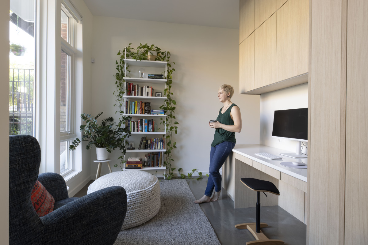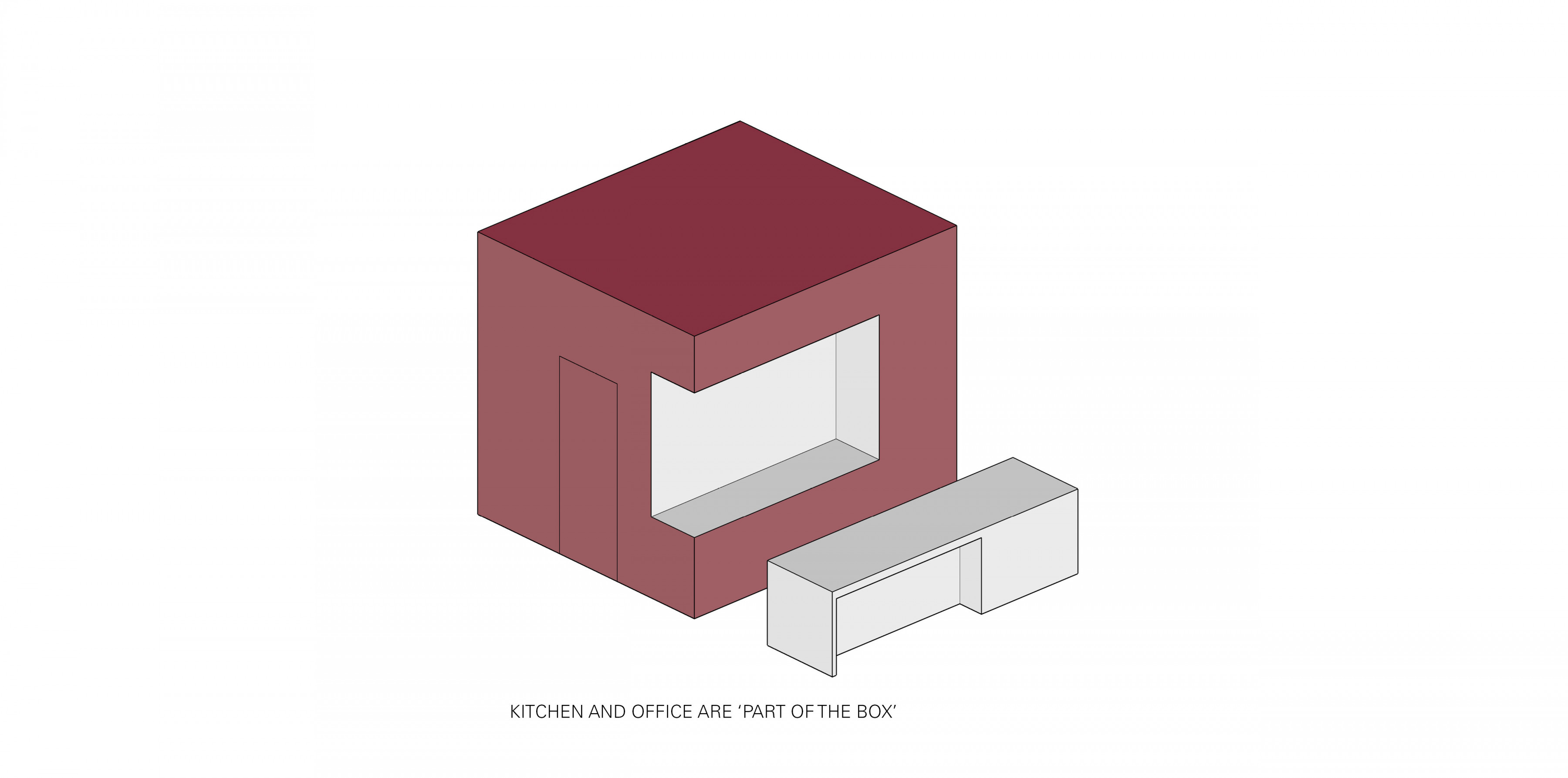 This wood-clad box anchors the open floor plan of the first floor and houses an office, coat closet, pantry, powder room, and the working wall of the kitchen.