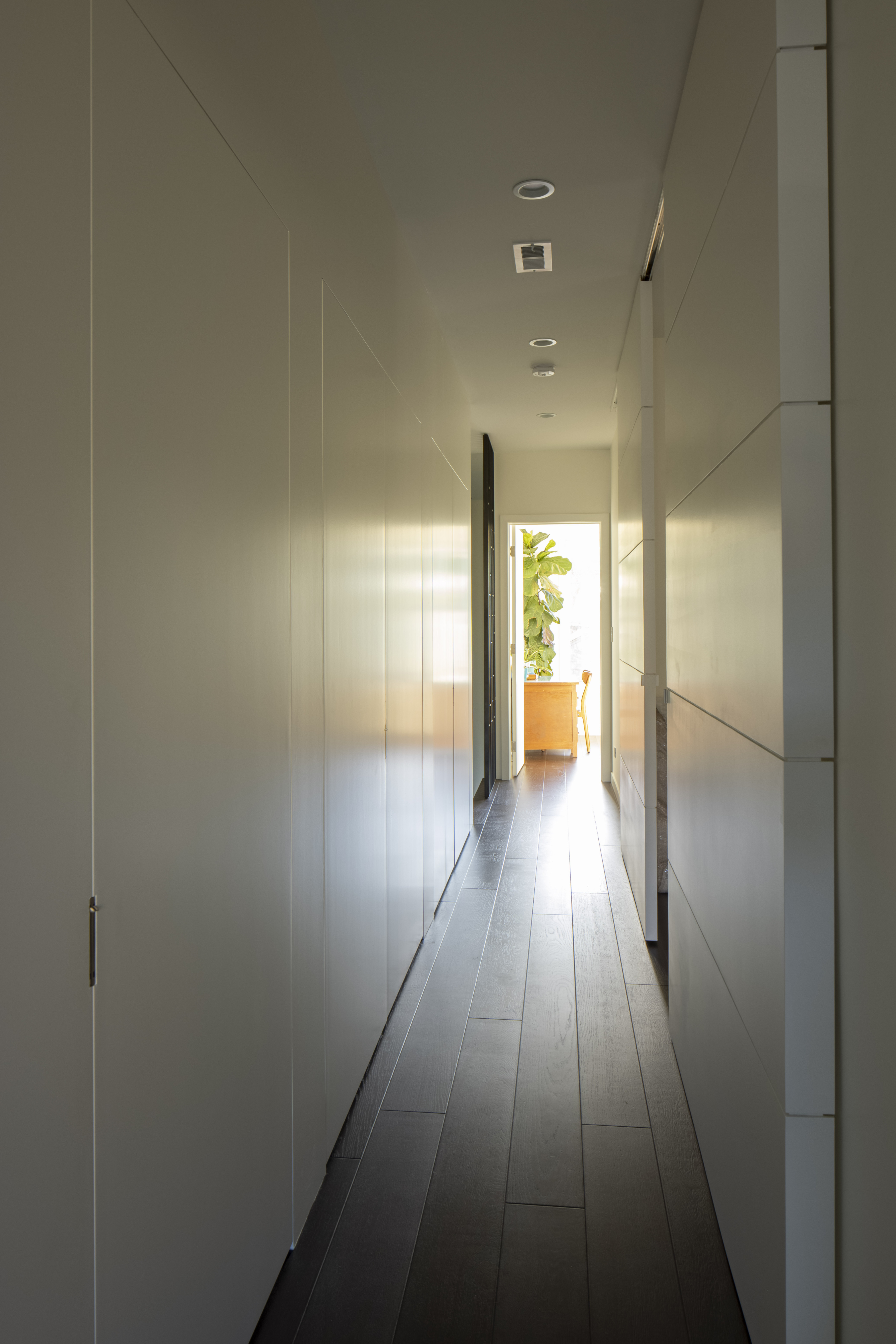 The upstairs corridor was detailed so that the double doors into three large closets seamlessly integrate into the wall.