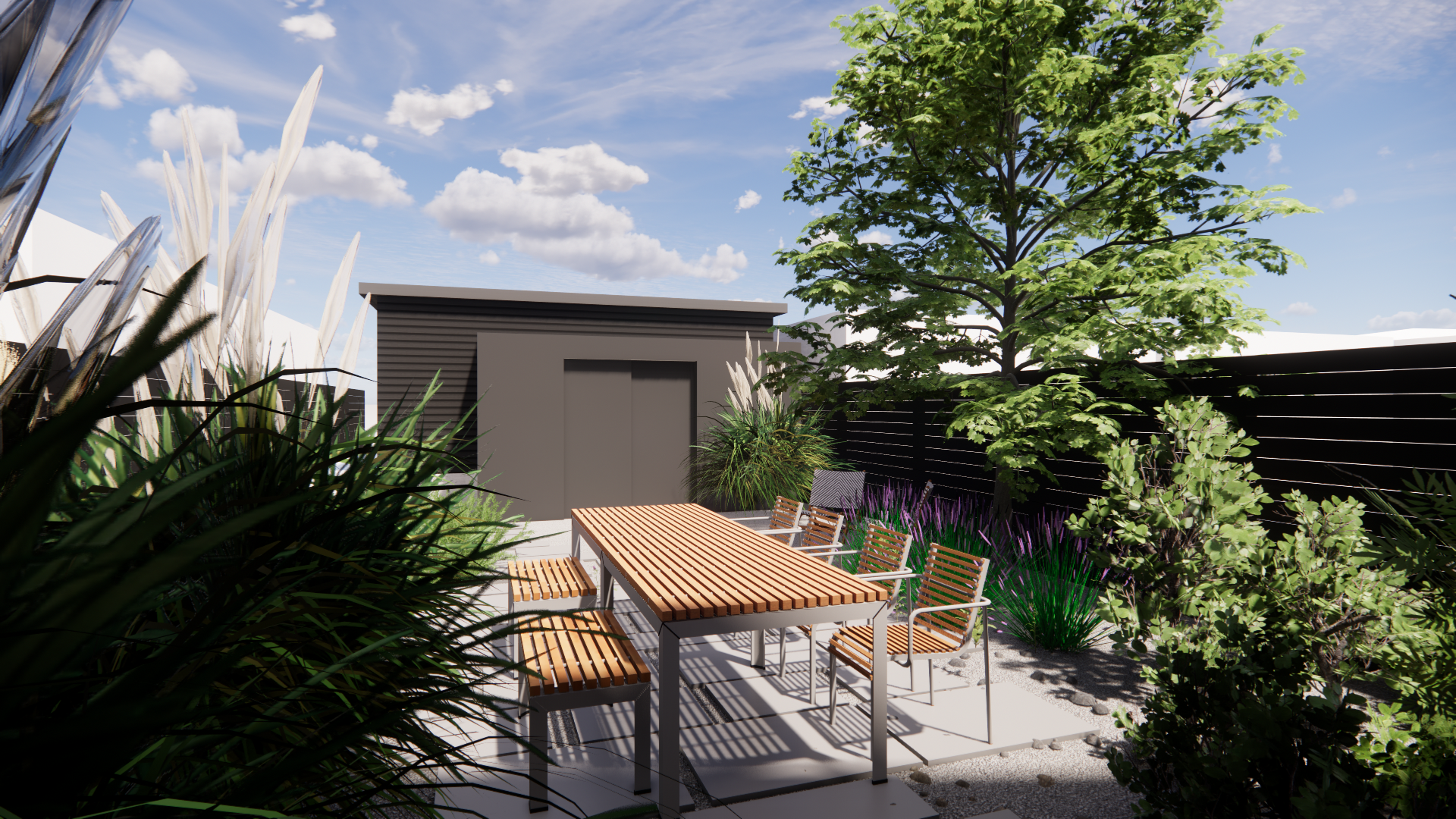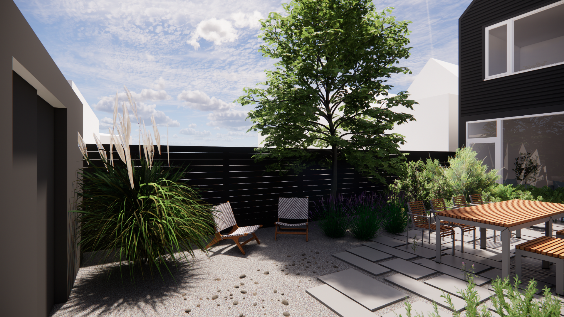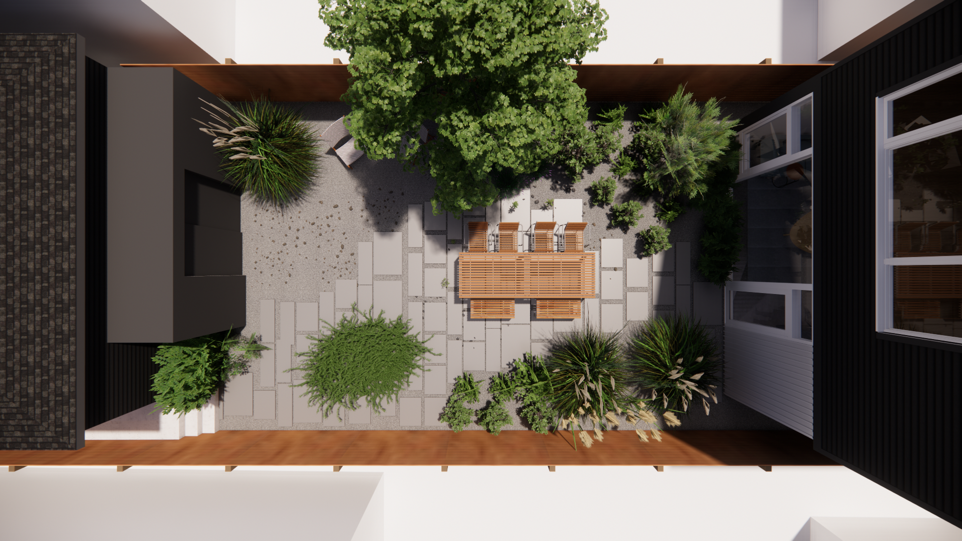 In addition to architecture and interior design services, Level provided landscape design services for the project. A formal, geometric landscape mass incorporating a stair and several corten steel planters and walls creates a simple landscape form in the front entry garden. The private back yard, in contrast, invites the native prairie landscape that once covered the area into the residence, carving out an island for dining and entertaining within a sea of wildflowers, birds, and bees.