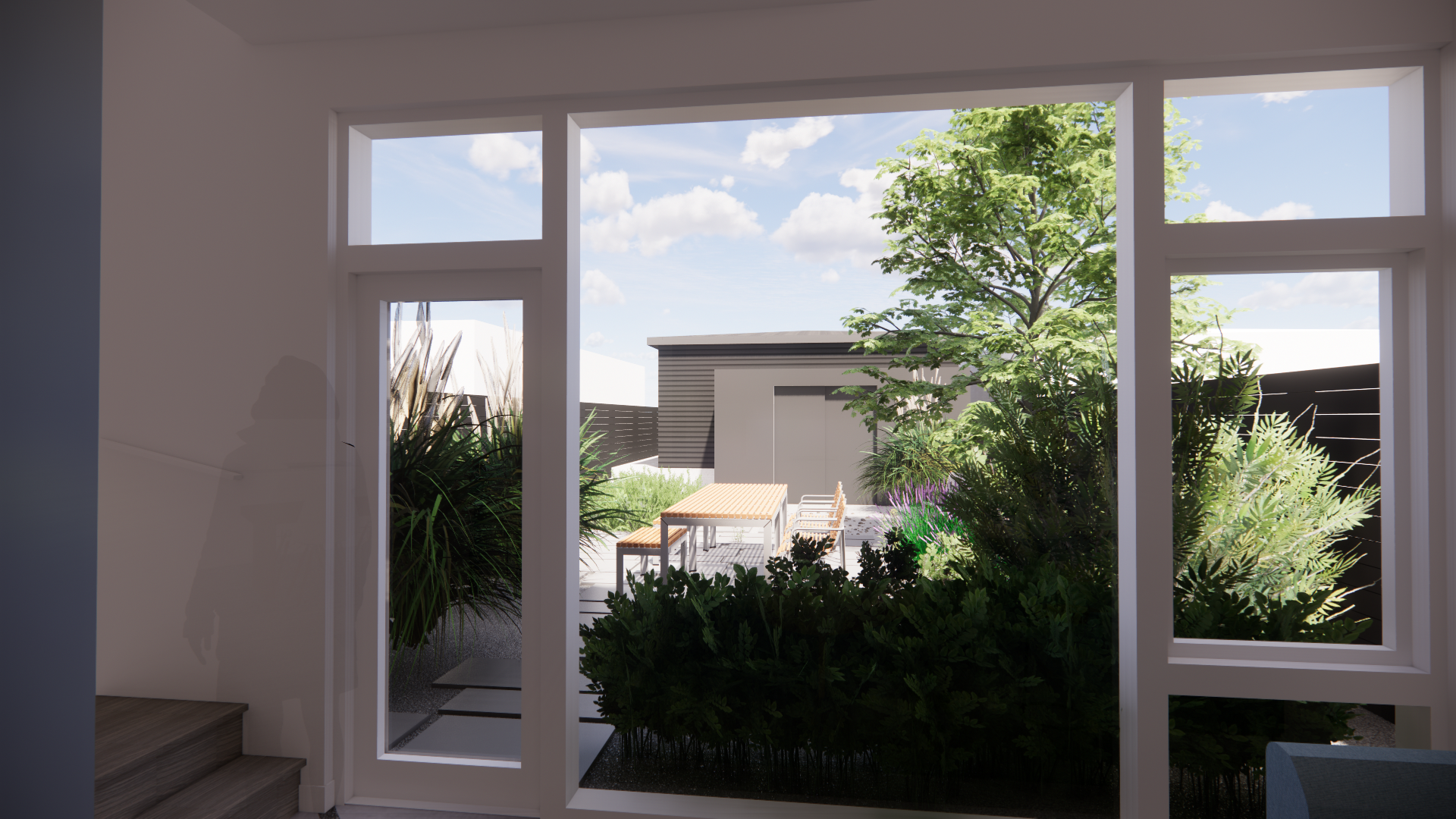 In contrast to the neighboring homes, the entrance to the home is at grade, eliminating a basement, and allows for a gracious sunken entry and garden, as well as a large window providing ample light into the owners' home office.
