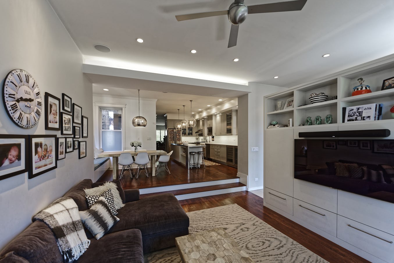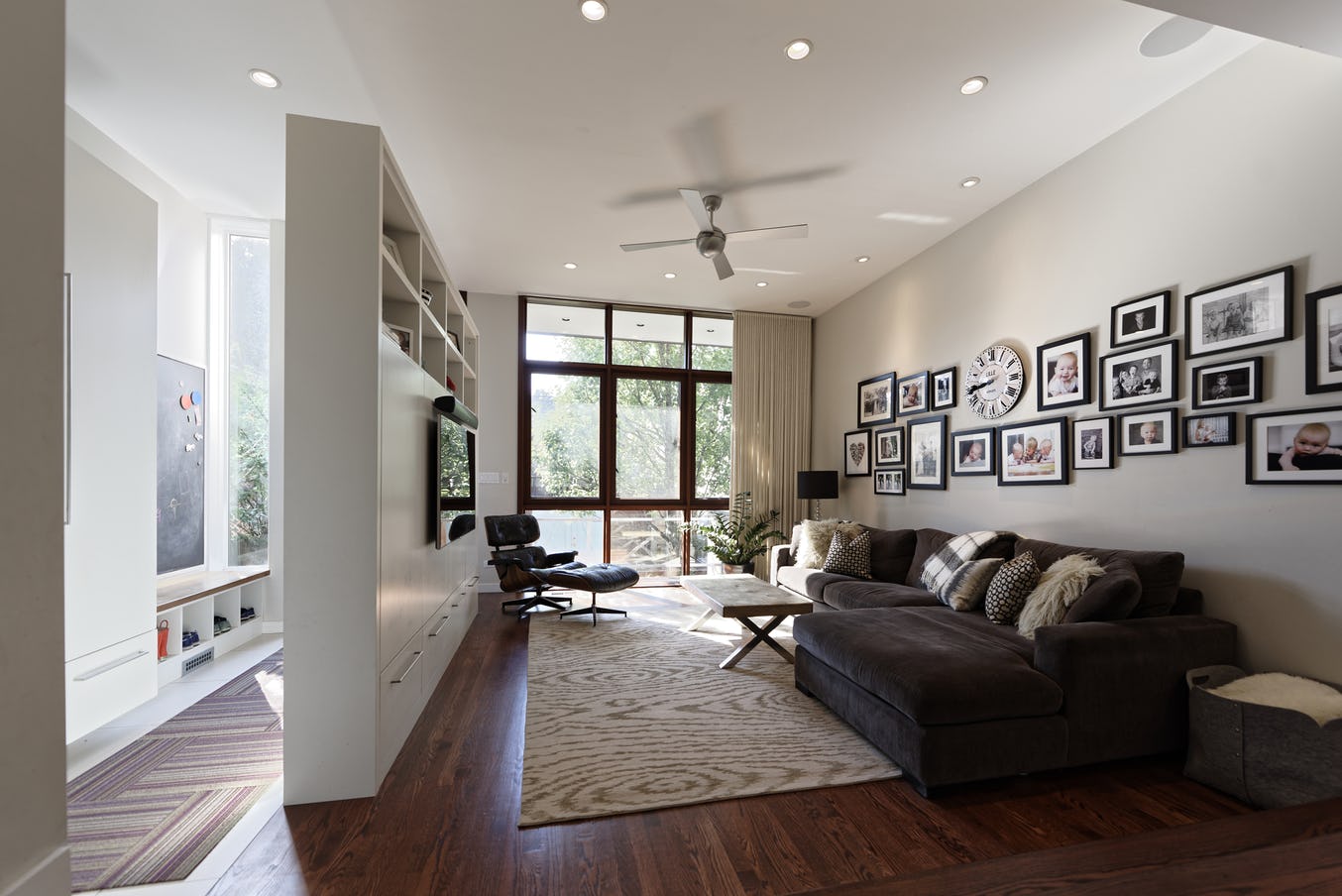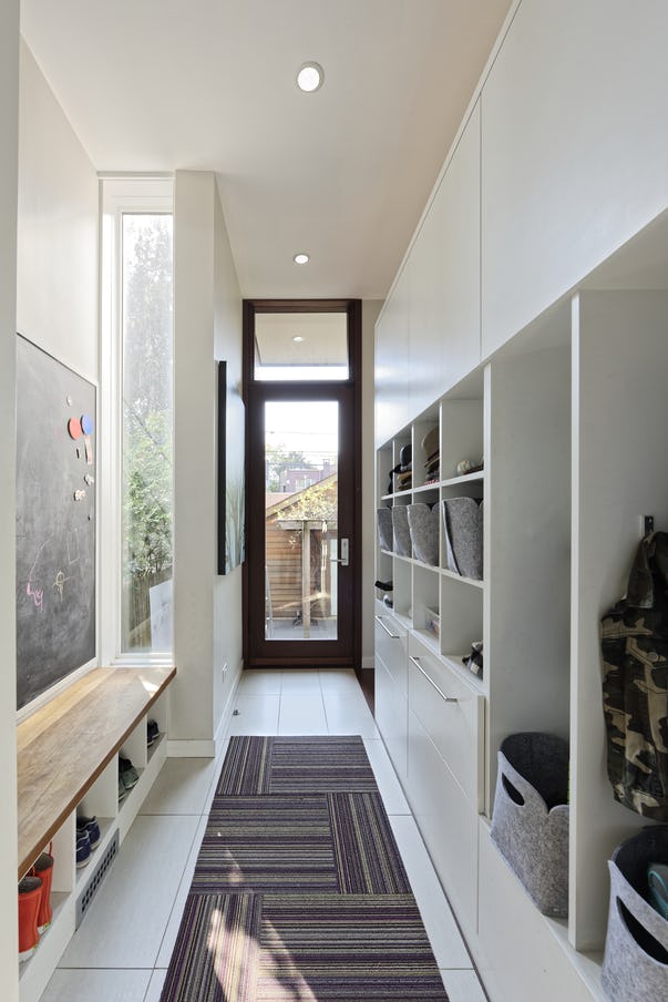 Our renovation includes a mudroom appointed with kid-friendly cubbies, as well as shelves and drawers high enough to stay clear of their curiosity. A chalkboard on one wall adds to the fun, while the hallway maintains the modern, compelling asymmetry found throughout the home.