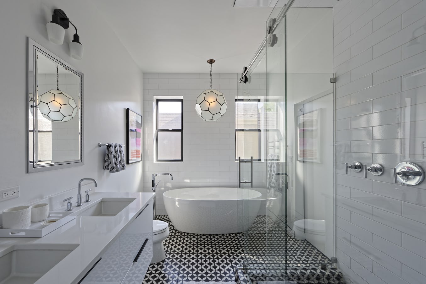 The master bath is a study in elegance, perfectly incorporating the classic masonry architecture of this Chicago home into a fresh, modern space.