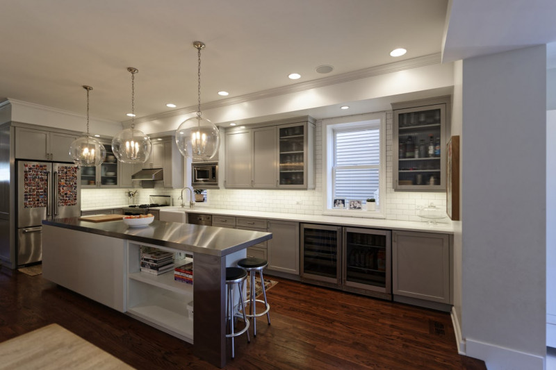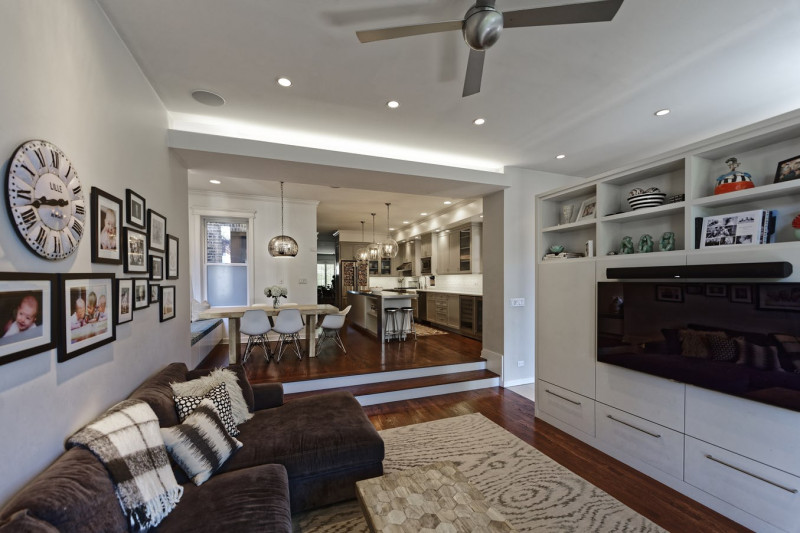 Situated on a classic long-and-narrow Chicago lot, this masonry single family home was extended toward the back to add space for a growing family. With a toddler a-foot and twins on the way, the clients sought to increase the size of their kitchen and create a spacious, informal family room connected to the backyard. There was also need for a mudroom and additional space in the master bedroom on the second floor.