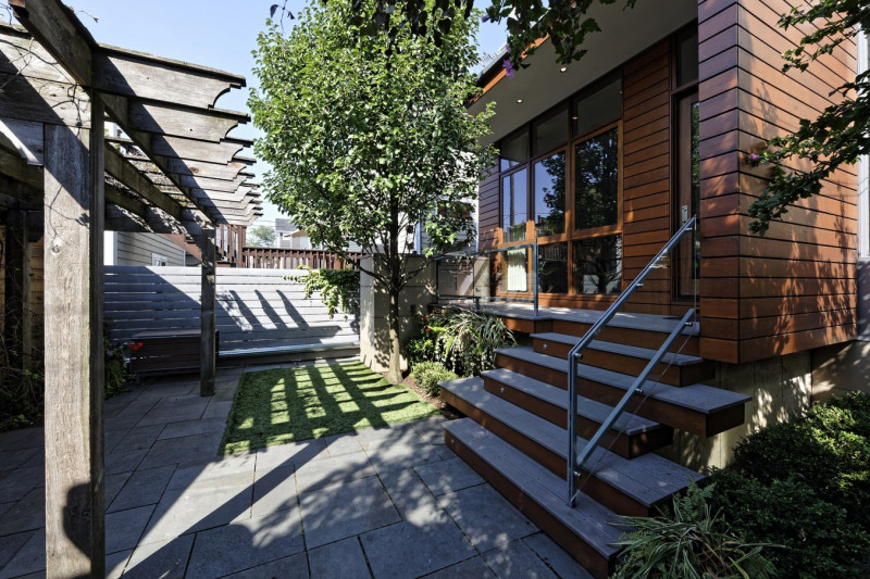 This two-story addition cleverly accommodates the necessary space within the constraints of the tight site. An exterior deck provides space for grilling, while a wide stair with integrated planting and seating further differentiates between the exterior grade level and the living room.