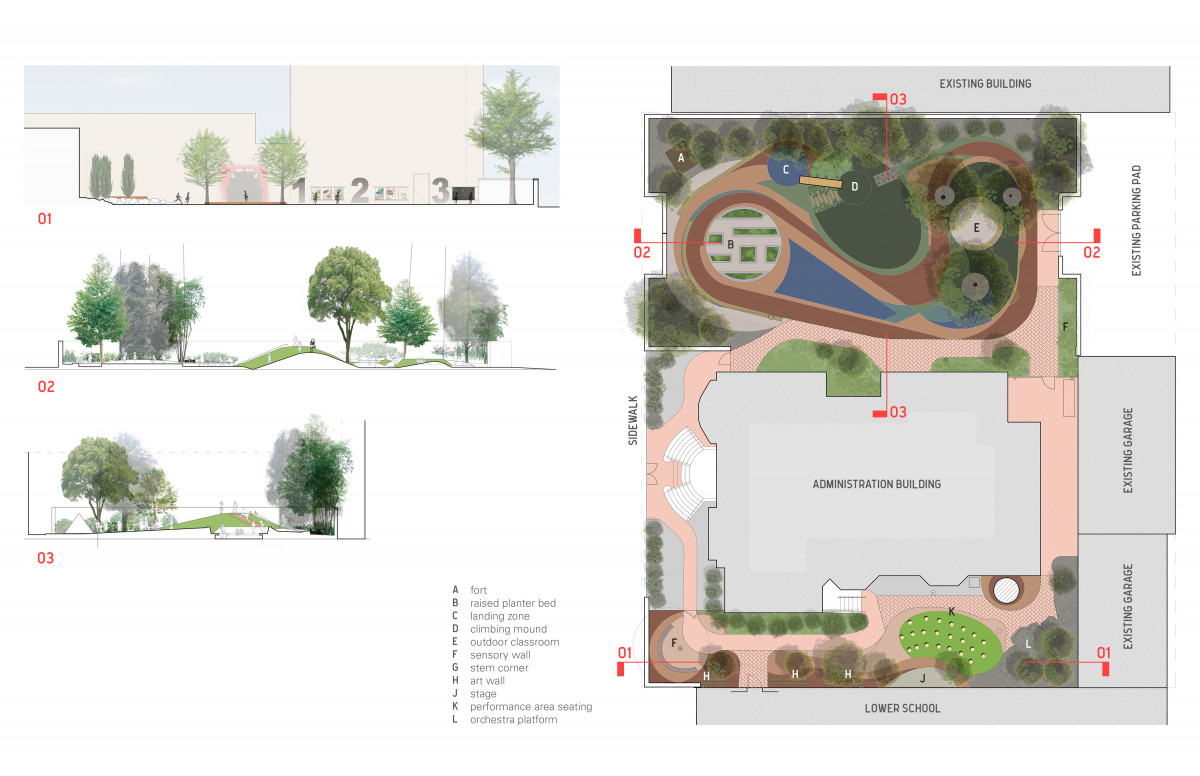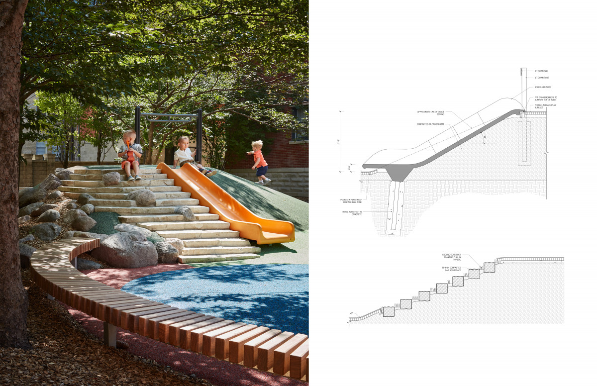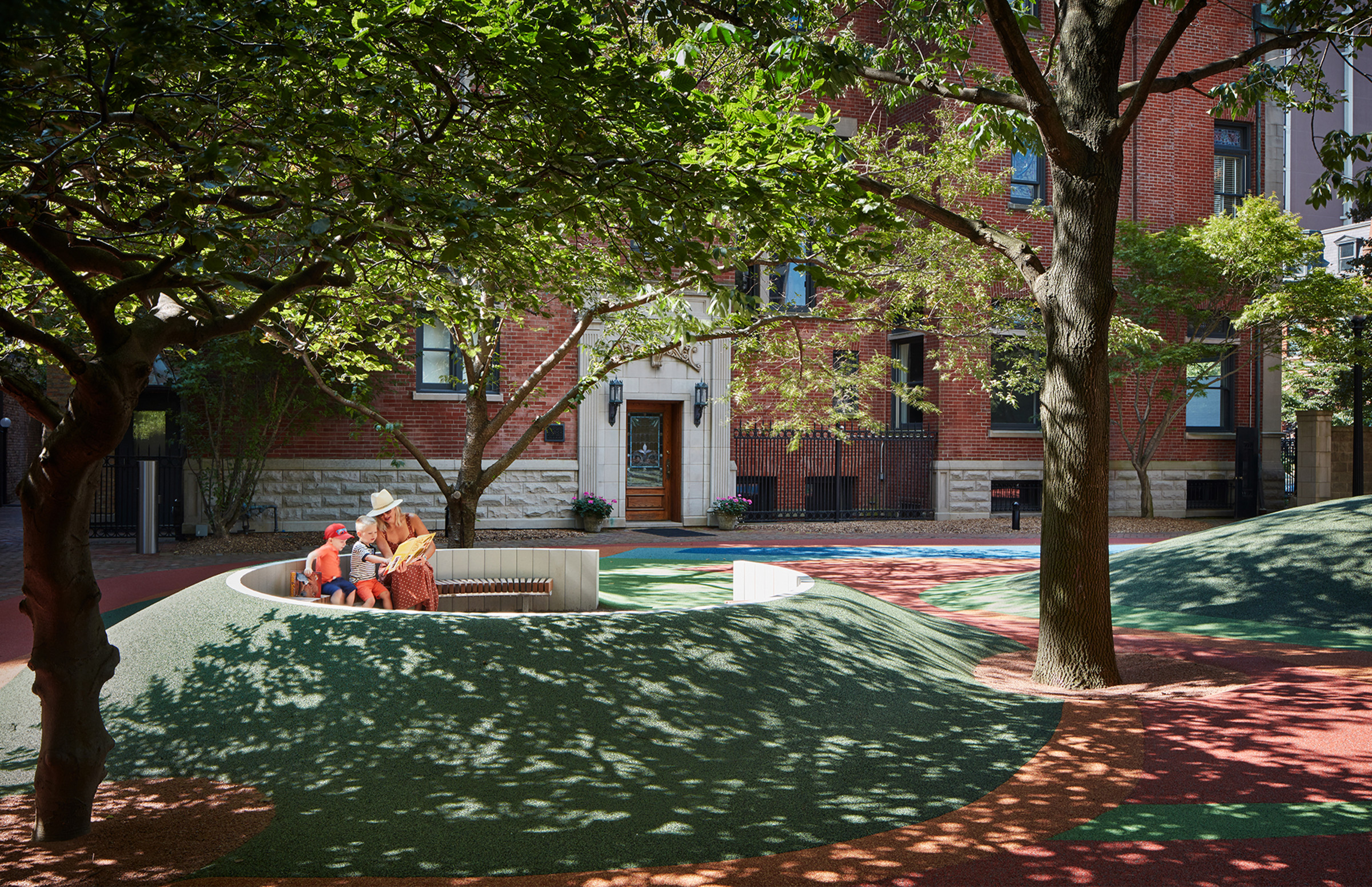The Latin Lower School playground occupies the grounds of the former Lurie Mansion in the Gold Coast neighborhood of Chicago. While the land was originally purchased for school programming and renovation of the building for additional classroom space, ADA compliance and budget restrictions instead prompted the re-imagination of the building as administrative offices, using the grounds as a new play space for the Lower School children aged four to six. This creatively addressed the school’s overcrowding issues while maximizing budget and outcome. It also provided a much-needed addition to the school’s singular rooftop playground, allowing the school to simultaneously stage recess and outdoor playtime for all grades.