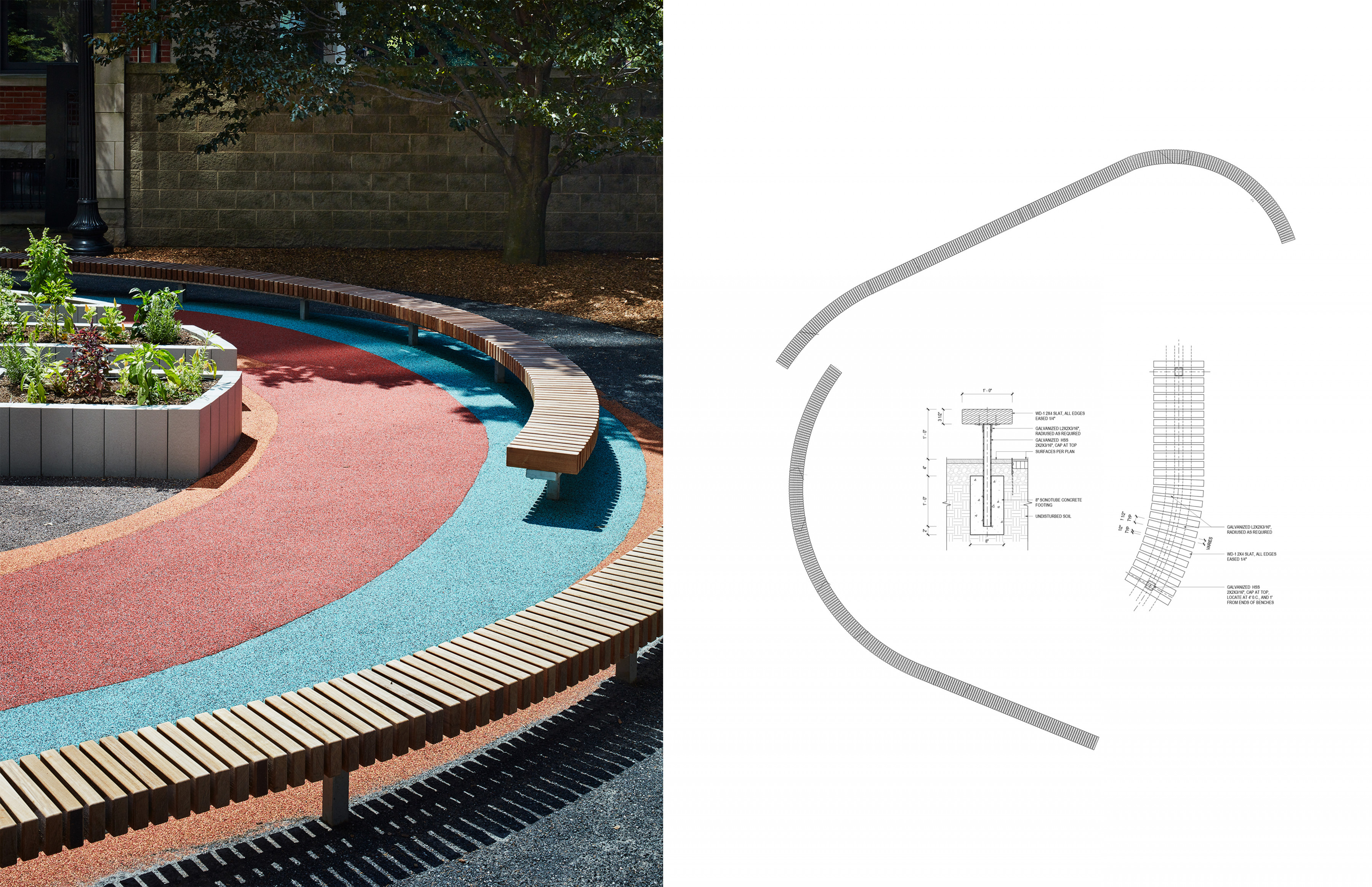 Our design created two distinct zones: one active and one more contemplative. Both include a colorful ground plane that can be interpreted simultaneously as an abstract painting, transportation system, and cartographic game board.