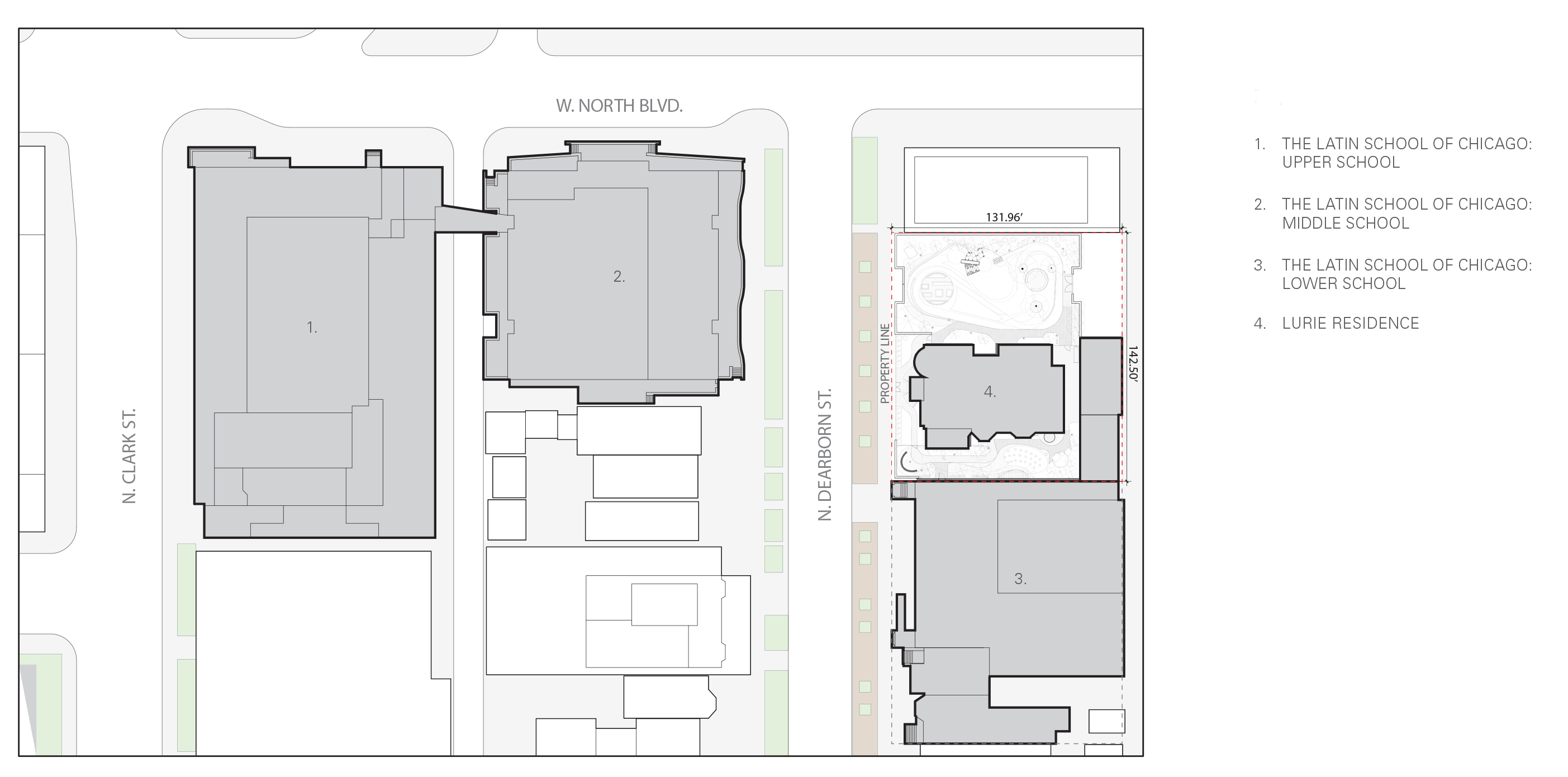 Site plan showing the urban location of the school at the intersection of North Avenue and Clark Street, with the addition of the Lurie Residence and its associated open space.
