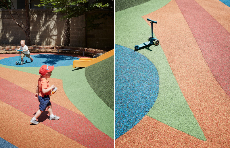 The playground was designed according to the principles of Reggio Emilia, an approach towards early childhood education that encourages children to construct their own learning through play and exchange with each other, as well as with the teacher. In this context, the environment is the teacher, inspiring and encouraging children to delve deeper and deeper into their interests.