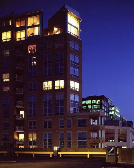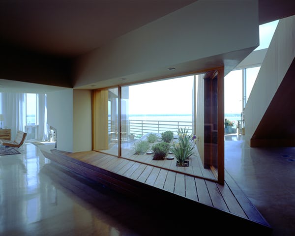 This two-story penthouse design, overlooking Lakes Mendota and Monona in Madison, Wisconsin, expanded in scope beyond the exterior walls of the 32-unit condominium building. A proposal by the architect and client to surgically alter the massing of the building envelope to create substantial exterior space was agreed to by the developer, leading to the design of the penthouse: a house in the sky with three independent outdoor living spaces.
