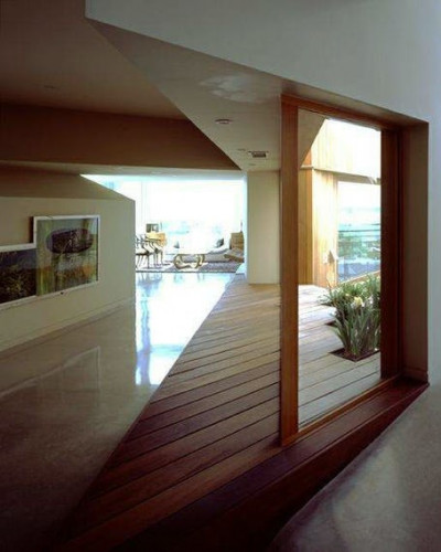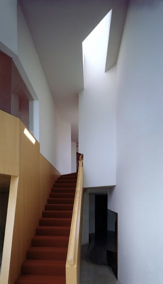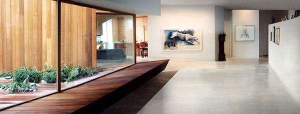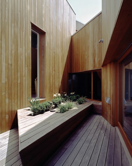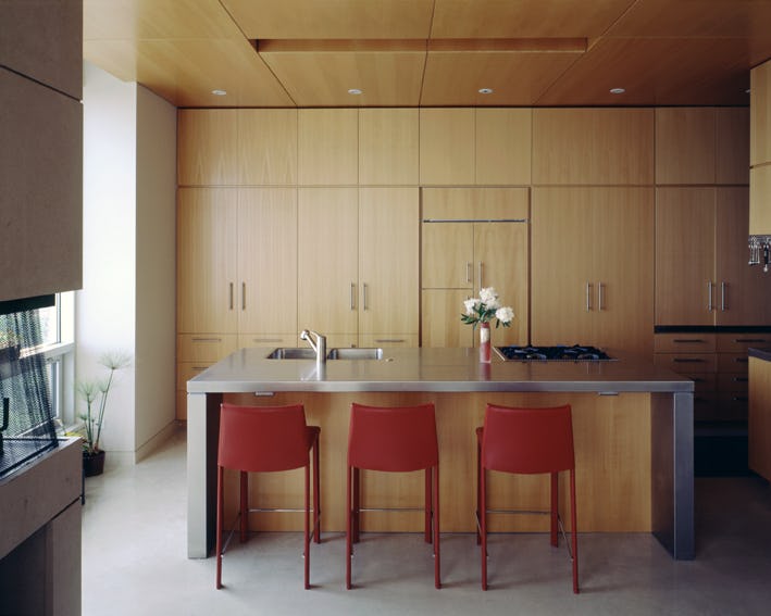 The finished interior boasts a myriad of features, including a gallery, a two-story library within an operating elevator shaft, and a gourmet kitchen. Continuity between inside and outside is achieved with full-height windows, large sliding doors, and a landscaped platform that becomes a built-in bench.