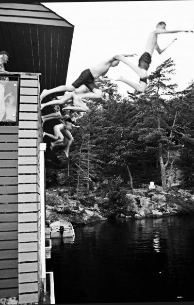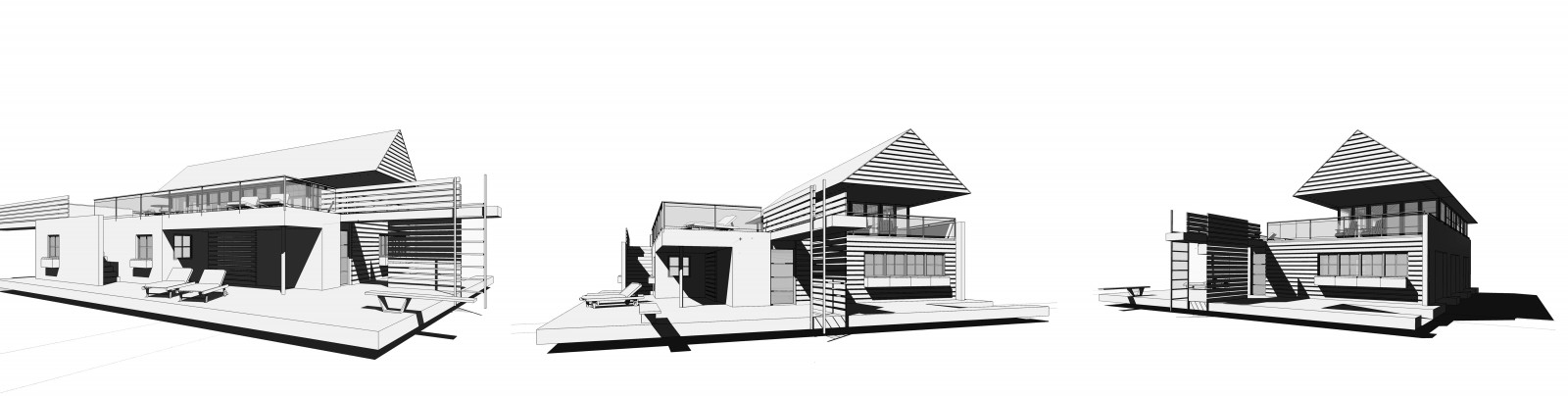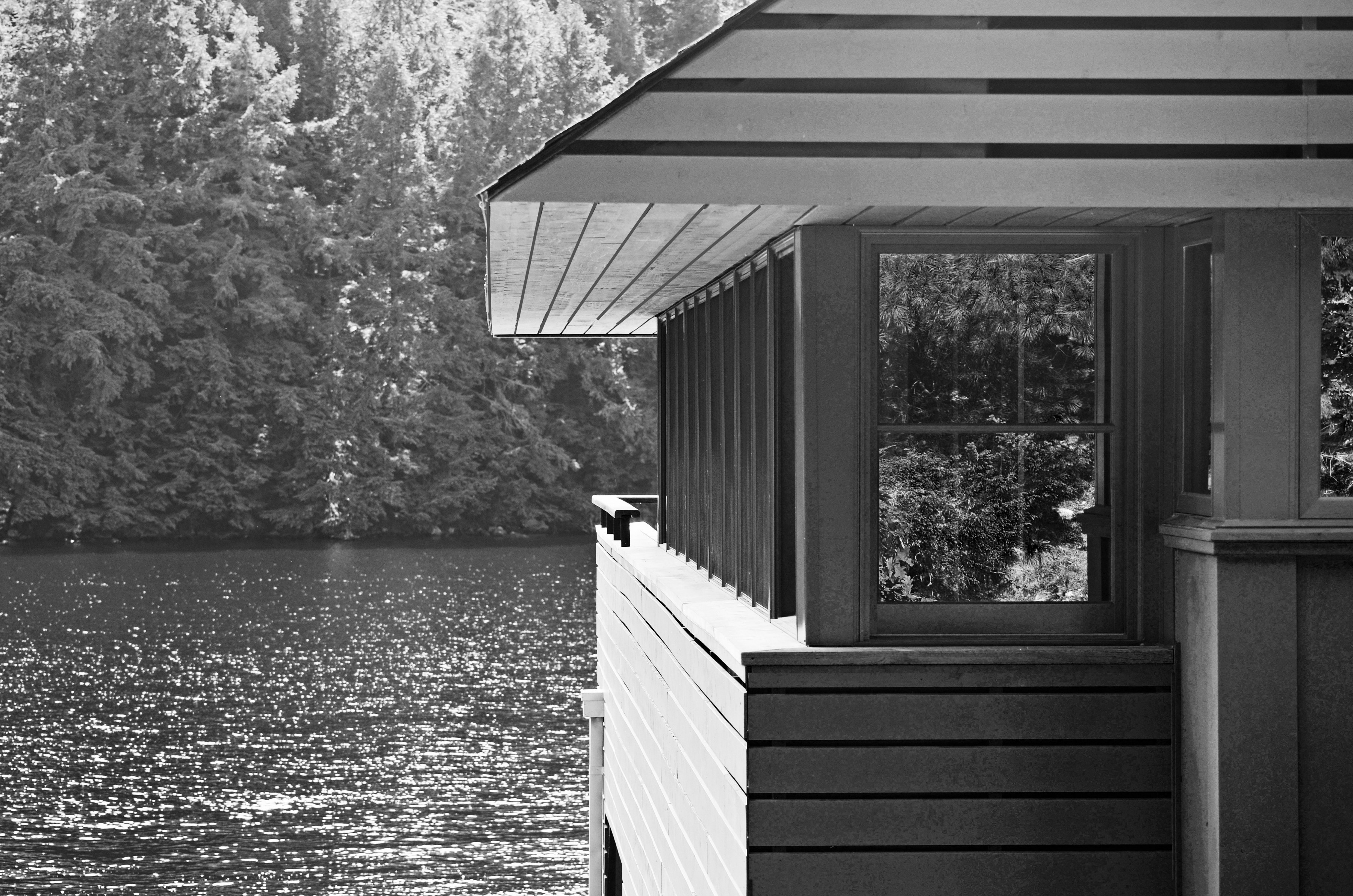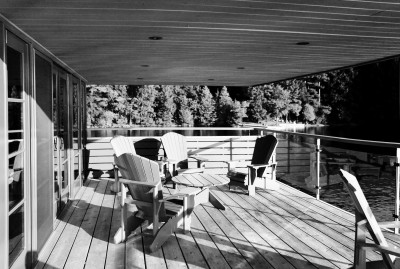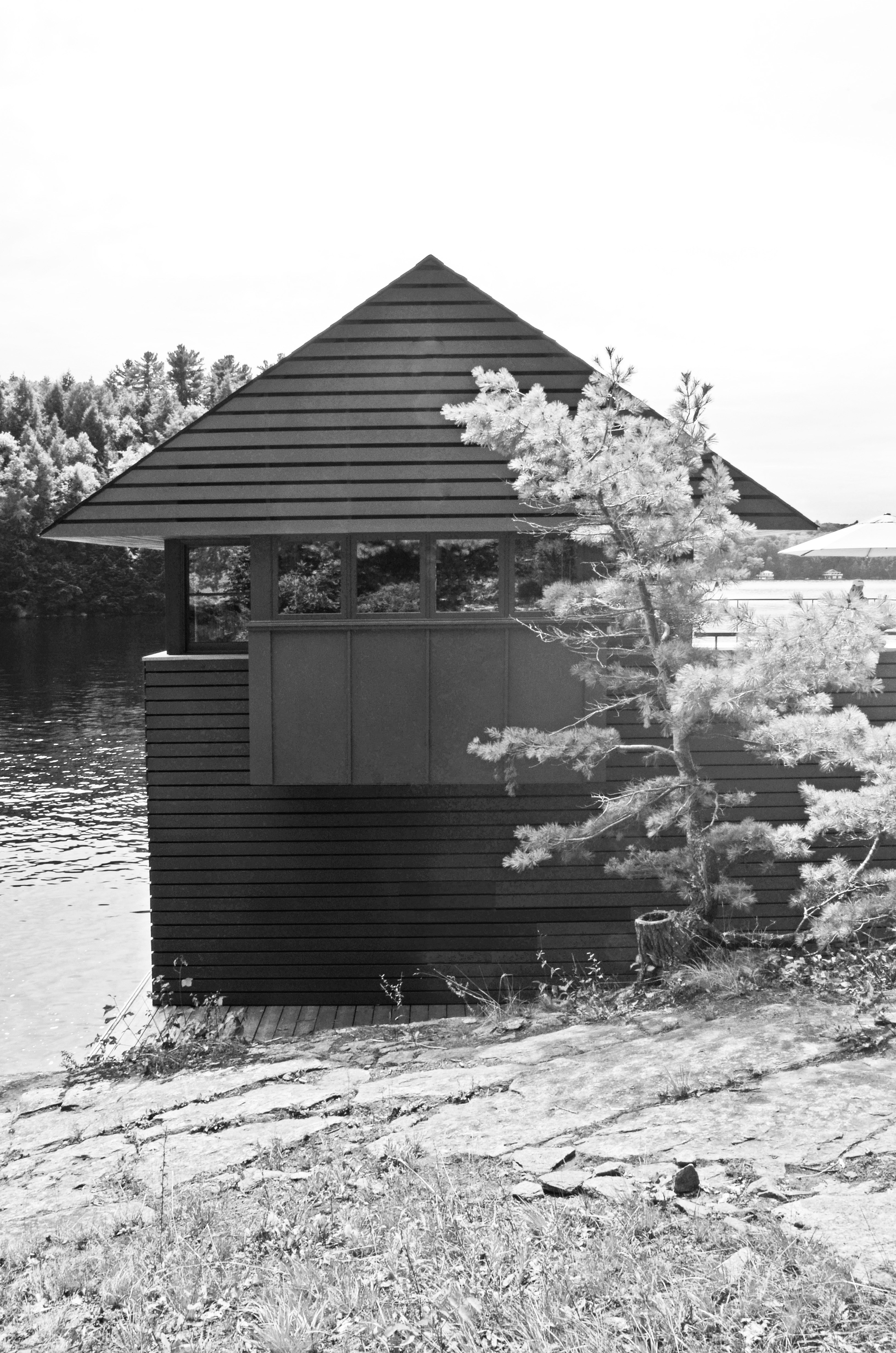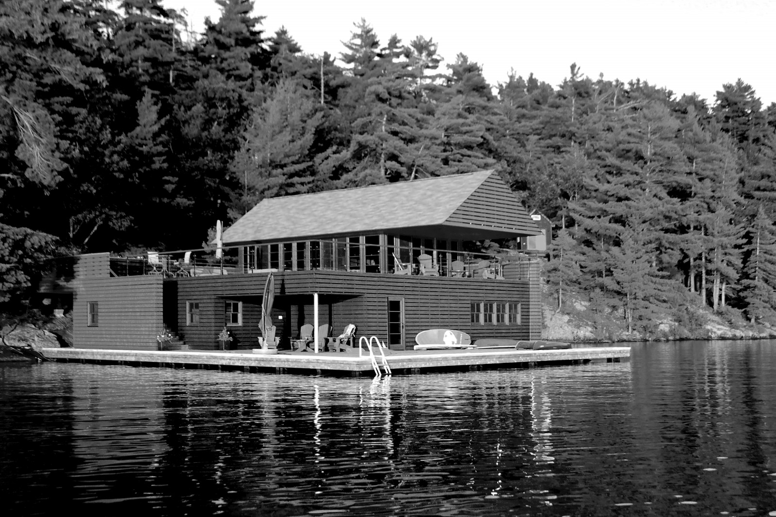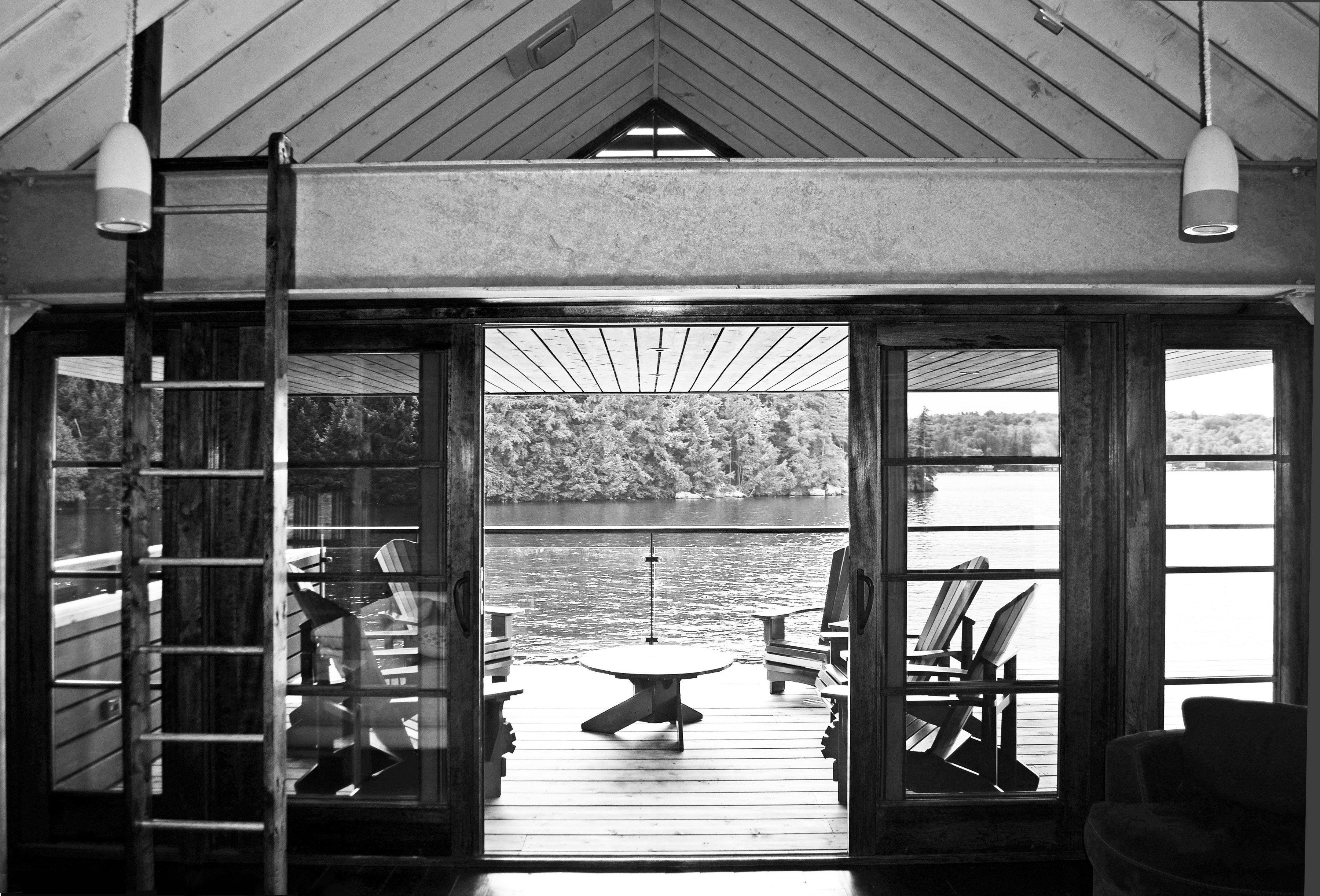 Our design reinterpreted and abstracted the elements of the traditional gabled Muskoka boathouse, modernizing it by cantilevering the gable roof to create a 15’ unsupported overhang, a continuous band of windows and doors, and an exposed steel structure.