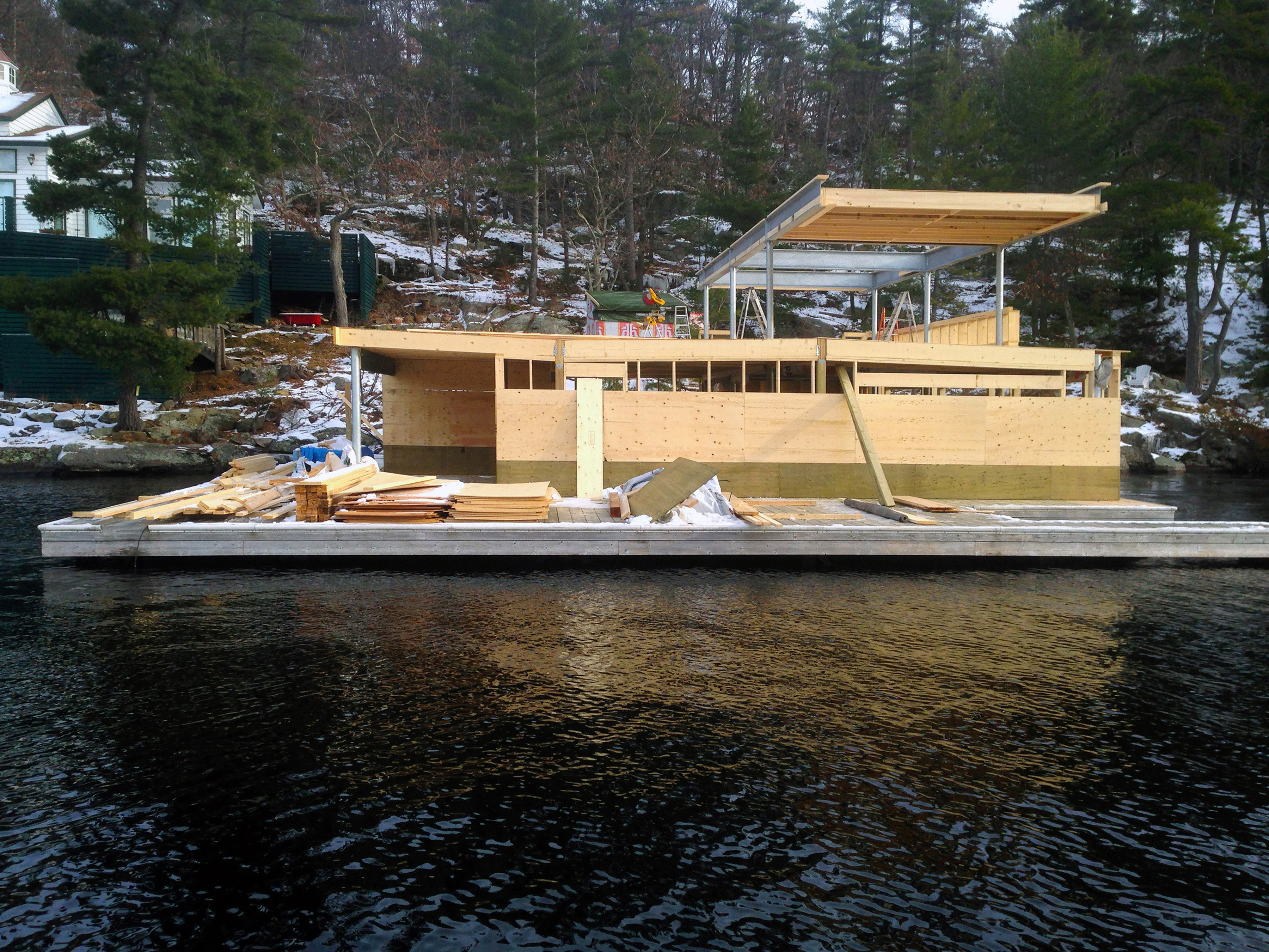 We successfully provided enclosure for three boat slips, adequate deck space for access to the water, and a second-floor enclosed space comprised of a living area, bathroom, bedroom, and small kitchenette. What is not apparent is the structural steel pilings extending to the granite lake bottom.