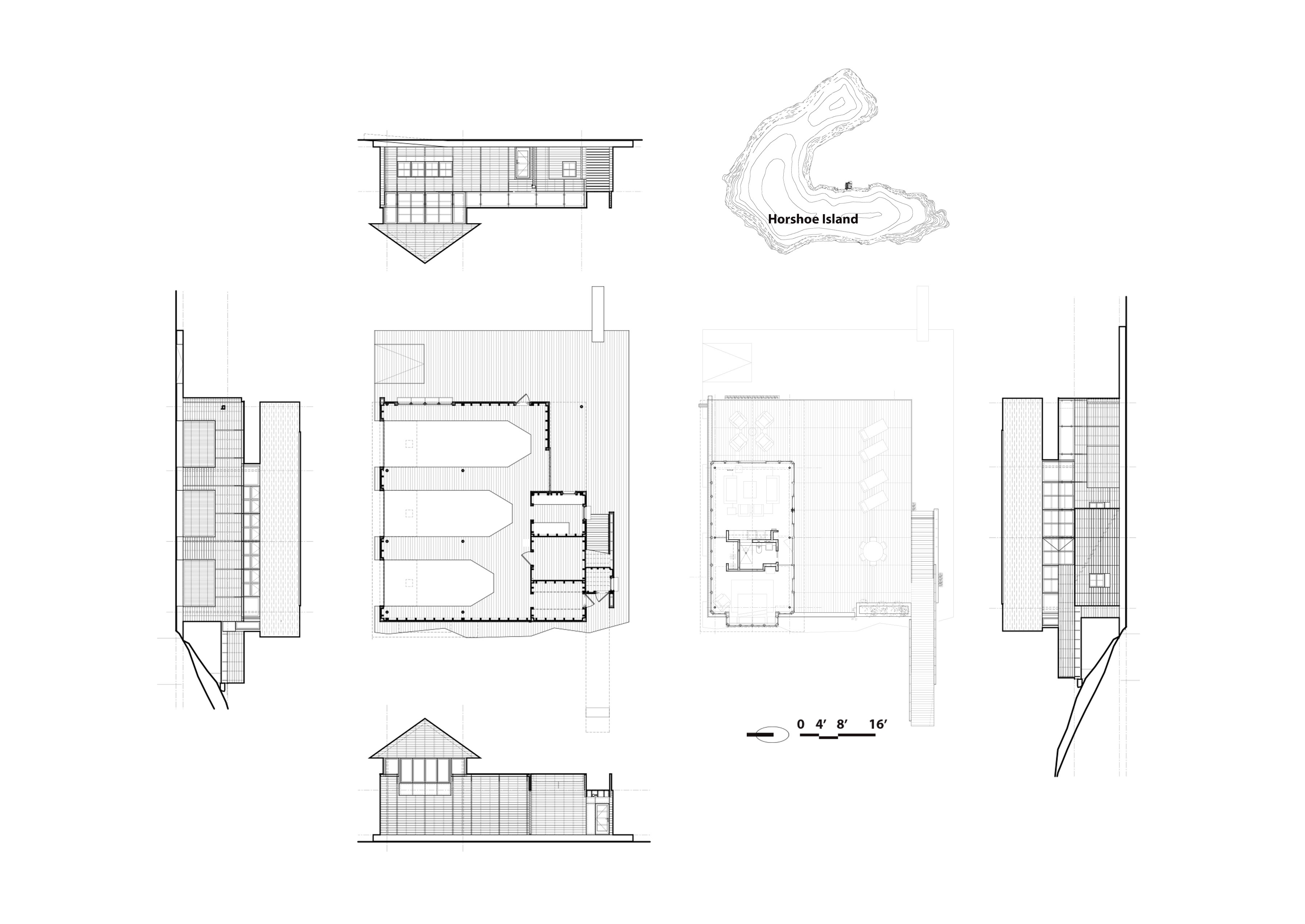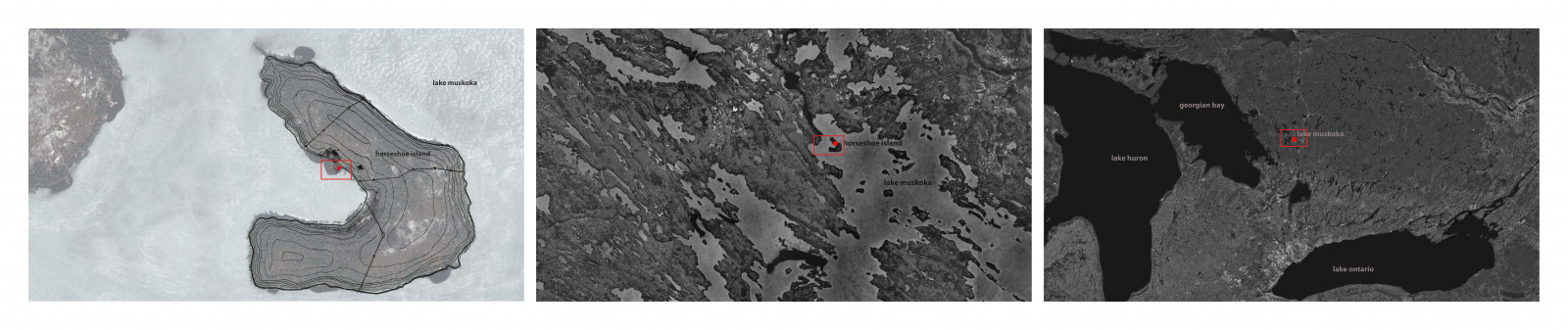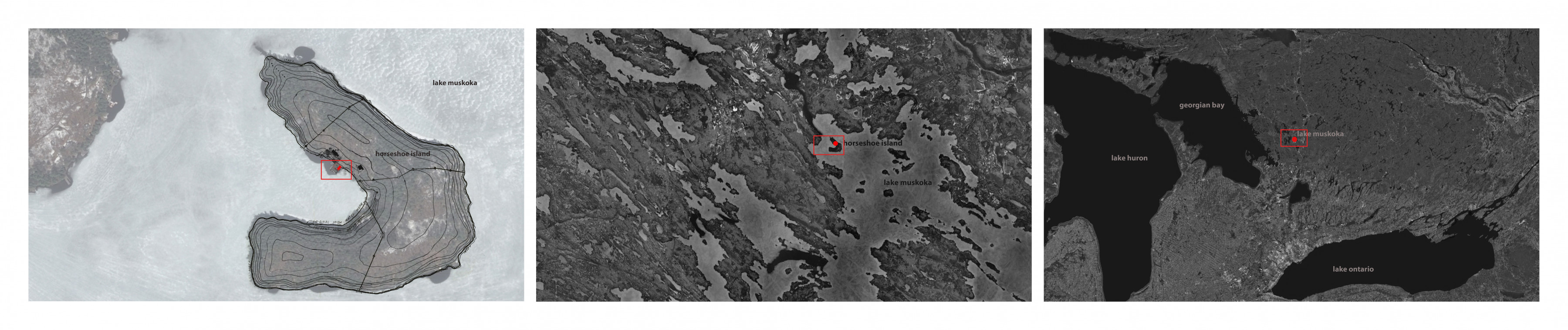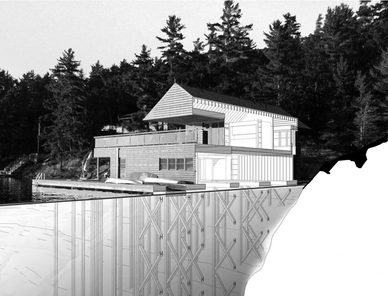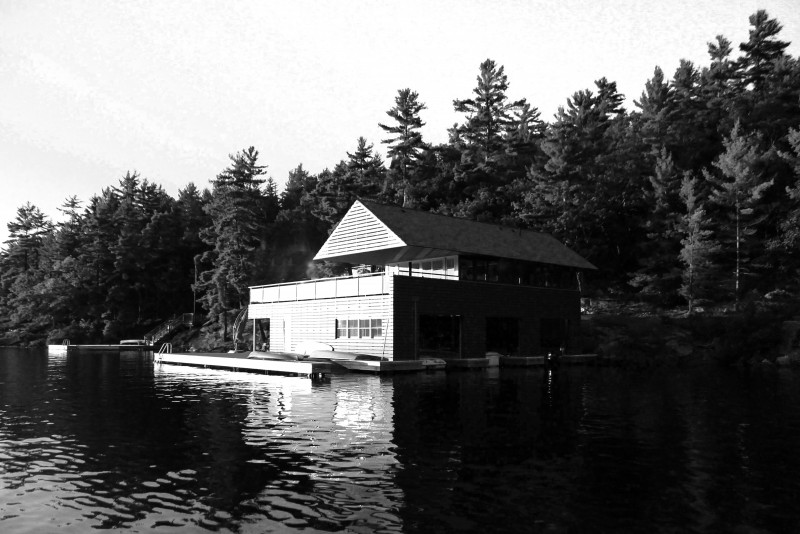 With an existing cottage on Horseshoe Island in Lake Muskoka, Ontario, the client for this project asked us to design a three-slip boathouse on the water with small living accommodations above. This typology is prevalent on the lake, as the rocky shoreline makes it difficult to remove boats from the water. The historical solution has been to construct private “boat garages” on the water, and to pair the garage with living, entertaining, and sleeping spaces above, resulting in a kind of boat-coach house. We used modern finishes and creative architectural solutions to deliver a contemporary version of the vernacular Lake Muskoka boat house.