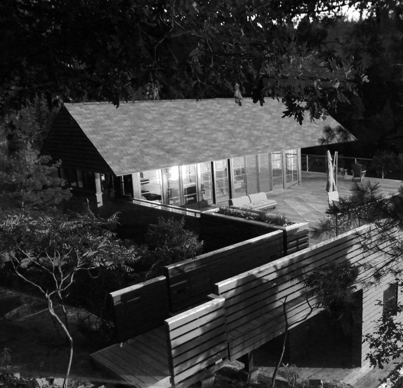 The project site, located on a 5-acre wooded parcel on an island in the middle of a lake two hours north of Toronto, presented some challenges to the building team. The first, driving the steel pilings into the bedrock just to support the deck and structure above, took an entire summer. The steel columns were boated in and a floating crane was used to set the steel. Construction took place during the winter months, after the lake was frozen solid enough to support snowmobiles, which pulled sleds full of lumber and building materials to the construction site.