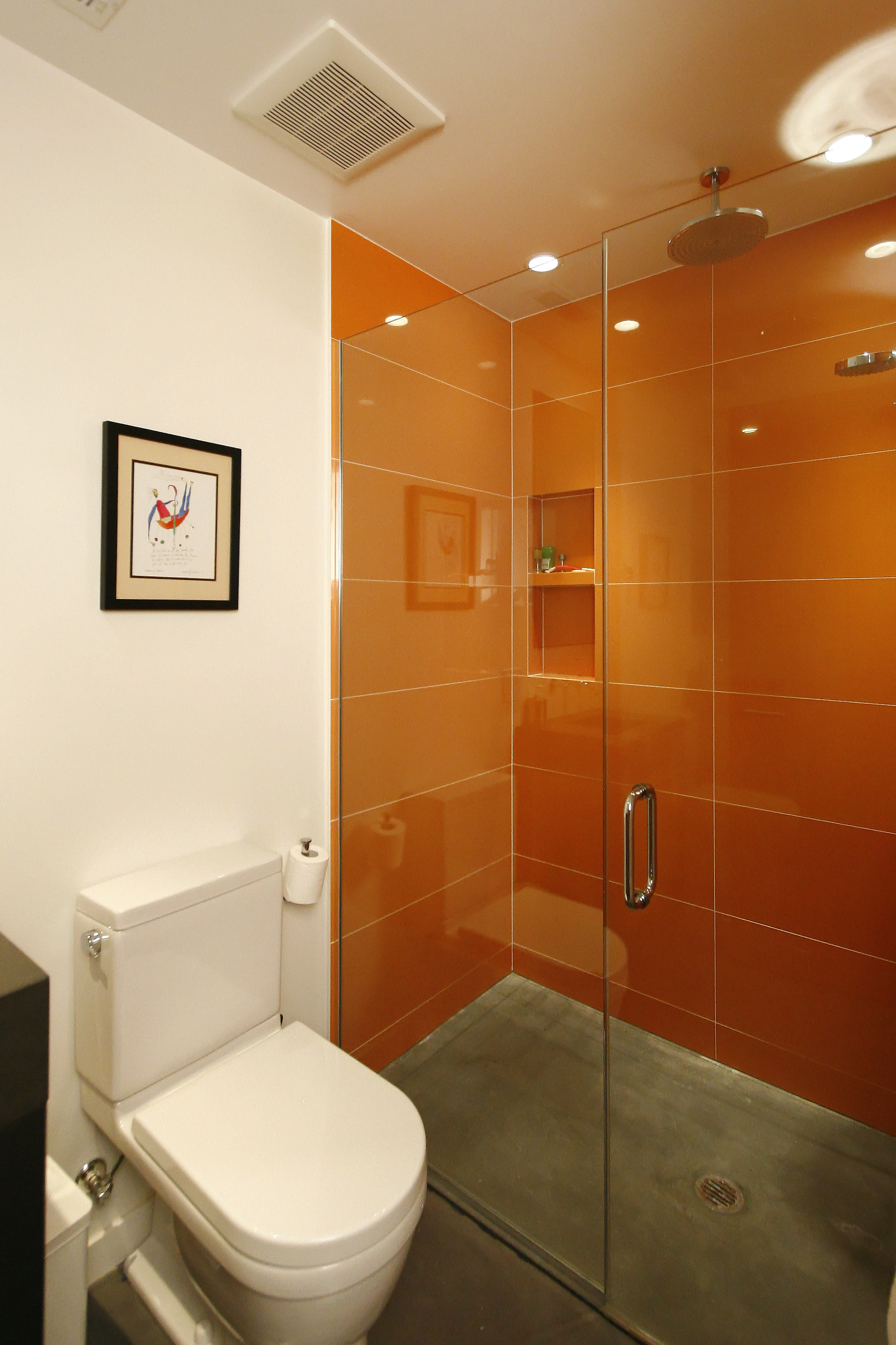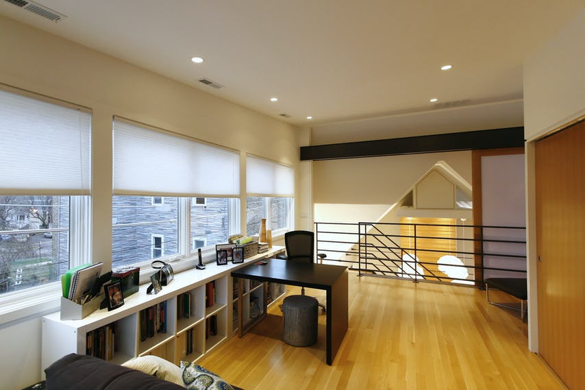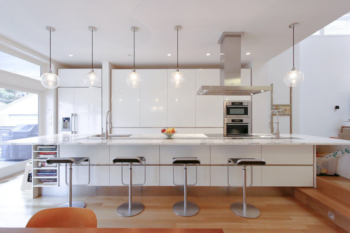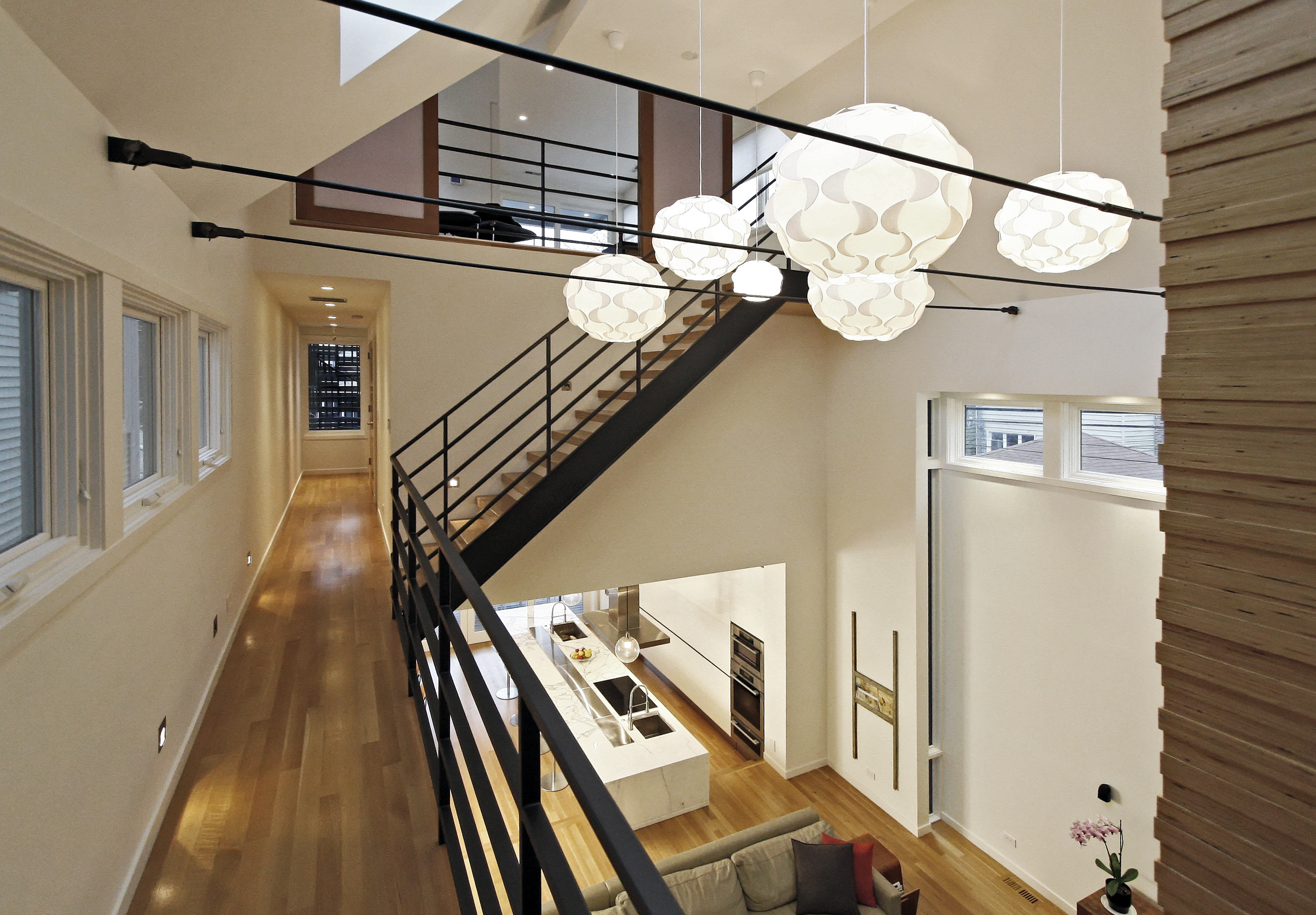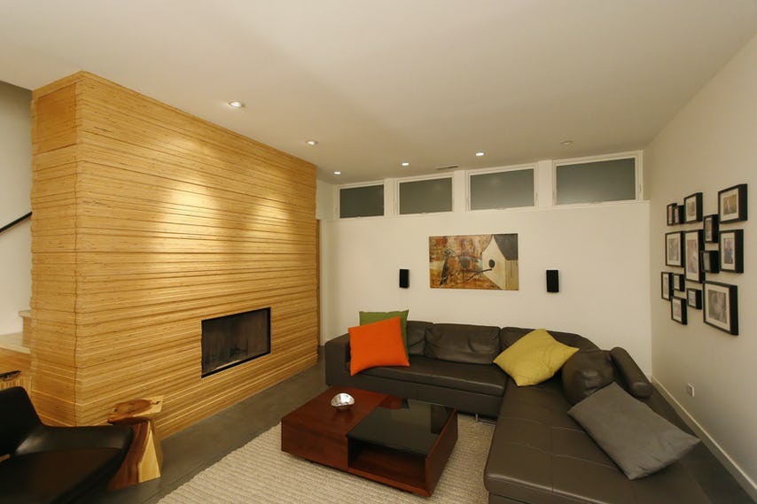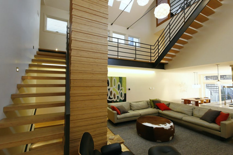 The contractor/developer cleverly applied engineered laminated lumber, typically used for structural purposes only, to the stair and fireplace surround. Ripping the beam into strips and applying a clearcoat finish delivers a honey-toned wood warmth to the space and gives the house a visual through-line.