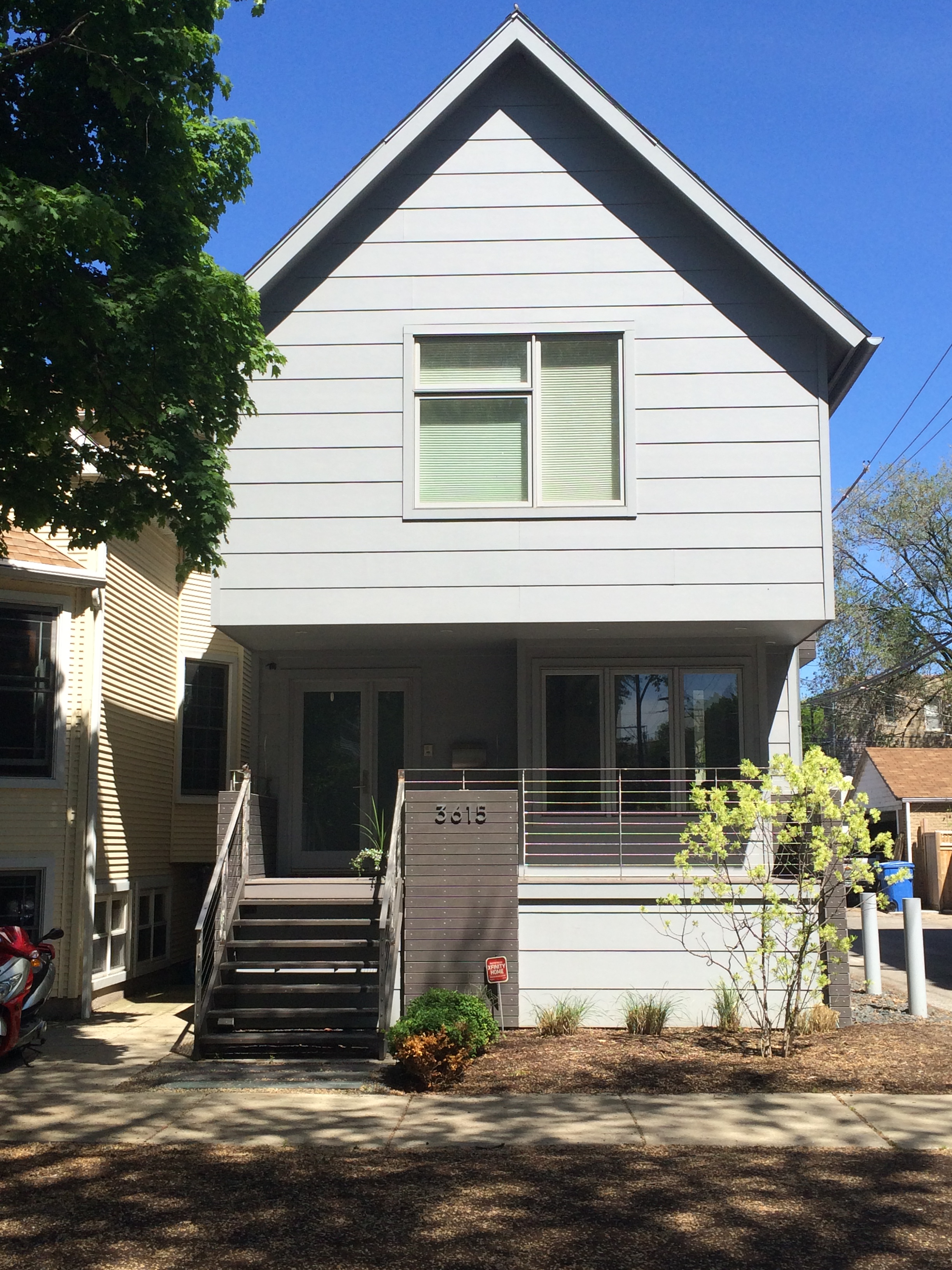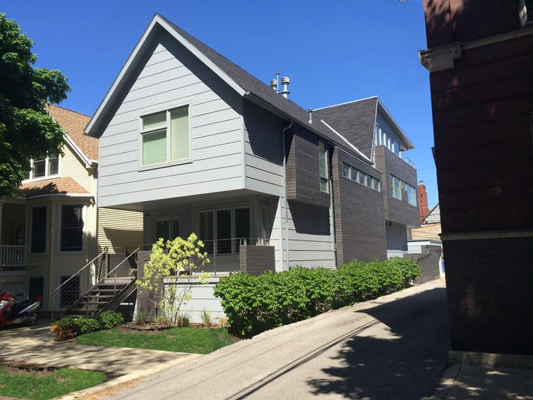 The covered front porch, a traditional element in northern Chicago neighborhoods, appears here without the typical roof-supporting columns — an effect achieved by cantilevering the second floor.