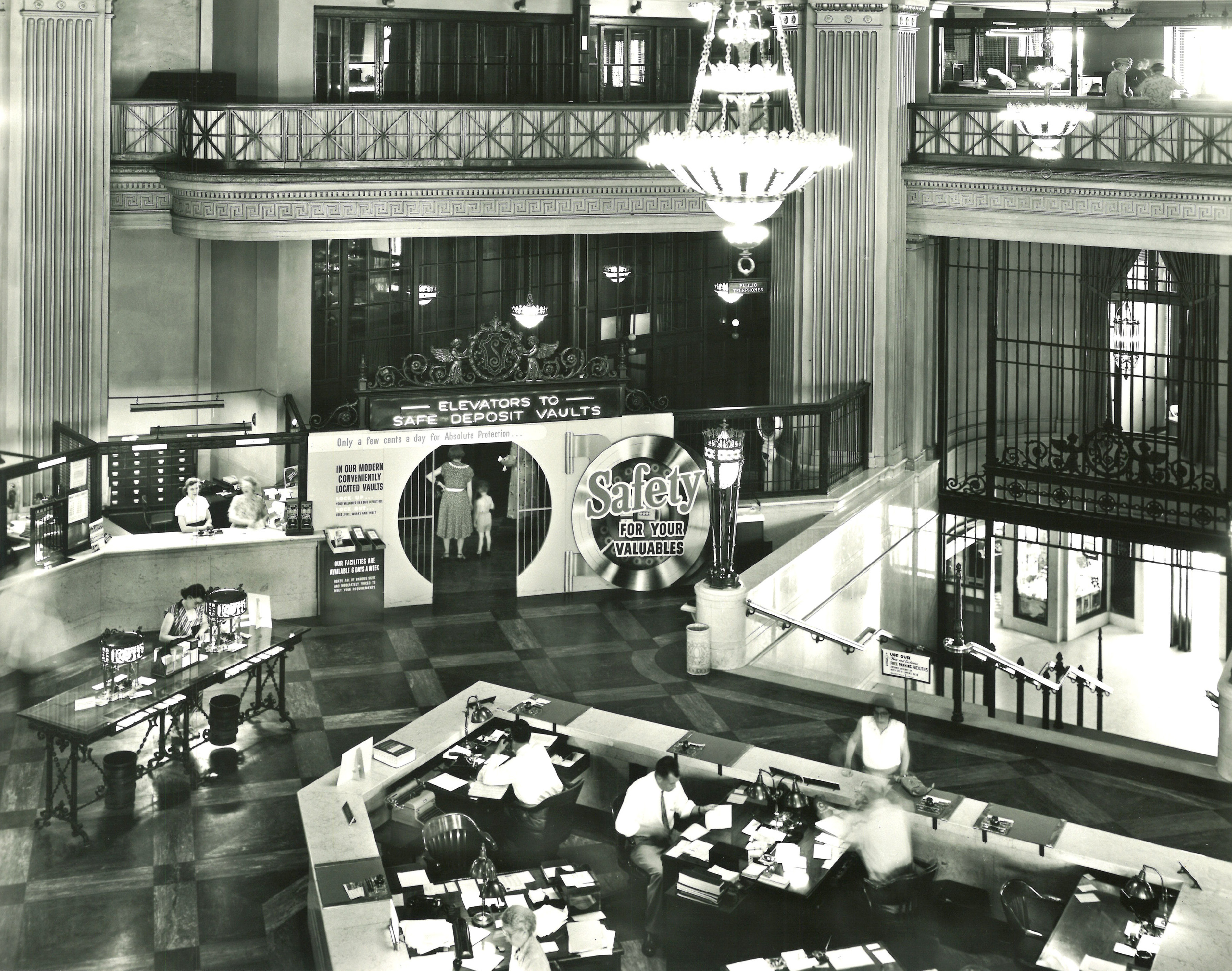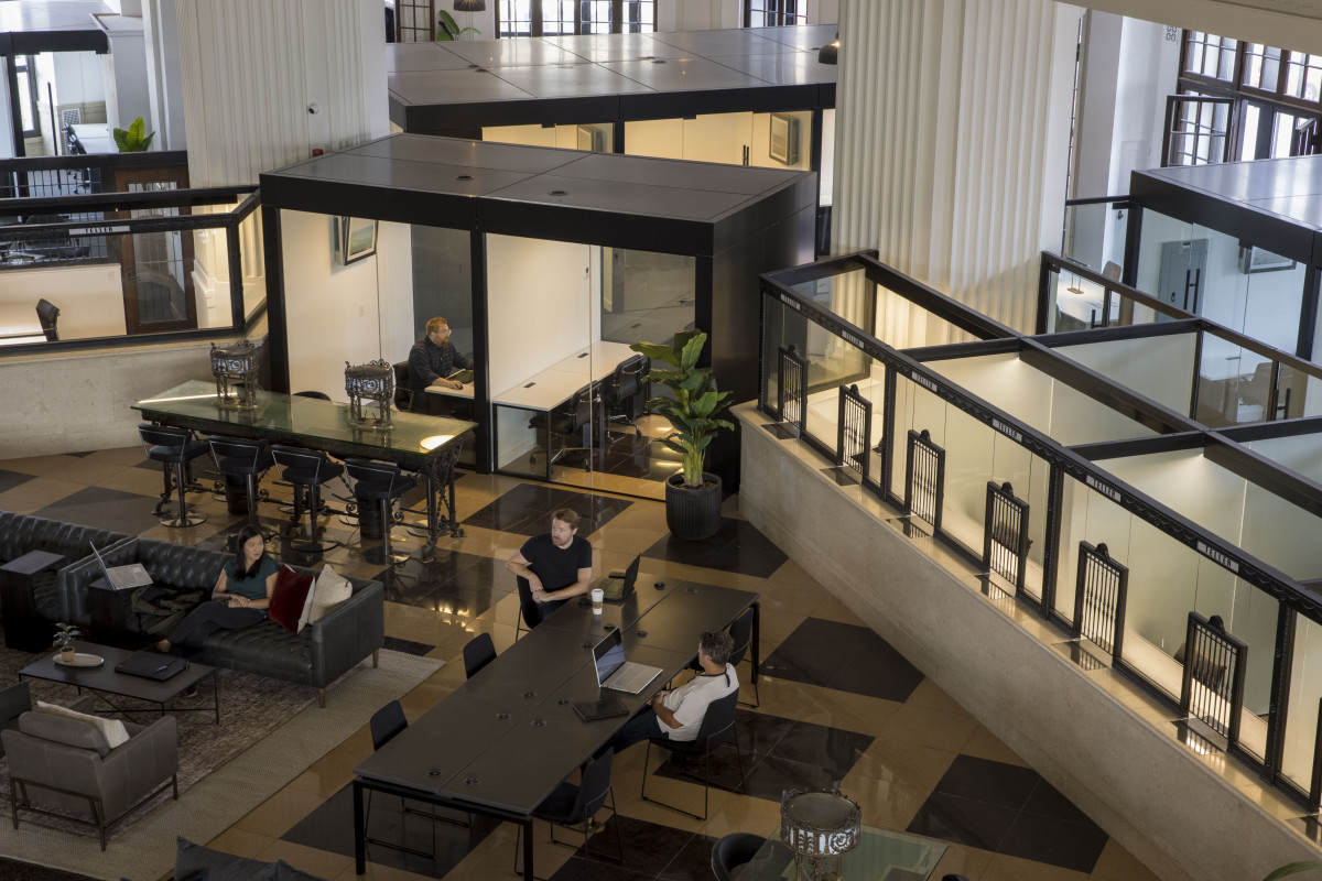 The historic banking hall is now a co-working space. The main hall area has hot-desks and lounge space, with assigned workspaces located behind what were once the teller windows.