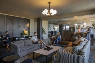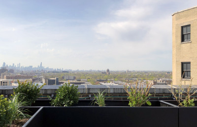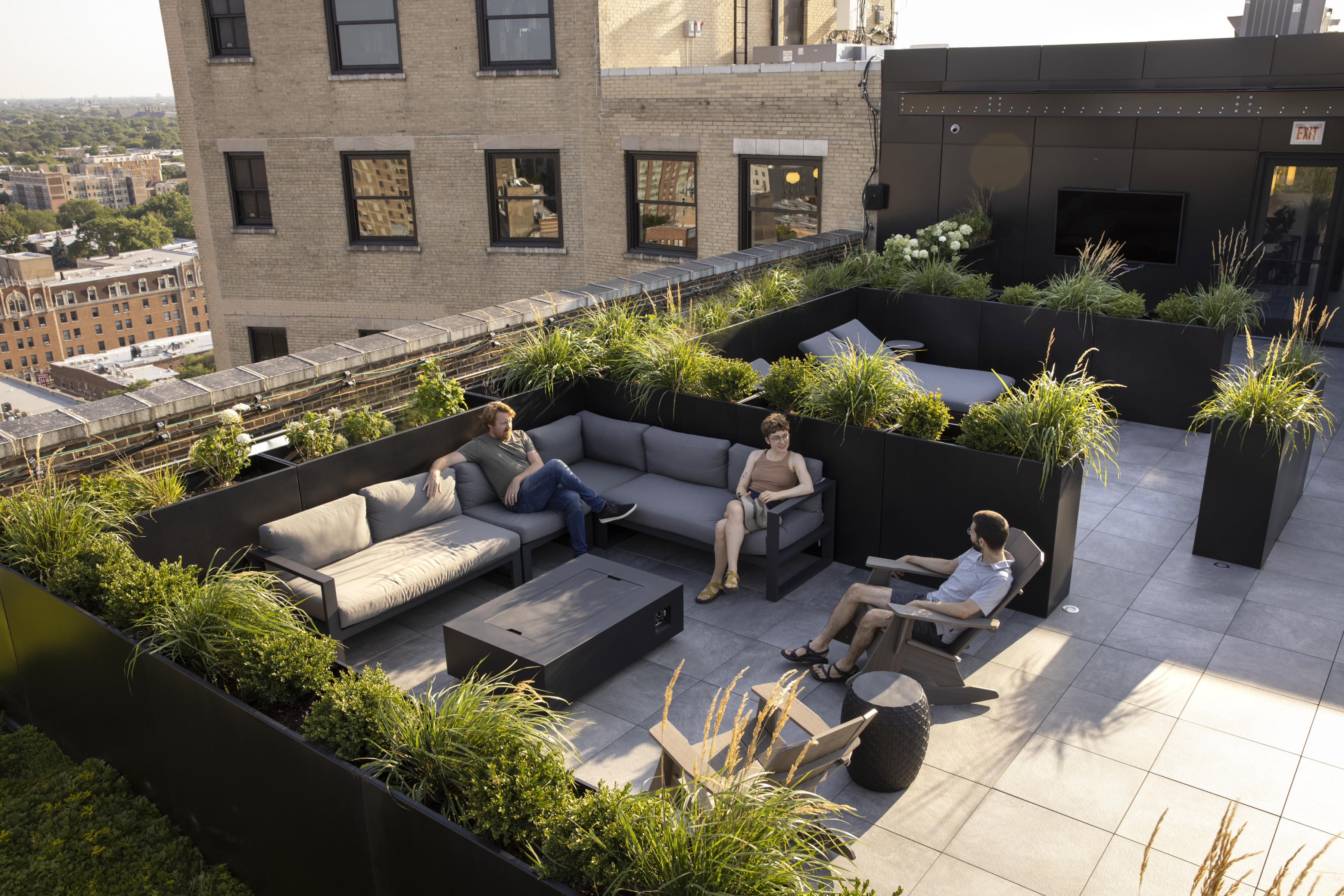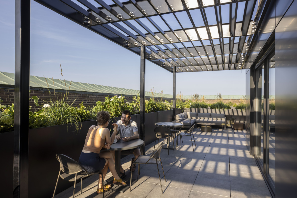The roof lounge, for residential tenant use, combines an existing penthouse with a new addition and opens up to the roof deck.