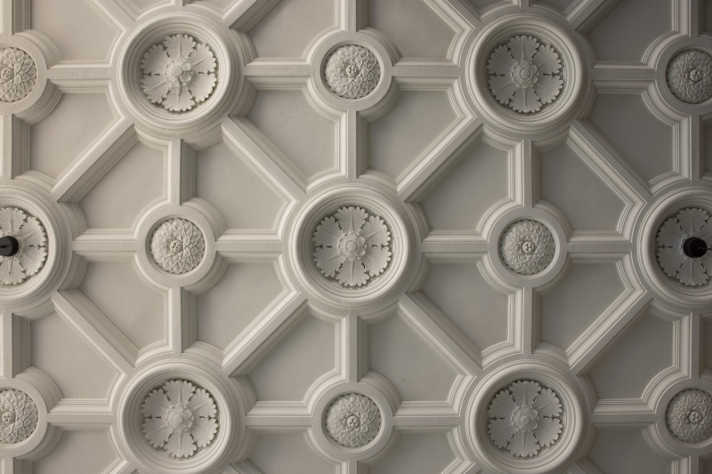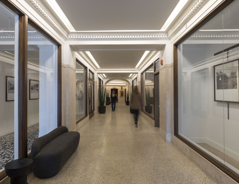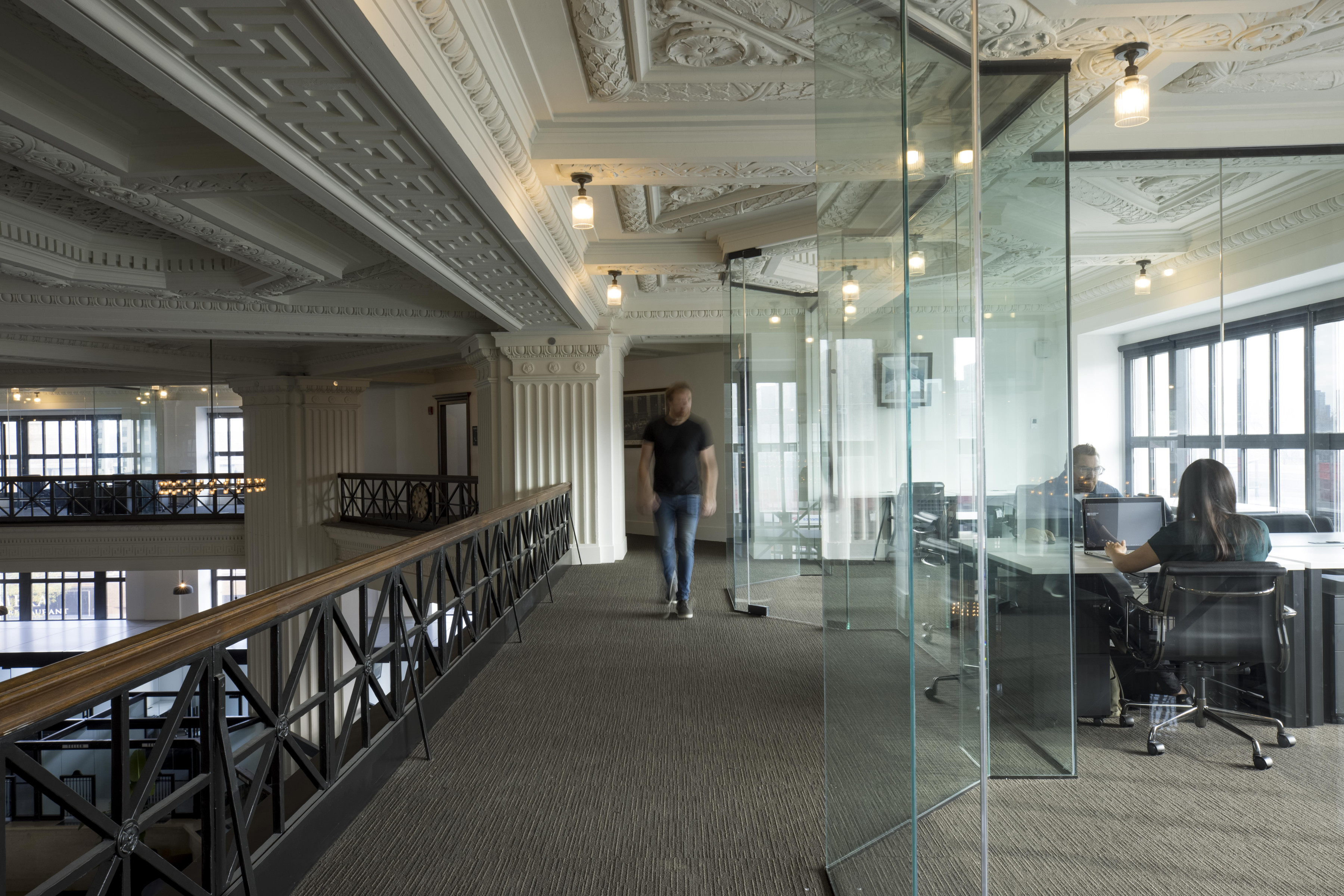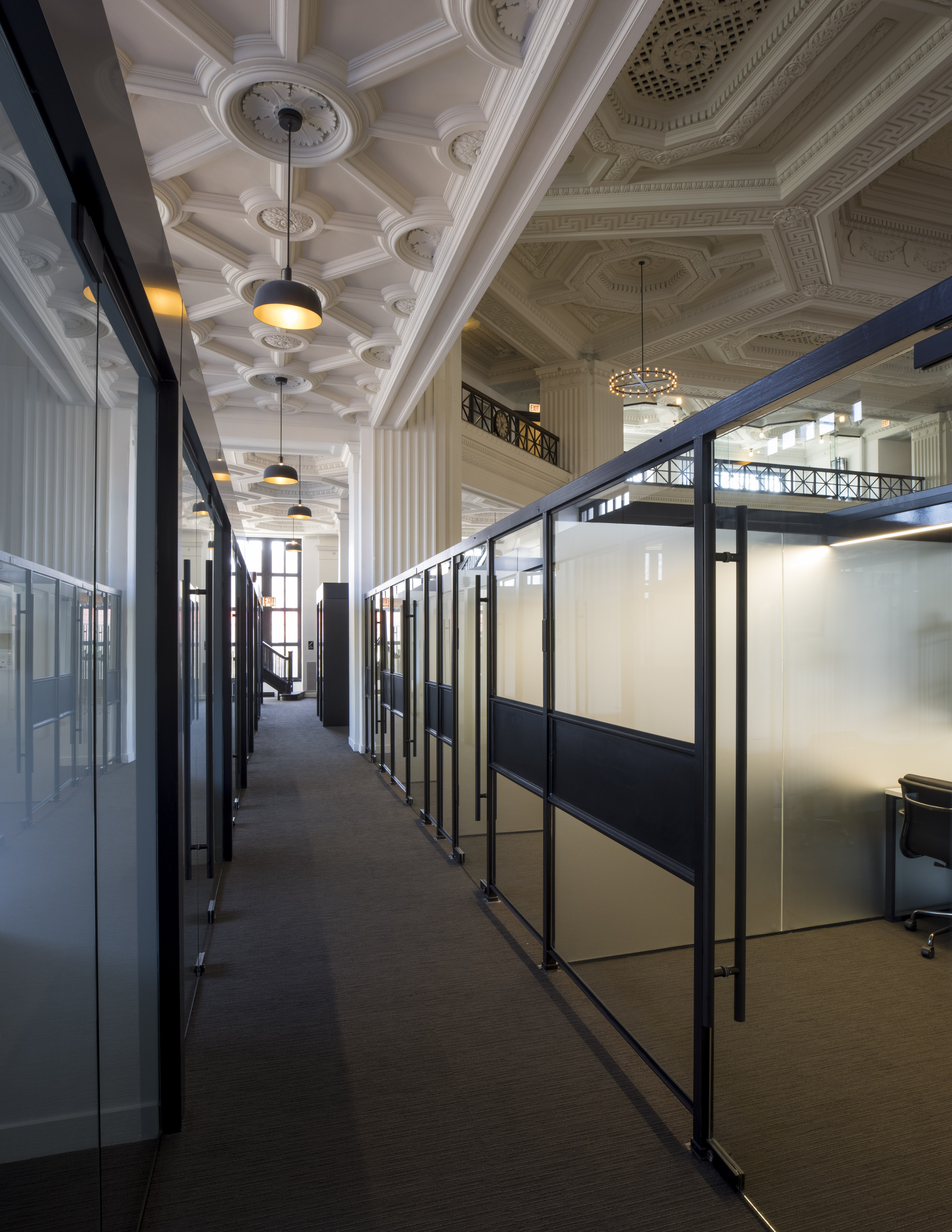 Modern office modules are carefully inserted into the existing architectural fabric in order to defer attention to the beautiful coffered ceiling and other historic details.