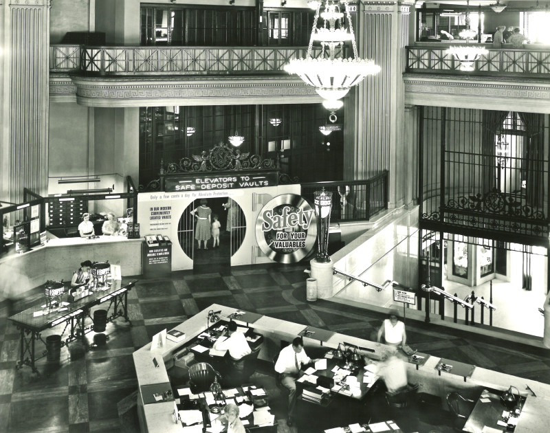 The banking hall, located on the building’s second floor and accessed via a grand staircase, is an exemplary classic Beaux Arts banking hall and retains much of its original detail and ornament. The upper nine floors originally contained private offices of varying sizes. In the 1960s and 1970s, the building attracted many non-profits and community-based organizations drawn to the cheap rent and like-minded tenants. By 2018, the office occupancy had dwindled to a fraction of its capacity, and the banking hall had long ceased operation.
