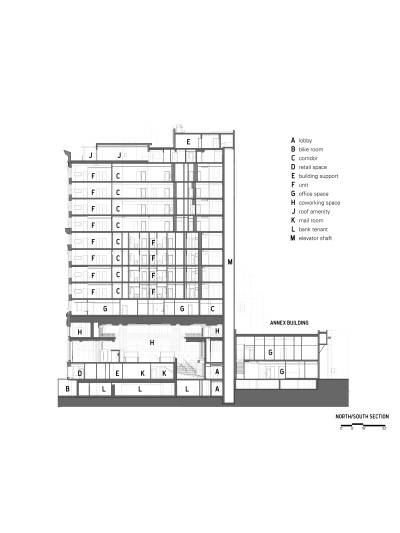 The ground floor contains space for retail and commercial tenants, some of whom existed in the building before its renovation.