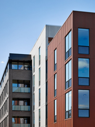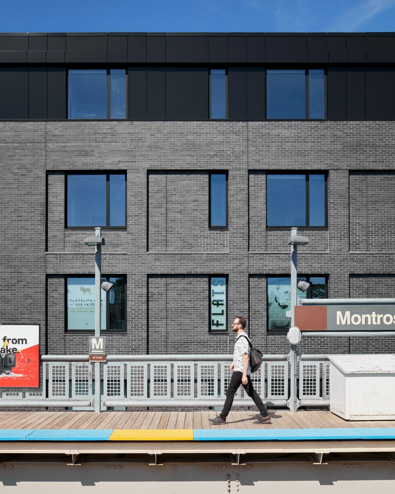 Designed to attract the young, urban, and design-savvy, this 38-unit apartment building is located at the corner of Honore and Montrose Avenue, immediately adjacent to the Montrose Avenue Brown Line Station. The project consists of one- and two-bedroom units averaging 800 square feet, and provides over 5,000 square feet of leasable retail and restaurant space. Drawing inspiration from the iconic Chicago "EL" trains and the remaining manufacturing structures in the area, the building is clad in various metal and brick textures, as if the building were constructed over time, like a small village.