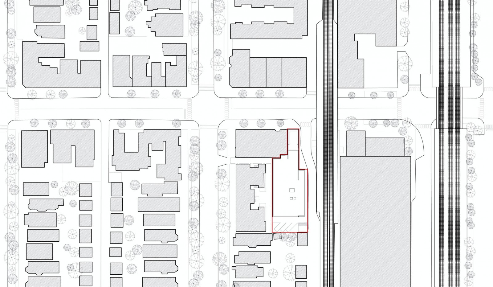 The site plan illustrates the unique configuration of the site, with most of the area located at the back relative to presence and exposure on Montrose Avenue. This presented several design challenges, but also gave us the opportunity to address the El platform with a long, architecturally interesting façade.