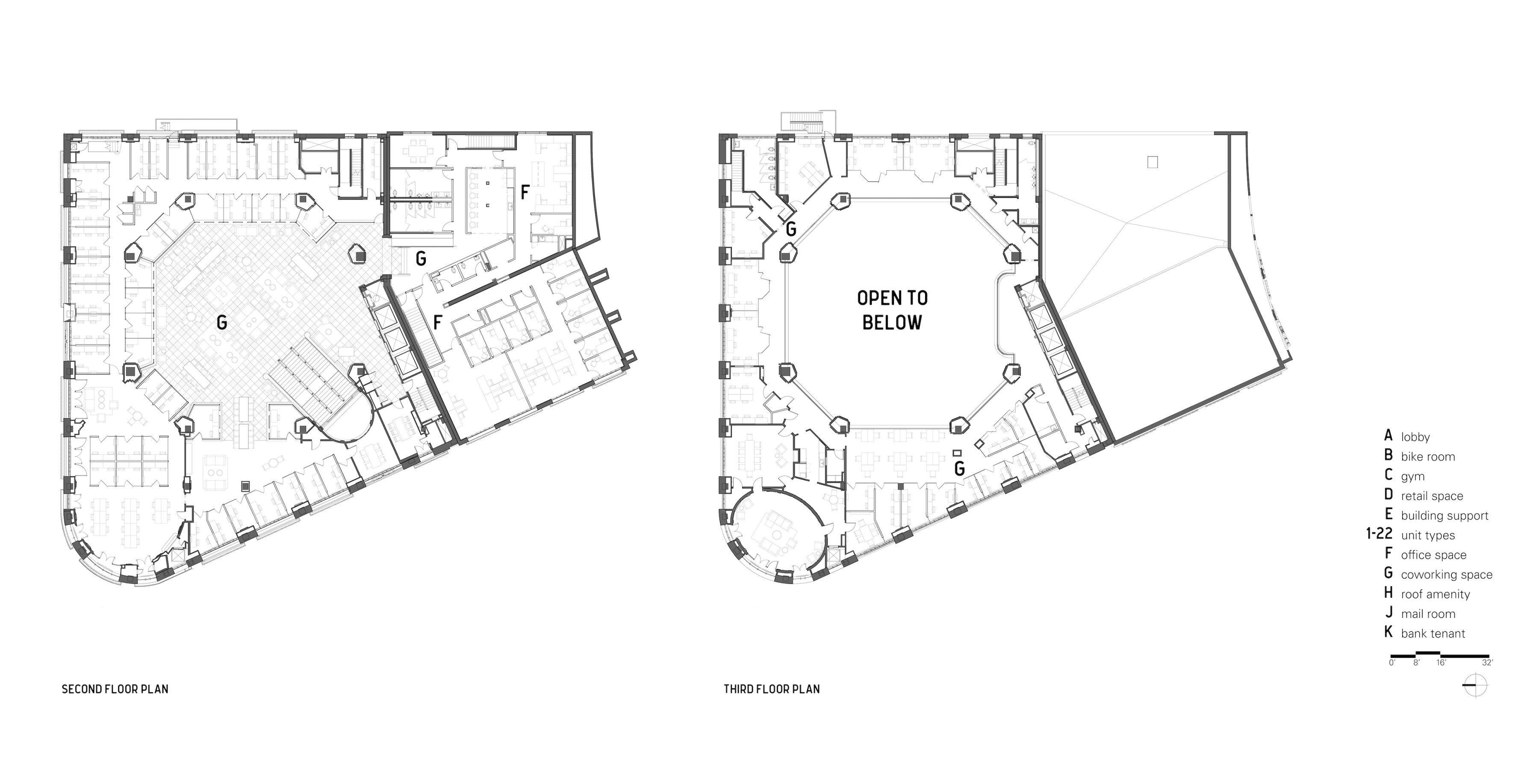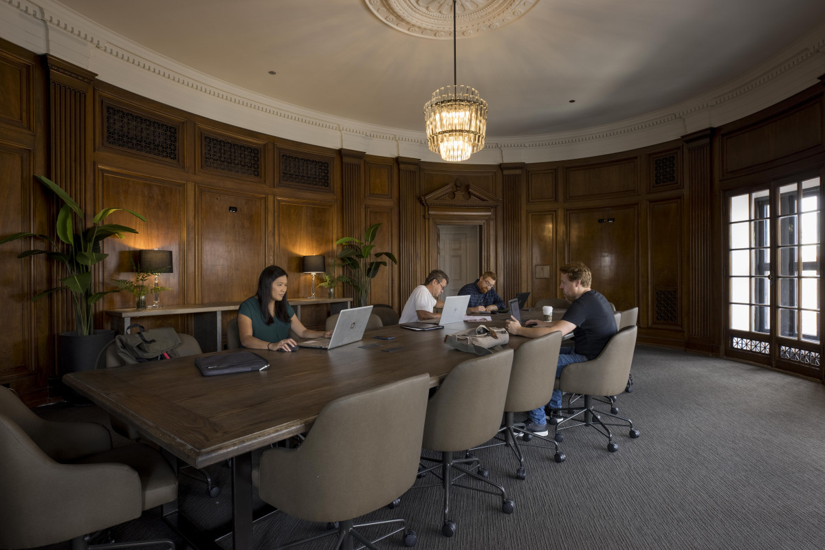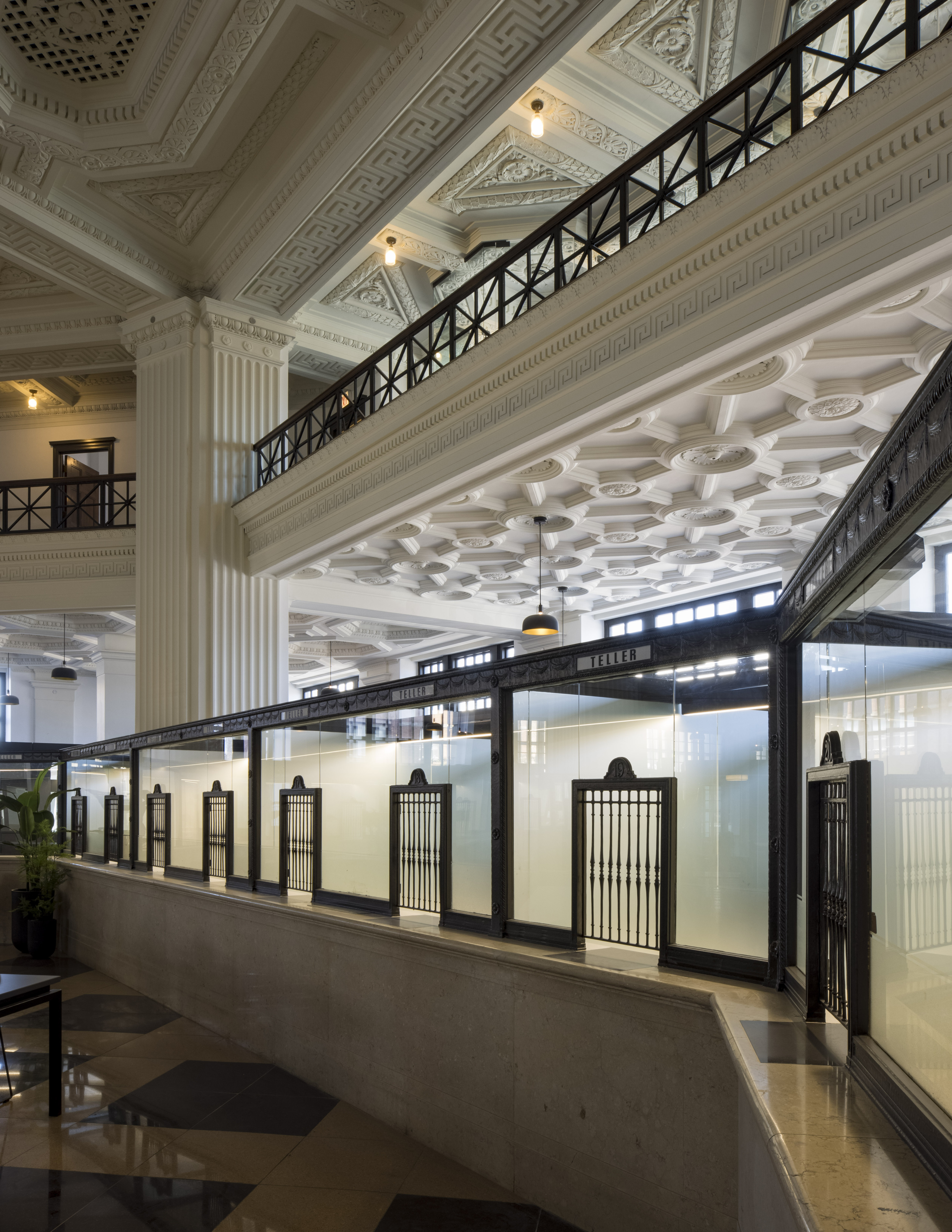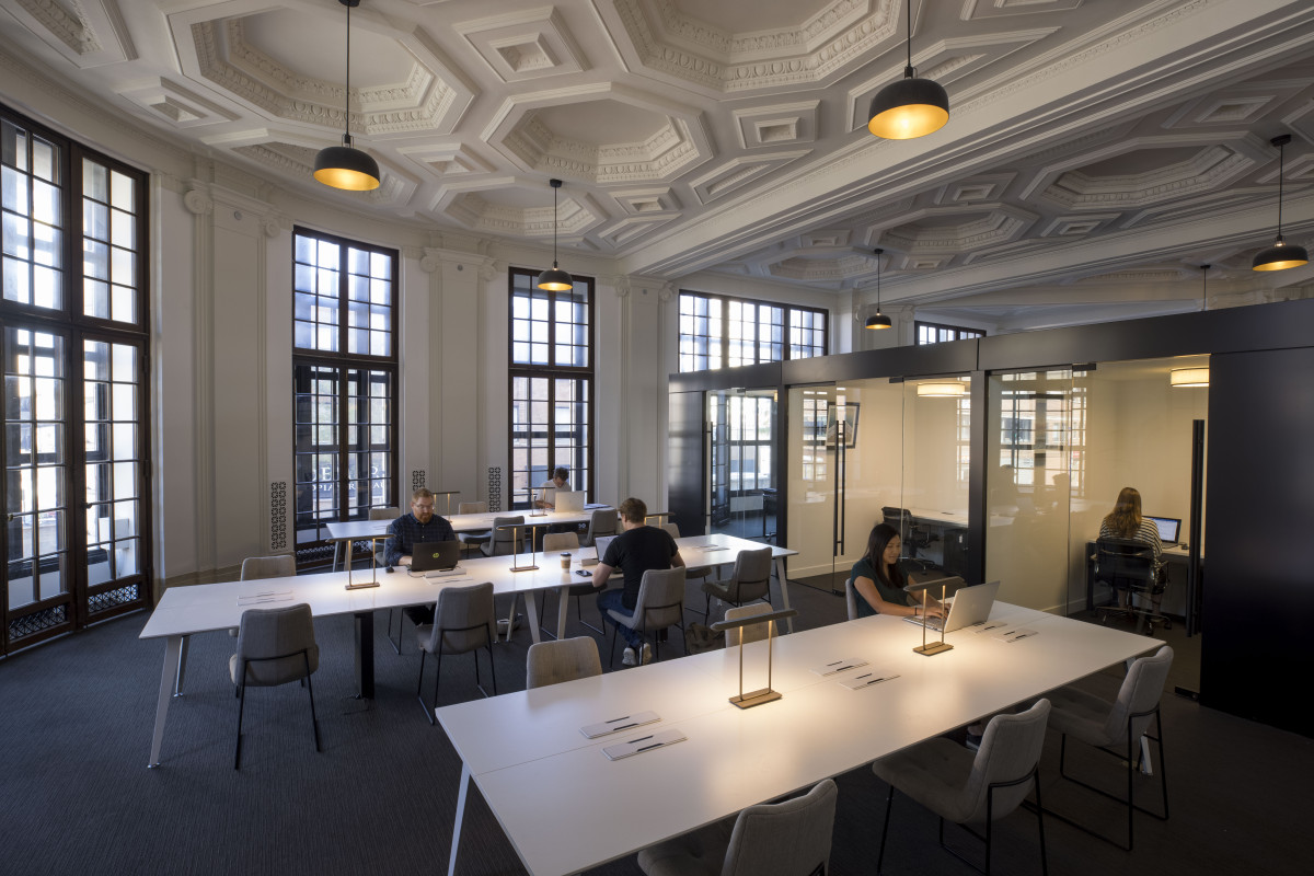 The enclosed coworking offices are intentionally differentiated as modern insertions within the historic fabric of the two-story landmarked banking hall.